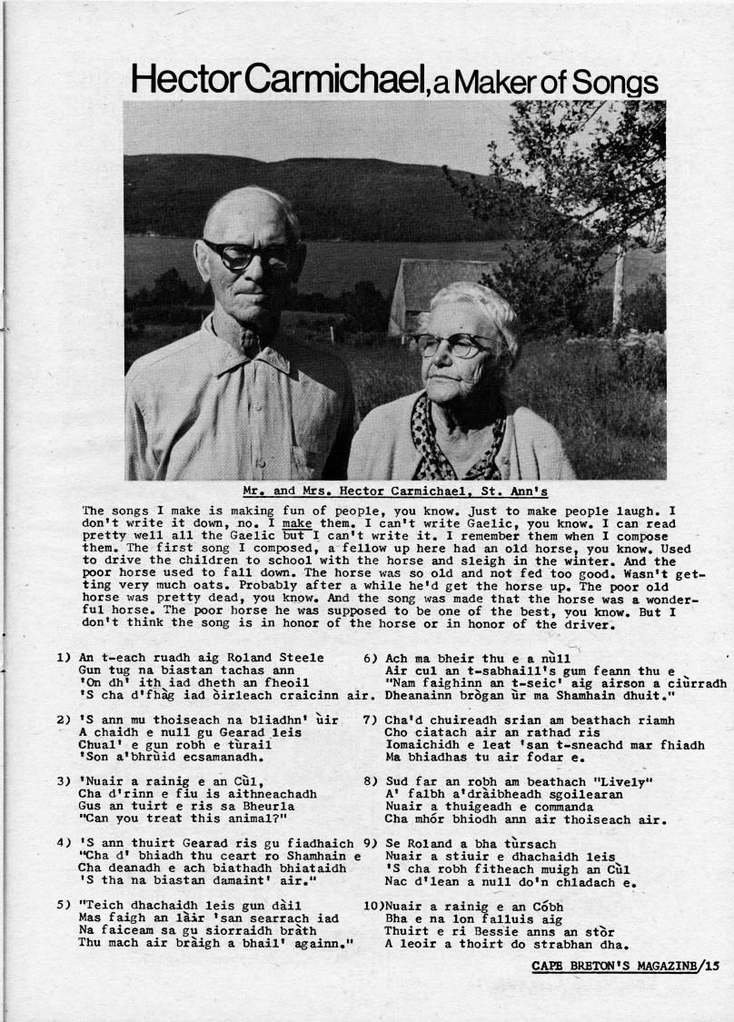 Published by Ronald Caplan on 1974/3/1 (5992 reads)Hector CarmichaeU Maker of Songs The songs I make is making fun of people, you know. Just to make people laugh. I don't write it down, no. I make them. I can't write Gaelic, you know. I can read pretty well all the Gaelic but I can't write it. I remember them when I compose them. The first song I composed, a fellow up here had an old horse, you know. Used to drive the children to school with the horse and sleigh in the winter. And the poor horse used to fall down. The horse was so old and not fed too good. Wasn't get? ting very much oats. Probably after a while he'd get the horse up. The poor old horse was pretty dead, you know. And the song ivas made that the horse was a wonder? ful horse. The poor horse he was supposed to be one of the best, vou know. But I don't think the song is in honor of the horse or in honor of the driver. 1) An t-each ruadh aig Roland Steele Gun tug na blastan tachas ann 'On dh' ith'iad dheth an fheoil "Nam faighinn an t-seic' aig airson a ciurradh 'S cha d'fhag iad oirleach craicinn air. Dheanainn brogan ur ma Shamhain dhuit." 6) Ach ma bheir thu e a null Air cul an t-sabhaill's gum feann thu e 2) 'S ann mu thoiseach na bliadhn* uir A chaidh e null gu Gearad leis Chual' e gun robh e turail • Son a'bhruid ecsamanadh. 3) 'Nuair a rainig e an Cul, Cha d'rinn e fiu is aithneachadh Gus an tuirt e ris sa Bheurla "Can you treat this animal?" 7) Cha'd chuireadh srian am beathach riamh Cho ciatach air an rathad ris lomaichidh e leat 'san t-sneachd mar fhiadh Ma bhiadhas tu air fodar e. 8) Sud far an robh am beathach "Lively" A' falbh a'draibheadh sgoilearan Nuair a thuigeadh e commanda Cha mhor bhiodh ann air thoiseach air. 4) ??S ann thuirt Gearad ris gu fiadhaich 9) Se Roland a bha tursach • • Cha d' bhiadh thu ceart ro Shamhain e Nuair a stiuir e dhachaidh leis Cha deanadh e ach biathadh bhiataidh ?S cha robh fitheach muigh an Cul 'S tha na blastan damaint' air." Nac d'lean a null do'n chladach e. 5) "Teich dhachaidh leis gun dail Mas faigh an lair 'san searrach iad Na faiceam sa gu siorraidh brath Thu mach air braigh a bhail' againn." 10)Nuair a rainig e an Cobh Bha e na Ion falluis aig Thuirt e ri Bessie anns an stor A leoir a thoirt do strabhan dha. CAPE BRETON'S MAGAZINE/15