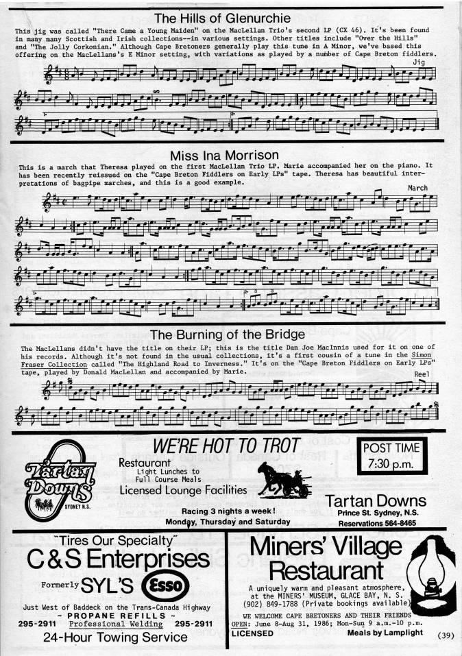 Published by Ronald Caplan on 1986/6/1 (356 reads)The Hills of Glenurchie This jig was called "There Came a Young Maiden" on the MacLellan Trio's second LP (CX 46). It's been found in many many Scottish and Irish collections • in various settings. Other titles include "Over the Hills" and "The Jolly Corkonian." Although Cape Bretoners generally play this tune in A Minor, we've based this offering on the MacLellans's E Minor setting, with variations as played by a number of Cape Breton fiddlers. Jig pv> pallet Jin:jjjiJ7''i';7iiJ'r fiiu''T''' tj J Ui 1 ' '' kj' Li uLJ j * ' * j i"" LU Lij • " * Miss Ina Morrison This is a march that Theresa played on the first MacLellan Trio LP. Marie accompanied her on the piano. It has been recently reissued on the "Cape Breton Fiddlers on Early LPs" tape. Theresa has beautiful inter? pretations of bagpipe marches, and this is a good example. March u-fLlL;ir uUJ'' ' '*'''uiJ{J:JWUi!'jiiUii'l ** LMtoUr/ir [/[tlfi' ' ' i''[j:ji[??r[iEjii' 'l[' The Burning of the Bridge The MacLellans didn't have the title on their LP; this is the title Dan Joe Maclnnis used for it on one of his records. Although it's not found in the usual collections, it's a first cousin of a tune in the Simon Fraser Collection called "The Highland Road to Inverness." It's on the "Cape Breton Fiddlers on Early LPs" tape, played by Donald MacLellan and accompanied by Marie. n -. WE'RE HOT TO TROT Restaurant Light Lunches to Full Course Meals Licensed Lounge Facilities Racing 3 nights a week! Monday, Thursday and Saturday I POST TIME 7;30 p.m. Tartan Downs Prince St Sydney, N.S. Reservations 564-8465 'Tires Our Specialty" C&S; Enterprises Just West of Baddeck on the Trans-Canada Highway ~ PROPANE REFILLS - 295-2911 Professional Welding 295-2911 24-Hour Towing Service Miners' Village Restaurant A uniquely warm and pleasant atmosphere, at the MINERS' MUSEUM, GLACE BAY, N. S. (902) 849-1788 (Private bookings available WE WELCOME CAPE BRETONERS AND THEIR FRIENDS OPEN; June 8-Aug 31, 1986; Mon-Sun 9 a.m.-10 p.m. LICENSED Meals by Lamplight (39)