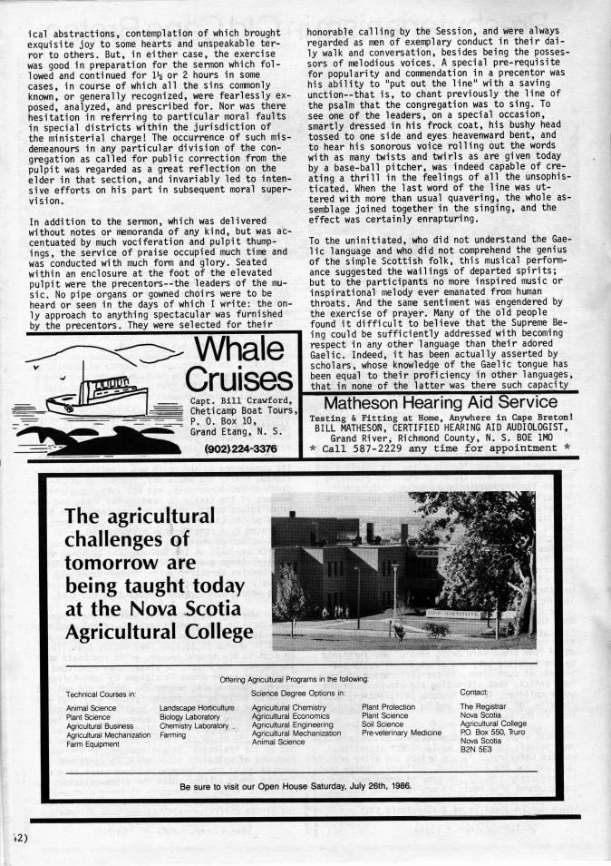 Published by Ronald Caplan on 1986/6/1 (293 reads)leal abstractions, contemplation of which brought exquisite joy to some hearts and unspeakable ter? ror to others. But, in either case, the exercise was good in preparation for the sermon which fol? lowed and continued for Ih or 2 hours in some cases, in course of which all the sins commonly known, or generally recognized, were fearlessly ex? posed, analyzed, and prescribed for. Nor was there hesitation in referring to particular moral faults in special districts within the jurisdiction of the ministerial charge! The occurrence of such mis? demeanours in any particular division of the con? gregation as called for public correction from the pulpit was regarded as a great reflection on the elder in that section, and invariably led to inten? sive efforts on his part in subsequent moral super? vision. In addition to the sermon, which was delivered without notes or memoranda of any kind, but was ac? centuated by much vociferation and pulpit thump- ings, the service of praise occupied much time and was conducted with much form and glory. Seated within an enclosure at the foot of the elevated pulpit were the precentors • the leaders of the mu? sic. No pipe organs or gowned choirs were to be heard or seen in the days of which I write: the on? ly approach to anything spectacular was furnished by the precentors. They were selected for their Whale Cruises Capt. Bill Crawford, Cheticamp Boat Tours, P. 0. Box 10, Grand Etang, N. S. (902X224-3376 honorable calling by the Session, and were always regarded as men of exemplary conduct in their dai? ly walk and conversation, besides being the posses? sors of melodious voices. A special pre-requisite for popularity and commendation in a precentor was his ability to "put out the line" with a saving unction • that is, to chant previously the line of the psalm that the congregation was to sing. To see one of the leaders, on a special occasion, smartly dressed in his frock coat, his bushy head tossed to one side and eyes heavenward bent, and to hear his sonorous voice rolling out the words with as many twists and twirls as are given today by a base-ball pitcher, was Indeed capable of cre? ating a thrill in the feelings of all the unsophis? ticated. When the last word of the line was ut? tered with more than usual quavering, the whole as? semblage joined together in the singing, and the effect was certainly enrapturing. To the uninitiated, who did not understand the Gae? lic language and who did not comprehend the genius of the simple Scottish folk, this musical perform? ance suggested the wailings of departed spirits; but to the participants no more inspired music or inspirational melody ever emanated from human throats. And the same sentiment was engendered by the exercise of prayer. Many of the old people found it difficult to believe that the Supreme Be? ing could be sufficiently addressed with becoming respect in any other language than their adored Gaelic. Indeed, it has been actually asserted by scholars, whose knowledge of the Gaelic tongue has been equal to their proficiency in other languages, that in none of the latter was there such capacity Matheson Hearing Aid Service Testing & Fitting at Home, Anywhere in Cape Breton! BILL MATHESON, CERTIFIED HEARING AID AUDI0L06IST, Grand River, Richmond County, N. S. BOE IMO "' Call 587-2229 any time for appointment * The agricultural challenges of tomorrow are being taught today at the Nova Scotia Agricultural College .'.?wi%'i' ??4=''',;''-''- ' -W''." 'i''''''''f''''' Technical Courses in: Animal Science Plant Science Agricultural Business Agricultural Mechanization Farm Equipment Offering Agricultural Programs in the following: Science Degree Options in: Landscape Horticulture Biology Laboratory Chemistry Laboratory Farming Agricultural Chemistry Agricultural Economics Agricultural Engineering Agricultural Mechanization Animal Science Plant Protection Plant Science Soil Science Pre-veterinary Medicine Contact: The Registrar Nova Scotia Agricultural College P.O. Box 550, Truro Nova Scotia B2N 5E3 Be sure to visit our Open House Saturday, July 26th, 1986. ''2)