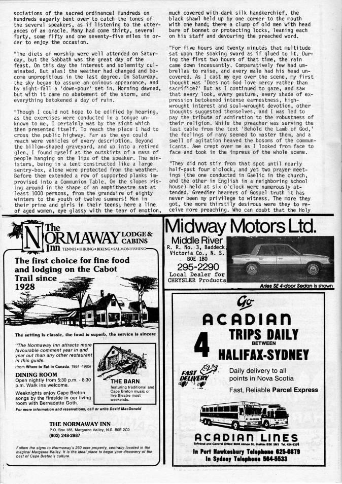 Published by Ronald Caplan on 1986/6/1 (315 reads)sociations of the sacred ordinance! Hundreds on hundreds eagerly bent over to catch the tones of the several speakers, as if listening to the utter? ances of an oracle. Many had come thirty, several forty, some fifty and one seventy-five miles in or? der to enjoy the occasion. "The diets of worship were well attended on Satur? day, but the Sabbath was the great day of the feast. On this day the interest and solemnity cul? minated. But alasl the weather had changed and be? come unpropitious in the last degree. On Saturday, the sky began to assume an ominous appearance, and by night-fall a 'down-pour' set in. Morning dawned, but with it came no abatement of the storm, and everything betokened a day of rain. "Though I could not hope to be edified by hearing, as the exercises were conducted in a tongue un? known to me, I certainly was by the sight which then presented itself. To reach the place I had to cross the public highway. Far as the eye could reach were vehicles of eyery description. Beyond the billow-shaped graveyard, and up into a retired glen, I found myself at the outskirts of a mass of people hanging on the lips of the speaker. The min? isters, being in a tent constructed like a large sentry-box, alone were protected from the weather. Before them extended a row of supported planks im? provised into a Communion Table. On the slopes ris? ing around in the shape of an amphitheatre sat at least 1000 persons, from the grandsire of eighty winters to the youth of twelve summers! Men in their prime and girls in their teens; here a line, of aged women, eye glassy with the tear of emotion. much covered with dark silk handkerchief, the black shawl held up by one corner to the mouth with one hand; there a clump of old men with head bare of bonnet or protecting locks, leaning each on his staff and devouring the preached word. "For five hours and twenty minutes that multitude sat upon the soaking sward as if glued to it. Dur? ing the first two hours of that time, the rain came down incessantly. Comparatively few had um? brellas to raise, and every male had his head un? covered. As I cast my eye over the scene, my first thought was 'Does not God love mercy rather than sacrifice?' But as I continued to gaze, and saw that eyery look, every gesture, eyery shade of ex? pression betokened intense earnestness, high- wrought interest and soul-wrought devotion, other thoughts suggested themselves, and I was led to pay the tribute of admiration to the robustness of their religion. While the preacher was serving the last table from the text 'Behold the Lamb of God,' the feelings of many seemed to master them, and a swell of agitation heaved the bosoms of the commun? icants. Awe crept over me as I looked from face to face and took in the impress of the whole scene. "They did not stir from that spot until nearly half-past four o'clock, and yet two prayer meet? ings (the one conducted in Gaelic in the church, and the other in English in a neighboring school house) held at six o'clock were numerously at? tended. Greedier hearers of Gospel truth it has never been my privilege to witness. The more they got, the more thirstily desirous were they to re? ceive more preachir'g. Who can doubt that the Holy rwil ORMAWAY I nn TENNIS • HIKING • BIKING • SALMON FISHING- LODGE & CABINS The first choice for fine food and lodging on the Cabot Trail since 1928 The setting is classic, the food is superb, the service is sincere "The Normaway Inn attracts more favourable comment year in and year out than any other restaurant in this guide. (fronn Where to Eat In Canada, 1984 -1985) DINING ROOM Open nightly from 5:30 p.m. - 8:30 p.m. Walk ins welcome. Weeknights enjoy Cape Breton songs by the fireside in our living room with Bernadette Goth. For more information and reservations, call or write David MacDonald THE NORMAWAY INN P.O. Box 185, Margaree Valley, N.S. BOE 2C0 (902)248-2987 Follow the signs to Normaway's 250 acre property, centrally located in the magical Margaree Valley. It is the ideal place to begin your discovery of the best of Cape Breton's culture. THE BARN featuring traditional and Cape Breton music or live theatre most weekends. Midway Motors Ltd. Middle River R. R. No. 3, Baddeck Victoria Co., N. S. BOE IBO 295-2290 Local Dealer for CHRYSLER Products Aries SE d-door Sedan is shown AC AD inn 4 TRIPS DAILY BETWEEN HALIFAX-SYDNEY F/IST _, Dally delivery to all points in Nova Scotia Fast, Reliable Parcel Express flcpDinn LinEs TcAninai and CwieralOfficr 6040 Almon St. HailuBSKSMI Ttl. 454-??32