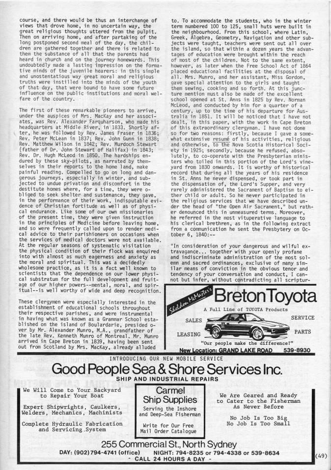 Published by Ronald Caplan on 1986/6/1 (274 reads)course, and there would be thus an interchange of views that drove home, in no uncertain way, the great religious thoughts uttered from the pulpit. Then on arriving home, and after partaking of the long postponed second meal of the day, the chil? dren are gathered together and there is related to them the substance of all that the parents had heard in church and on the journey homewards. This undoubtedly made a lasting impression on the forma? tive minds of the juvenile hearers: in this simple and unostentatious way great moral and religious truths were instilled into the minds of the youth of that day, that were bound to have some future influence on the public institutions and moral wel? fare of the country. The first of these remarkable pioneers to arrive, under the auspices of Mrs. MacKay and her associ? ates, was Rev. Alexander Farquharson, who made his headquarters at Middle River, in 1833. Shortly af? ter, he was followed by Rev. James Fraser in 1836; Rev. Peter McLean in 1837; Rev. John Gunn in 1838; Rev. Matthew Wilson in 1842; Rev. Murdoch Stewart (father of Dr. John Stewart of Halifax) in 1843; Rev. Dr. Hugh McLeod in 1850. The hardships en? dured by these sky-pilots, as narrated by them? selves in their reports to the home land, make painful reading. Compelled to go on long and dan? gerous journeys, especially in winter, and sub? jected to undue privation and discomfort in the destitute homes where, for a time, they were o- bliged to seek shelter and sustenance, they gave, in the performance of their work, indisputable evi? dence of Christian fortitude as well as of physi? cal endurance. Like some of our own missionaries of the present time, they were given instruction in the principles of Medicine before leaving home, and so were frequently called upon to render medi? cal advice to their parishioners on occasions when the services of medical doctors were not available. At the regular seasons of systematic visitation the physical condition of their flock was enquired into with almost as much eagerness and anxiety as the moral and spiritual. This was a decidedly wholesome practice, as it is a fact well known to scientists that the dependence on our lower physi? cal substratum for the full development and fruit? age of our higher powers--mental, moral, and spir? itual --is well worthy of wide and deep recognition. These clergymen were especially interested in the establishment of educational schools throughout their respective parishes, and were instrumental in having what was known as a Grammar School esta? blished on the island of Boulardarie, presided o- ver by Mr. Alexander Munro, M.A., grandfather of the late Rev. Kenneth Munro of Montreal. Mr. Munro arrived in Cape Breton in 1839, having been sent out from Scotland by Mrs. MacKay, already alluded to. To accommodate the students, who in the winter term numbered 100 to 125, small huts were built in the neighbourhood. From this school, where Latin, Greek, Algebra, Geometry, Navigation and other sub? jects were taught, teachers were sent out all over the island, so that within a dozen years the advan? tages of education were brought within the reach of most of the children. Not to the same extent, however, as later when the Free School Act of 1864 placed educational facilities at the disposal of all. Mrs. Munro, and her assistant. Miss Gordon, gave special attention to the girls and taught them sewing, cooking and so forth. At this junc? ture mention must also be made of the excellent school opened at St. Anns in 1825 by Rev. Norman McLeod, and conducted by him for a quarter of a century, up to the time of his departure for Aus? tralia in 1851. It will be noticed that I have not dealt, in this paper, with the work in Cape Breton of this extraordinary clergyman. I have not done so for two reasons: firstly, because I gave a some? what extensive resume of his activities, religious and otherwise, to the Nova Scotia Historical Soci? ety in 1925; secondly, because he refused, abso? lutely, to co-operate with the Presbyterian minis? ters who toiled in this portion of the Lord's vine? yard from 1830 onwards. It is worthy of historical record that during all the years of his residence in St. Anns he never dispensed, or took part in the dispensation of, the Lord's Supper, and yery rarely administered the Sacrament of Baptism to ei? ther child or adult. So he never participated in the religious services that we have described un? der the head of "the Open Air Sacrament," but rath? er denounced this in unmeasured terms. Moreover, he referred in the most vituperative language to his clerical brethren, as in the following extract from a communication he sent the Presbytery on Oc? tober 6, 1840: • "In consideration of your dangerous and wilful ex? travagance... together with your openly profane and indiscriminate administration of the most sol? emn and sacred ordinances, exclusive of many sim? ilar means of conviction in the obvious tenor and tendency of your conversation and conduct, I can? not but infer, without contradicting all scriptur- BretonToyota A Full Line of TOYOTA Products LEASING SERVICE PARTS "Our people make the difference!" New L'ation: GRAND LAKE ROAD 539-8930 INTRODUCING OUR NEW MOBILE SERVICE Good People Sea & Shore Services Inc. SHIP AND INDUSTRIAL REPAIRS We Will Come to Your Backyard to Repair Your Boat Expert Shipwrights, Caulkers, Welders, Mechanics, Machinists Complete Hydraulic Fabrication and Servicing System Carmel Ship Supplies Serving the Inshore and Deep-Sea Fisherman Write for Our Free Mail Order Catalogue We Are Geared and Ready to Cater to the Fisherman As Never Before No Job Is Too Big No Job Is Too Small 255 Commercial St., North Sydney DAY: (902)794-4741 (office) NIGHT: 794-8235 or 794-4338 or 539-8634 - CALL ?4 HOURS A DAY - ' (49)