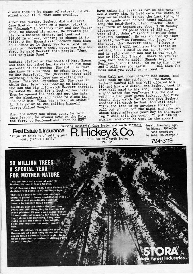 closed them up by means of sutures. He ex? pired about 11:30 that same evening." After the murder, Beckett did not leave Cape Breton. He went on a party, picking up "friends" in Whitney Pier and New Water? ford. He showed his money. He treated peo? ple to a Chinese dinner, and took out $19.00 in silver, wanting to change it to bills. A Mr. Howard said Beckett took them to a dance at 14 Ward, New Waterford. He never got Beckett's name, never saw him be? fore. He said Beckett told people, "Just call me plain Fred." Beckett visited at the house of Mrs. Brown, and each day asked her to read to him news accounts of the murder. She told him that she knew Nick Marthos, he often drove her to New Waterford. "He (Beckett) never said anything." A Ms. Dupe was visiting Mrs. Brown. This was September 23. She came in while Mrs. Brown was reading to Beckett. She saw the big gold watch Beckett carried. He asked Ms. Dupe for a lock of her hair. Then he opened the back and put the hair on the clockworks and tried to close it. She told him, "That was a foolish stunt." At this point he was calling himself George Alfred Vaughn. When the money was about gone, he left Cape Breton. He stowed away on the Kyle, the ferry to Newfoundland. Then he may have taken the train as far as his money would carry him. He held onto the watch as long as he could. It was the last thing he had to trade when he was found walking a- long the Re id-Newfound land tracks . This was "28th of September, about 3:30 Sunday afternoon... 20 poles west of 525 miles west of St. John's" (about 22 miles from Port-aux-Basques). He was spotted by Thom? as Wall, Section Foreman, who later told the court that Beckett said, "'I have a watch here I will sell you for little or nothing.'... I said it was an old watch and he said when it was new it was worth $40 or $50. And I said, 'Where do you be? long to?' And he said, 'Shandy Bay, Old Perlican, ' and I said, 'Go on to the house and I will see you again.. • . Tell them the boss said you could get a feed!'" When Wall got home Beckett had eaten, and Wall took up the subject of the watch. Beckett wanted $15 and Wall offered him $10 and his old watch--and Beckett took it. Then Wall said to his son, "Mike, here is a good watch for you"--meaning the old watch he had just given Beckett. And Mike bought that watch for $5 and gave Beckett another old watch he had. And Wall said, "It's too late to go anywhere tonight. I will put you up for the night and take you about three miles on your way in the morn? ing." Wall told the court, "I put him up? stairs, and when he went in the room I Serving Industrial Cape Breton and North Victoria Real Estate & Insurance "If you're thinking of selling your home, give us a call." p.'0. Box gsTl'orth Sydney B2A 3MT RHickey&Co.; Gerald Brennan, Mgr. Residence: 794-4564 "And remember: No sale, no charge." 794-3119
