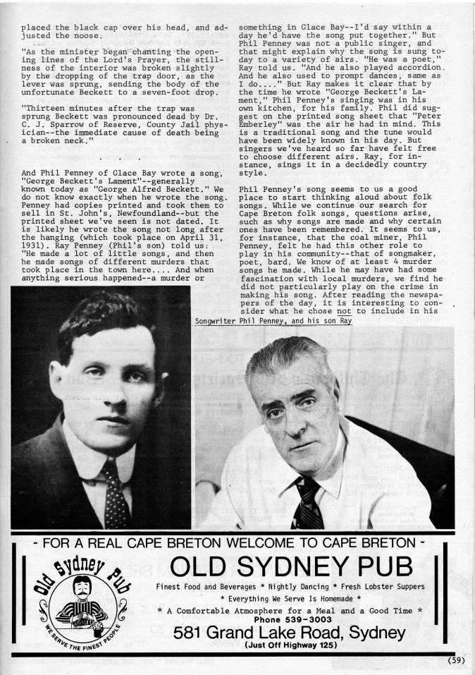 Published by Ronald Caplan on 1986/6/1 (327 reads)placed the black cap over his head, and ad? justed the noose. "As the minister began??chanting the open? ing lines of the Lord's Prayer, the still? ness of the interior was broken slightly by the dropping of the trap door, as the lever was sprung, sending the body of the unfortunate Beckett to a seven-foot drop. "Thirteen minutes after the trap was sprung Beckett was pronounced dead by Dr. C. J. Sparrow of Reserve, County Jail phys? ician- -the immediate cause of death being a broken neck." And Phil Penney of Glace Bay wrote a song, "George Beckett's Lament"--generally known today as "George Alfred Beckett," We do not know exactly when he wrote the song. Penney had copies printed and took them to sell in St. John's, Newfoundland--but the printed sheet we've seen is not dated. It is likely he wrote the song not long after the hanging (which took place on April 31, 1931). Ray Penney (Phil's son) told us: "He made a lot of little songs, and then he made songs of different murders that took place in the town here.... And when anything serious happened--a murder or something in Glace Bay--I'd say within a day he'd have the song put together." But Phil Penney was not a public singer, and that might explain why the song is sung to? day to a variety of airs. "He was a poet," Ray told us. "And he also played accordion • And he also used to prompt dances, same as I do...." But Ray makes it clear that by the time he wrote "George Beckett's La? ment," Phil Penney's singing was in his own kitchen, for his family. Phil did sug? gest on the printed song sheet that "Peter Emberley" was the air he had in mind. This is a traditional song and the tune would have been widely known in his day. But singers we've heard so far have felt free to choose different airs. Ray, for in? stance, sings it in a decidedly country style. Phil Penney's song seems to us a good place to start thinking aloud about folk songs. While we continue our search for Cape Breton folk songs, questions arise, such as why songs are made and why certain ones have been remembered. It seems to us, for instance, that the coal miner, Phil Penney, felt he had this other role to play in his community--that of songmaker, poet, bard. We know of at least 4 murder songs he made. While he may have had some fascination with local murders, we find he did not particularly play on the crime in making his song. After reading the newspa? pers of the day, it is interesting to con? sider what he chose not to include in his Songwriter Phil Penney, and his son Ray FOR A REAL CAPE BRETON WELCOME TO CAPE BRETON "''' The fxH'"'' OLD SYDNEY PUB Finest Food and Beverages * Nightly Dancing * Fresh Lobster Suppers * Everything We Serve Is Homemade * * A Comfortable Atmosphere for a Meal and a Good Time * Phone 539-3003 581 Grand Lake Road, Sydney (Just Off Highway 125) (59)