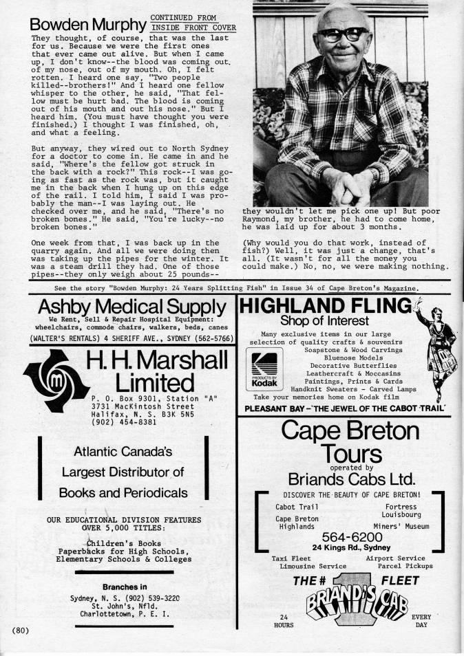 P-, , . - , CONTINUED FROM Bowden Iviurphy inside front cover They thought, of course, that was the last for us. Because we were the first ones that ever came out alive. But when I came up, I don't know--the blood was coming out, of my nose, out of my mouth. Oh, I felt rotten. I heard one say, "Two people killed--brothers!" And I heard one fellow whisper to the other, he said, "That fel? low must be hurt bad. The blood is coming out of his mouth and out his nose." But I heard him. (You must have thought you were finished.) I thought I was finished, oh, and what a feeling. But an3rwray, they wired out to North Sydney for a doctor to come in. He came in and he said, "Where's the fellow got struck in the back with a rock?" This rock--I was go? ing as fast as the rock was, but it caught me in the back when I hung up on this edge of the rail. I told him, I said I was pro? bably the man--I was laying out. He checked over me, and he said, "There's no broken bones." He said, "You're lucky--no broken bones." One week from that, I was back up in the quarry again. And all we were doing then was taking up the pipes for the winter. It was a steam drill they had. One of those pipes--they only weigh about 25 pounds-- they wouldn't let me pick one up! But poor Ra3miond, my brother, he had to come home, he was laid up for about 3 months. (Why would you do that work, instead of fish?) Well, it was just a change, that's all. (It wasn't for all the money you could make.) No, no, we were making nothing. See the story "Bowden Murphy: 24 Years Splitting Fish" in Issue 34 of Cape Breton's Magazine. Ashby Medical Supply We Rent, Sell & Repair Hospital Equipment: wheelchairs, commode chairs, walkers, beds, canes (WALTER'S RENTALS) 4 SHERIFF AVE., SYDNEY (562-5766) _ H. H. Marshall ilW Limited P. 0. Box 9301, Station "A" 3731 MacKintosh Street Halifax, N. S. B3K 5N5 (902) 454-8381 Atlantic Canada's Largest Distributor of Books an(j Periodicals OUR EDUCATIONAL DIVISION FEATURES OVER 5,000 TITLES: Children's Books Paperbkcks for High Schools, Elementary Schools 6e Colleges Branches in Sydney, N. S. (902) 539-3220 St. John's, Nfld. Charlottetown, P. E. I. (80) HIGHLAND FLING' Shop of Interest Many exclusive items in our large selection of quality crafts & souvenirs 1 Soapstone & Wood Carvings I'''H Bluenose Models Decorative Butterflies Leathercraft & Moccasins Paintings, Prints & Cards Handknit Sweaters - Carved Lamps PRODUCTS BY Kodak Take your memories home on Kodak film PLEASANT BAY -THE JEWEL OF THE CABOT TRAIL' Cape Breton Tours operated by Briands Cabs Ltd DISCOVER THE-BEAUTY OF CAPE BRETON! Cabot Trail Fortress Cape Breton Louisbourg Highlands Miners' Museum 564-6200 24 Kings Rd., Sydney Taxi Fleet Limousi Th ne Service fE# [1 • ' 24 Ky'y- HOURS ' - Airport Service Parcel Pickups 1 FLEET U' 'y'U''' EVERY / DAY