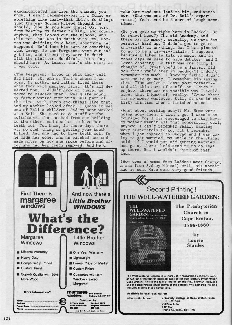 Published by Ronald Caplan on 1986/8/1 (399 reads)excommunicated him from the church, you know. I can't remember--was it a Munro or something like that--that didn't do things just the way Norman McLeod thought he shouldo (How do you know that?) Oh, just from hearing my father talking, and cousin. Anyhow, they looked out the window, and this man that was in dutch with Rev. Nor? man was drifting in a boat, something had happened. He'd lost his oars or something went wrong. So the Fergusons went out and got him, and (then) they were in dutch with the minister. He didn't think they should have. At least, that's the story as I was told. (The Fergusons) lived in what they call Big Hill, St. Ann's. That's where I was bom. My mother and father lived there when they were married first. It's all de? serted now. I didn't grow up there. We moved to Baddeck when I was quite young. My father worked over with Bell part of the time, with sheep and things like that. And my mother looked after--I guess it was one of Bell's children. And my aunt worked with Bell. She used to do stuff at the switchboard that he had from one building to the other. And she had to have her teeth out. You know, in those days there was no such thing as getting your teeth filled. And she had to have teeth out. So he made her come, and he watched her and made notes on how she spoke before and af? ter she had her teeth removed. And he'd ' r First There is margaree windows And now there's Little Brother WINDOWS What's the Difference? Margaree Windows I Lifetime Warranty I Heavy Duty I Competitively Priced I Custom Finish I Superb Quality with 50% More Wood More Information? Little Brother Windows I One Year Warranty I Lightweight I Lowest Price on Market I Custom Finish I Competes with any Window - except Margaree!! margaree p.o.b?xmi windows SytfMy, N.S. BIP 6H7 'J Sou Only Through L • make her read out loud to him, and watch her. (She was one of Dr. Bell's experi? ments.) Yeah. And he'd sort of laugh some? times . (So you grew up right here in Baddeck. Go to school here?) The old Academy. And there was no money. Actually, we were des? perately hard up. I didn't get to go to university or anything. But I had planned to go to be a lawyer--mainly, I suppose, because I liked to talk so much. And in those days we used to have debates, and I loved debating. So that was one thing I thought of. (That you'd be a lawyer. Did you think you'd stay in Baddeck?) I don't remember too much. I know my father didn't want me to go away. I remember him saying that--"You wouldn't leave your mother"-- and all this sort of stuff. So I didn't. Anyhow, there was no possible way I could have, that I know of, really. 'Cause there was no money whatever. Well, it was in the Dirty Thirties when I finished school. (What about working away?) No. Some were going away then. I didn't go. I wasn't en? couraged to; I was encouraged to stay home. My mother wasn't all that wonderfully well, anyhow. I can't remember really wanting very desperately to go. But I remember when I got engaged to George and I was go? ing to get married, my uncle in the States said, if I would put off getting married and go up there, he'd send me to college up there. But I wouldn't think of that then. (How does a woman from Baddeck meet George, a man from Sydney Mines?) Well, his mother and my' Aunt Kate were very good friends, r • ' Second Printing! THE WELL-WATERED GARDEN: The Presbyterian Church in Cape Breton, 1798-1860 by Laurie Stanley The Vtfell-Watered Garden is a thoroughly researched scholarly work, as well as a thoroughly readable account of 19th century Presbyterian Cape Breton. It tells the tale of the enigmatic Rev. Norman MacLeod and the elaborate spiritual drama of the settlers who gathered "to sing the Lord's song in a strange land." Available in local retail outlets. Also available from: University College of Cape Breton Press P.O. Box 5300 Sydney, N.S. B1P6L2 Phone 539-5300, Ext. 146