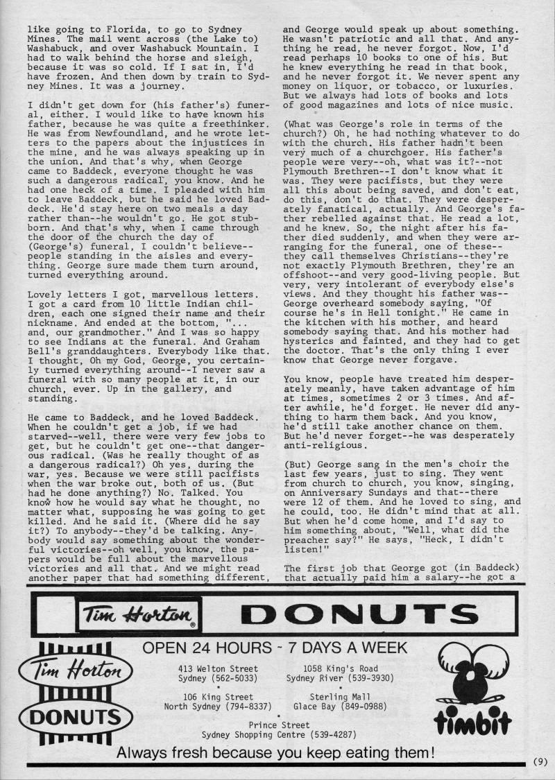 Published by Ronald Caplan on 1986/8/1 (306 reads)like going to Florida, to go to Sydney Mines. The mail went across (the Lake to) Washabuck, and over Washabuck Mountain. I had to walk behind the horse and sleigh, because it was so cold. If I sat in, I'd have frozen. And then down by train to Syd? ney Mines. It was a journey. I didn't get down for (his father's) funer? al, either. I would like to ha-O-e known his father, because he was quite a freethinker. He was from Newfoundland, and he wrote let? ters to the papers about the injustices in the mine, and he was always speaking up in the union. And that's why, when George came to Baddeck, everyone thought he was such a dangerous radicaT, you know. And he had one heck of a time. I pleaded with him to leave Baddeck, but he said he loved Bad- deck. He'd stay here on two meals a day rather than--he wouldn't go. He got stub- bom. And that's why, when I came through the door of tihe church the day of (George's) funeral, I couldn't believe-- people standing in the aisles and every? thing. George sure made them turn around, turned everything around. Lovely letters I got, marvellous letters. I got a card from 10 little Indian chil? dren, each one signed their name and their nickname. And ended at the bottom, "... and, our grandmother." And I was so happy to see Indians at the funeral. And Graham Bell's granddaughters. Everybody like that. I thought. Oh my God, George, you certain? ly turned everything around--I never saw a funeral with so many people at it, in our church, ever. Up in the gallery, and standing. He came to Baddeck, and he loved Baddeck. When he couldn't get a job, if we had starved--well, there were very few jobs to get, but he couldn't get one--that danger? ous radical. (Was he really thought of as a dangerous radical?) Oh yes, during the war, yes. Because we were still pacifists when the war broke out, both of us. (But had he done anything?) No. Talked. You know how he would say what he thought, no matter what, supposing he was going to get killed. And he said it. (Where did he say it?) To anybody~-they'd be talking. Any? body would say something about the wonder? ful victories--oh well, you know, the pa? pers would be full about the marvellous victories and all that .< And we might read another paper that had something different. and George would speak up about something. He wasn't patriotic and all that. And any? thing he read, he never forgot. Now, I'd read perhaps 10 books to one of his. But he knew everything he read in that book, and he never forgot it. We never spent any money on liquor, or tobacco, or luxuries. But we always had lots of books and lots of good magazines and lots of nice music. (What was George's role in terms of the church?) Oh, he had nothing whatever to do with the church. His father hadn't been very much of a churchgoer. His father's people were very--oh, what was it?--not Plymouth Brethren--I don't know what it was. They were pacifists, but they were all this about being saved, and don't eat, do this, don't do that. They were desper? ately fanatical, actually. And George's fa? ther rebelled against that. He read a lot, and he knew. So, the night after his fa? ther died suddenly, and when they were ar? ranging for the funeral, one of these-- they call themselves Christians--they're not exactly Plymouth Brethren, they're an offshoot--and very good-living people. But very, very intolerant of everybody else's views. And they thought his father was-- George overheard somebody saying, "Of course he's in Hell tonight." He came in the kitchen with his mother, and heard somebody saying that. And his mother had hysterics and fainted, and they had to get the doctor. That's the only thing I ever know that George never forgave. You know, people have treated him desper? ately meanly, have taken advantage of him at times, sometimes 2 or 3 times. And af? ter awhile, he'd forget. He never did any? thing to harm them back. And you know, he'd still take another chance on them. But he'd never forget--he was desperately anti-religious. (But) George sang in the men's choir the last few years, just to sing. They went from church to church, you know, singing, on Anniversary Sundays and that--there were 12 of them. And he loved to sing, and he could, too. He didn't mind that at all. But when he'd come home, and I'd say to him something about, "Well, what did the preacher say?" He says, "Heck, I didn't listen!" The first job that George got (in Baddeck) that actually paid him" a salary--he got a OPEN 24 HOURS - 7 DAYS A WEEK 413 Welton Street Sydney (562-5033) 106 King Street North Sydney (794-8337) 1058 King's Road Sydney River (539-3930) Sterling Mail Glace Bay (849-0988) 7' Tfoittn' 106 King Street Sterling Mail r- '' '' North Sydney (794-8337) Glace Bay (849-0988) ' ' DONUTS:) tlMlbTt Always fresh because you keep eating them!