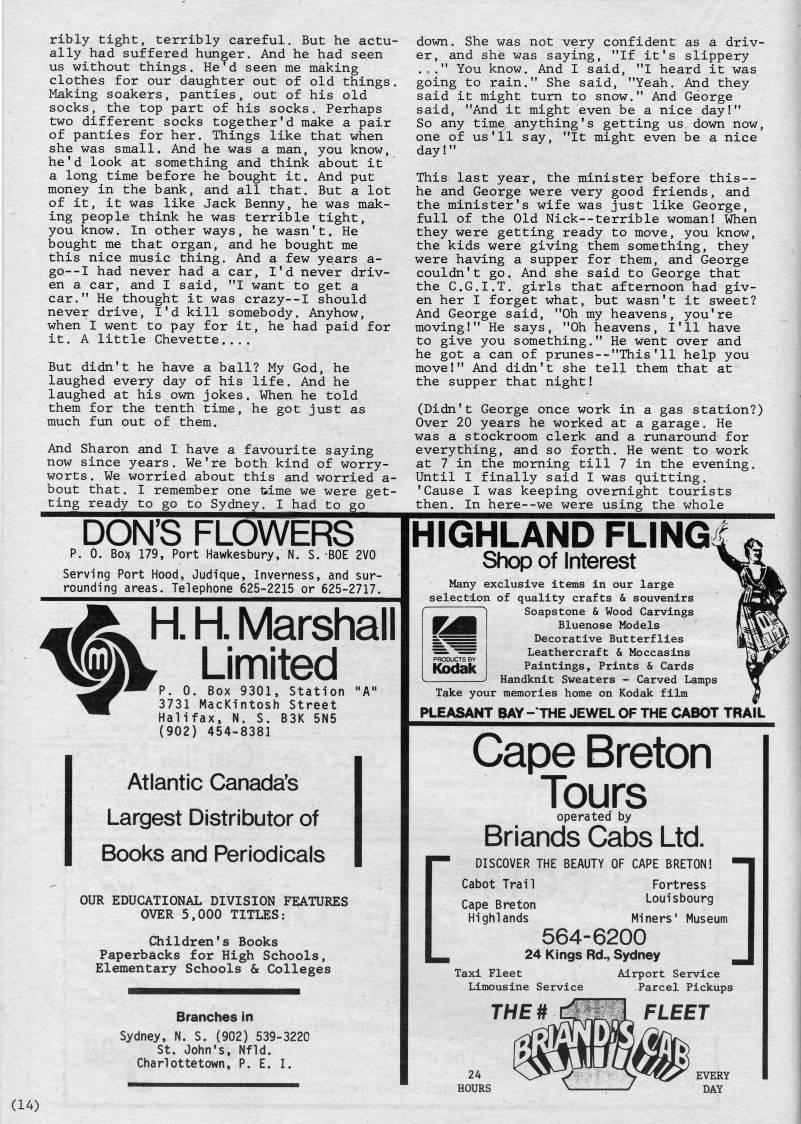 Published by Ronald Caplan on 1986/8/1 (300 reads)ribly tight, terribly careful. But he actu? ally had suffered hunger. And he had seen us without things. He'd seen me making clothes for our daughter out of old things. Making soakers, panties, out of his old socks, the top part of his socks. Perhaps two different socks together'd make a pair of panties for her. Things like that when she was small. And he was a man, you know, he'd look at something and think about it a long time before he bought it. And put money in the bank, and all that. But a lot of it, it was like Jack Benny, he was mak? ing people think he was terrible tight, you know. In other ways, he wasn't. He bought me that organ, and he bought me this nice music thing. And a few years a- go--I had never had a car, I'd never driv? en a car, and I said, "I want to get a car." He thought it was crazy--I should never drive, I'd kill somebody. Anyhow, when I went to pay for it, he had paid for it. A little Chevette.... But didn't he have a ball? My God, he laughed every day of his life. And he laughed at his own jokes. When he told them for the tenth time, he got just as much fun out of them. And Sharon and I have a favourite saying now since years. We're both kind of worry- worts . We worried about this and worried a- bout that. I remember one time we were get- ting ready to go to Sydney. I had to go down. She was not very confident as a driv? er, and she was saying, "If it's slippery .,." You know. And I said, "I heard it was going to rain." She said, "Yeah. And they said it might turn to snow." And George said, "And it might even be a nice day!" So any time anything's getting us down now, one of us'11 say, "It might even be a nice day!" This last year, the minister before this-- he and George were very good friends, and the minister's wife was just like George, full of the Old Nick--terrible woman! When they were getting ready to move, you know, the kids were giving them something, they were having a supper for them, and George couldn't go. And she said to George that the C.G.I.T. girls that afternoon had giv? en her I forget what, but wasn't it sweet? And George said, "Oh my heavens, you're moving!" He says, "Oh heavens, I'll have to give you something." He went over and he got a can of prunes--"This'11 help you move!" And didn't she tell them that at the supper that night! (Didn't George once work in a gas station?) Over 20 years he worked at a garage. He was a stockroom clerk and a runaroimd for everything, and so forth. He went to work at 7 in the morning till 7 in the evening. Until I finally said I was quitting. 'Cause I was keeping overnight tourists then. In here--we were using the whole DON'S FLOWERS p. 0. Bo)f 179, Port Hawkesbury, N. S. BOE 2V0 Serving Port Hood, Judique, Inverness, and sur? rounding areas. Telephone 625-2215 or 625-2717. ' ,'_ H. H. Marshall iSt Limited 0. Box 9301, Station "A" 3731 MacKintosh Street Halifax, N. S. B3K 5N5 (902) 454-8381 Atlantic Canada's Largest Distributor of Books and Periodicals OUR EDUCATIONAL DIVISION FEATURES OVER 5,000 TITLES: Children's Books Paperbacks for High Schools, Elementary Schools 6e Colleges Branches in Sydney, N. S. (902) 539-3220 St. John's, Nfld. Charlottetown, P. E. I. HIGHLAND FLINGI Shop of Interest Many exclusive items in our large selection of quality crafts & souvenirs ?? 1 Soapstone & Wood Carvings W'''k Bluenose Models Decorative Butterflies Leathercraft & Moccasins Paintings, Prints & Cards Handknit Sweaters - Carved Lamps Take your memories home on Kodak film PLEASANT BAY -THE JEWEL OF THE CABOT TRAIL Cape Breton Tours [ operated by Briands Cabs Ltd. DISCOVER THE BEAUTY OF CAPE BRETON! ' Cabot Trail Fortress Cape Breton Louisbourg Highlands Miners' Museum 564-6200 24 Kings Rd., Sydney , Taxi Fleet Limousine Service JHEH ' 24 <03' HOURS > Airport Service Parcel Pickups r. J' FLEET f# 'Y'I'V' EVERY ] (14)