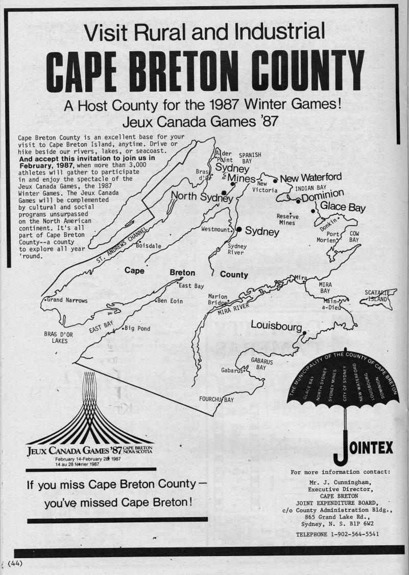 Published by Ronald Caplan on 1986/8/1 (297 reads)Visit Rural and Industrial CAPE BRETON COUNTY A Host County for the 1987 Winter Games! Jeux Canada Games '87 Cape Breton County is an excellent base for your visit to Cape Breton Island, anytime. Drive or hike beside our rivers, lakes, or seacoast And accept this invitation to join us in February, 1987, when more than 3,000 athletes will gather to participate in and enjoy the spectacle of the Jeux Canada Games, the 1987 Winter Games. The Jeux Canada Games will be complemented by cultural and social programs unsurpassed on the North American continent. It's all part of Cape Breton County--a county to explore all year 'round. '*-, Y'' SPANISH n JjVnt BAY J Sydney ?? ''* 'Mines]47>NewVVaterforcl 'X /vicToria j}' INDIAN BAY . Sydney/ O'Don'''''' AG/aceBay Reserve. y''-''"'' ' ', Mines l/' '' oyaney Pon/ cow ,.- Morien/' BAY Sydney River smMnry OINTEX If you miss Cape Breton County ?? youVe missed Cape Breton! For more infonnation contact: Mr. J. Cunningham, Executive Director, CAPE BRETON JOINT EXPENDITURE BOARD, c/o County Administration Bldg., 865 Grand Lake Rd., Sydney, N. S. BIP 6W2 TELEPHONE 1-902-564-5541 (44)