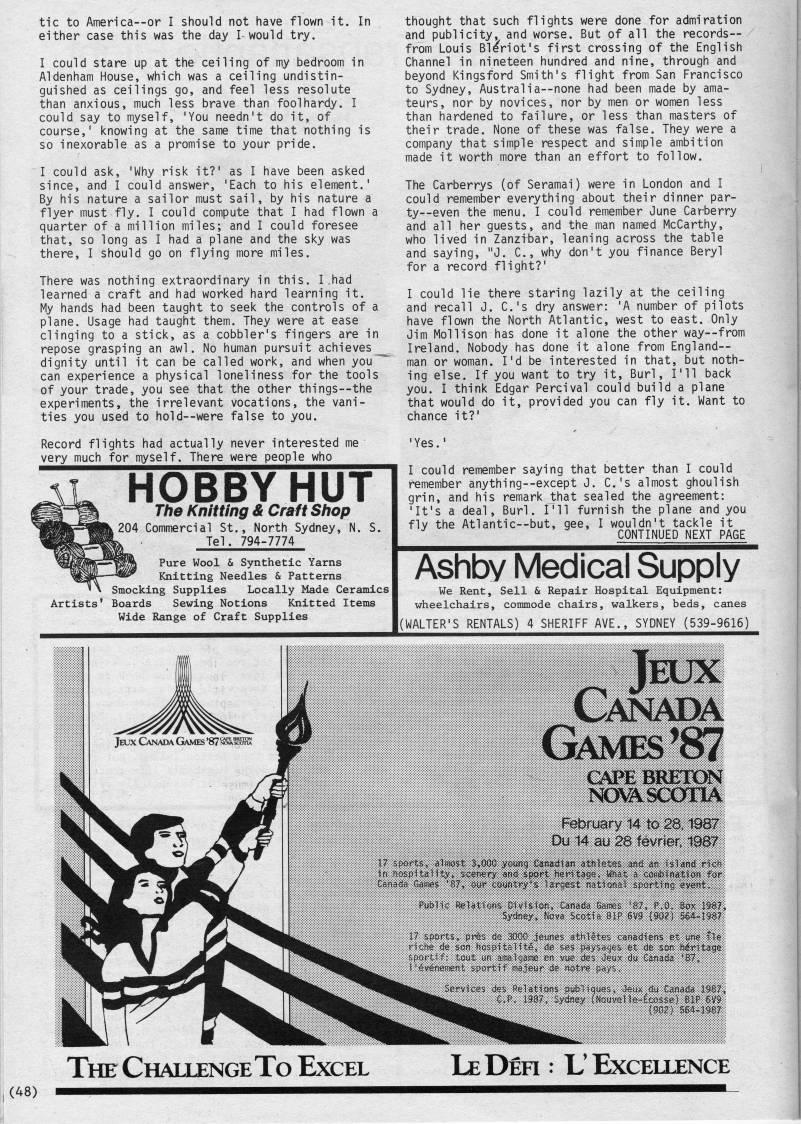 tic to America • or I should not have flown it. In either case this was the day I would try. I could stare up at the ceiling of my bedroom in Aldenham House, which was a ceiling undistin? guished as ceilings go, and feel less resolute than anxious, much less brave than foolhardy. I could say to myself, 'You needn't do it, of course,' knowing at the same time that nothing is so inexorable as a promise to your pride. I could ask, 'Why risk it?' as I have been asked since, and I could answer, 'Each to his element.' By his nature a sailor must sail, by his nature a flyer must fly. I could compute that I had flown a quarter of a million miles; and I could foresee that, so long as I had a plane and the sky was there, I should go on flying more miles. There was nothing extraordinary in this. I ,had learned a craft and had worked hard learning it. My hands had been taught to seek the controls of a plane. Usage had taught them. They were at ease clinging to a stick, as a cobbler's fingers are in repose grasping an awl. No human pursuit achieves _ dignity until it can be called work, and when you"" can experience a physical loneliness for the tools of your trade, you see that the other things--the experiments, the irrelevant vocations, the vani? ties you used to hold--were false to you. Record flights had actually never interested me very much for myself. There were people who L HOBBY HUT The Knitting & Craft Shop Commercial St., North Sydney, N. S. Tel, n'-lllt' Pure Wool & Synthetic Yarns Knitting Needles & Patterns Smocking Supplies Locally Made Ceramics Artists' Boards Sewing Notions Knitted Items Wide Range of Craft Supplies thought that such flights were done for admiration and publicity, and worse. But of all the records-- from Louis Bllriot's first crossing of the English Channel in nineteen hundred and nine, through and beyond Kingsford Smith's flight from San Francisco to Sydney, Australia • none had been made by ama? teurs, nor by novices, nor by men or women less than hardened to failure, or less than masters of their trade. None of these was false. They were a company that simple respect and simple ambition made it worth more than an effort to follow. The Carberrys (of Seramai) were in London and I could remember everything about their dinner par- ty--even the menu. I could remember June Carberry and all her guests, and the man named McCarthy, who lived in Zanzibar, leaning across the table and saying, "J. C, why don't you finance Beryl for a record flight?' I could lie there staring lazily at the ceiling and recall J. C.'s dry answer: 'A number of pilots have flown the North Atlantic, west to east. Only Jim Mollison has done it alone the other way--from Ireland. Nobody has done it alone from England-- man or woman. I'd be interested in that, but noth? ing else. If you want to try it. Burl, I'll back you. I think Edgar Percival could build a plane that would do it, provided you can fly it. Want to chance it?' 'Yes.' I could remember saying that better than I could remember anything--except J. C.'s almost ghoulish grin, and his remark that sealed the agreement: 'It's a deal. Burl. I'll furnish the plane and you fly the Atlantic--but, gee, I wouldn't tackle it CONTINUED NEXT PAGE Ashby Medical Supply We Rent, Sell & Repair Hospital Equipment: wheelchairs, commode chairs, walkers, beds, canes (WALTER'S RENTALS) 4 SHERIFF AVE., SYDNEY (539-9616) Jeux Canada Games'87 iNOmsCOTIA February 14 10 28,1987 Du 14 au 28 fevrier. 19S7 1? S!>ort5j 'm%K MOO young eartadl-aw dtMatas aftd m H'SmA rkh 1ft hospitalUy> $c?n?ry mCI, Rujc m''i' Sydne-y, Jleya Seotfa 01P 6V9 {'t S64-m? Xt 5P!jrts?? pi's de 3(J0fl 4fiiifig$. atht?t?s osnsiJl&ws; et utie fie Htjte -de sen hcisf>1talft5s de ses f'ays-a''-' -'X de son 51'Htag?? sporti-f; to?t m. aimlgame eft v'ie des ''mt. du Cartaiia "-az* pes