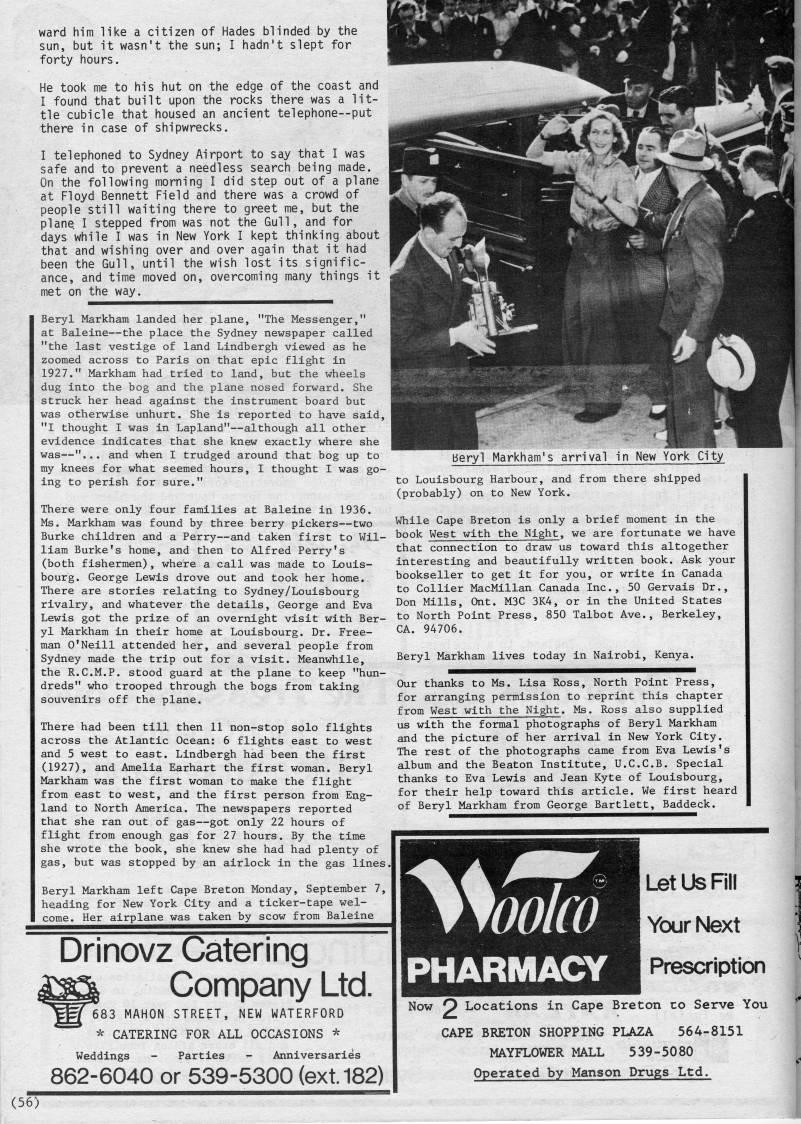 ward him like a citizen of Hades blinded by the sun, but it wasn't the sun; I hadn't slept for forty hours. He took me to his hut on the edge of the coast and I found that built upon the rocks there was a lit? tle cubicle that housed an ancient telephone--put there in case of shipwrecks. I telephoned to Sydney Airport to say that I was safe and to prevent a needless search being made. On the following morning I did step out of a plane at Floyd Bennett Field and there was a crowd of people still waiting there to greet me, but the plane I stepped from was not the Gull, and for days while I was in New York I kept thinking about that and wishing over and over again that it had been the Gull, until the wish lost its signific? ance, and time moved on, overcoming many things it met on the way. Beryl Markham landed her plane, "The Messenger," at Baleine • the place the Sydney newspaper called "the last vestige of land Lindbergh viewed as he zoomed across to Paris on that epic flight in 1927." Markham had tried to land, but the wheels dug into the bog and the plane nosed forward. She struck her head against the instrument board but was otherwise unhurt. She is reported to have said, "I thought I was in Lapland" • although all other evidence indicates that she knew exactly where she was • "... and when I trudged around that bog up to my knees for what seemed hours, I thought I was go? ing to perish for sure." There were only four families at Baleine in 1936. Ms. Markham was found by three berry pickers • two Burke children and a Perry • and taken first to Wil? liam Burke's home, and then to Alfred Perry's (both fishermen), where a call was made to Louis? bourg. George Lewis drove out and took her home. There are stories relating to Sydney/Louisbourg rivalry, and whatever the details, George and Eva Lewis got the prize of an overnight visit with Ber? yl Markham in their home at Louisbourg. Dr. Free? man O'Neill attended her, and several people from Sydney made the trip out for a visit. Meanwhile, the R.C.M.P. stood guard at the plane to keep "hun? dreds" who trooped through the bogs from taking souvenirs off the plane. There had been till then 11 non-stop solo flights across the Atlantic Ocean: 6 flights east to west and 5 west to east. Lindbergh had been the first (1927), and Amelia Earhart the first woman. Beryl Markham was the first woman to make the flight from east to west, and the first person from Eng? land to North America. The newspapers reported that she ran out of gas • got only 22 hours of flight from enough gas for 27 hours. By the time she wrote the book, she knew she had had plenty of gas, but was stopped by an airlock in the gas lines Beryl Markham left Cape Breton Monday, September 7, heading for New York City and a ticker-tape wel? come. Her airplane was taken by scow from Baleine Drinovz Catering Company Ltd. 683 MAHON STREET, NEW WATERFORD * CATERING FOR ALL OCCASIONS * Weddings - Parties - Anniversaries 862-6040 or 539-5300 (ext. 182) (56) beryl Markham's arrival in New York City to Louisbourg Harbour, and from there shipped (probably) on to New York. While Cape Breton is only a brief moment in the book West with the Night, we are fortunate we have that connection to draw us toward this altogether interesting and beautifully written book. Ask your bookseller to get it for you, or write in Canada to Collier MacMillan Canada Inc., 50 Gervais Dr., Don Mills, Ont. M3C 3K4, or in the United States to North Point Press, 850 Talbot Ave., Berkeley, CA. 94706. Beryl Markham lives today in Nairobi, Kenya. Our thanks to Ms. Lisa Ross, North Point Press, for arranging permission to reprint this chapter from West with the Night. Ms. Ross also supplied us with the formal photographs of Beryl Markham and the picture of her arrival in New York City. The rest of the photographs came from Eva Lewis's album and the Beaton Institute, U.C.C.B. Special thanks to Eva Lewis and Jean Kyte of Louisbourg, for their help toward this article. We first heard of Beryl Markham from George Bartlett, Baddeck. Let Us Fill Your Next Prescription Now O Locations in Cape Breton to Serve You CAPE BRETON SHOPPING PLAZA 564-8151 MAYFLOWER MALL 539-5080 Operated by Manson Drugs Ltd.