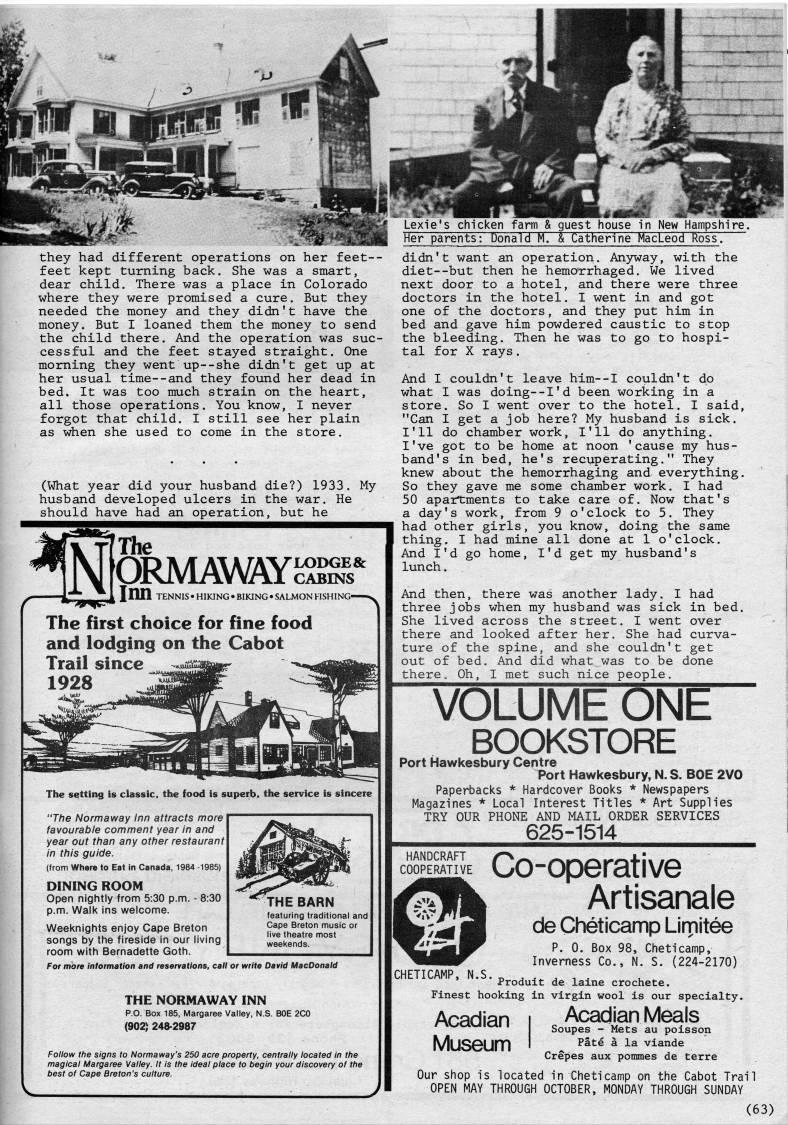 they had different operations on her feet-- feet kept turning back. She was a smart, dear child. There was a place in Colorado where they were promised a cure. But they needed the money and they didn't have the money. But I loaned them the money to send the child there. And the operation was suc? cessful and the feet stayed straight. One morning they went up--she didn't get up at her usual time--and they found her dead in bed. It was too much strain on the heart, all those operations. You know, I never forgot that child. I still see her plain as when she used to come in the store. (What year did your husband die?) 1933. My husband developed ulcers in the war. He should have had an operation, but he Inn CABINS TENNIS • HIKING • BIKING • SALMON FISHING- The first choice for fine food and lodging on the Cabot Trail since 1928 The setting is classic, the food is superb, the service is sincere "The Normaway Inn attracts more favourable comment year in and year out than any other restaurant in this guide. (from Where to Eat in Canada, 1984 -1985) DINING ROOM Open nightly from 5:30 p.m. - 8:30 p.m. Walk Ins welcome. Weeknights enjoy Cape Breton songs by the fireside in our living room with Bernadette Goth. For more iitformation and reservations, call THE BARN featuring traditional and Cape Breton music or live tfieatre most weekends. r write David MacDonald THE NORMAWAY INN P.O. Box 185, [Vlargaree Valley, N.S. BOE 200 (902) 248-2987 Follovi/ ttie signs to Normaway's 250 acre property, centrally located in tfie magical Margaree Valley. It is ttie ideal place to begin your discovery of the best of Cape Breton's culture. didn't want an operation. An3rway, with the diet--but then he hemorrhaged. We lived next door to a hotel, and there were three doctors in the hotel. I went in and got one of the doctors, and they put him in bed and gave him powdered caustic to stop the bleeding. Then he was to go to hospi? tal for X rays. And I couldn't leave him--I couldn't do what I was doing--I'd been working in a store. So I went over to the hotel. I said, "Can I get a job here? My husband is sick. I'll do chamber work, I'll do anything. I've got to be home at noon 'cause my hus? band's in bed, he's recuperating." They knew about the hemorrhaging and everything. So they gave me some chamber work. I had 50 apartments to take care of. Now that's a day's work, from 9 o'clock to 5. They had other girls, you know, doing the same thing. I had mine all done at 1 o'clock. And I'd go home, I'd get my husband's lunch. And then, there was another lady. I had three jobs when my husband was sick in bed. She lived across the street. I went over there and looked after her. She had curva? ture of the spine, and she couldn't get out of bed. And did what was to be done thereo Oh, I met such nice people. VOLUME ONE BOOKSTORE Port Hawkesbury Centre Port Hawkesbury, N. S. BOE 2V0 Paperbacks * Hardcover Books * Newspapers Magazines * Local Interest Titles * Art Supplies TRY OUR PHONE AND MAIL ORDER SERVICES 625-1514 HANDCRAFT COOPERATIVE Co-operative Artisanale de Cheticamp Limitee p. 0. Box 98, Cheticamp, Inverness Co., N. S. (224-2170) CHETICAMP, N.S. ' . ., ' , . Produit de laine crochete. Finest hooking in virgin wool is our specialty. Acadian i Acadian Meals r'oav'iai i Soupes - Mets au poisson Museum I ' '''' ' '' viande Crepes aux pommes de terre Our shop is located in Cheticamp on the Cabot Trail OPEN MAY THROUGH OCTOBER, MONDAY THROUGH SUNDAY (63)