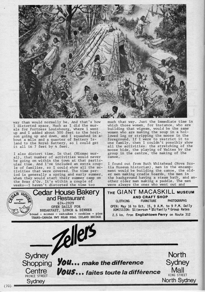 way than would normally be. And that's how I distorted space. Much as I did the mur? als for Fortress Louisbourg, where I went up and I added about 500 feet to the hori? zon going up and down, and I squashed in a- bout a mile and a quarter of Battery Is? land to the Royal Battery, so I could get it all in 7 feet by 4 feet. I also distort time. In that (Micmac mur? al) , that number of activities would never be going on within the town at that partic? ular time. And I've included an extra coup? le of families, so I could show all the ac? tivities that were covered. The time per? iod is generally a spring and early summer, when they would start their stammer camp on the Bras d'Or. It's within a couple of weeks--I haven't distorted the time too much that way. Just the immediate time in which those women, for instance, who are building that wigwam, would be the same women who are making the soup in a hol? lowed log or stripping the moose in the foreground. If I were to restrict it to one family, then I couldn't possibly show all the activities: the stretching of the moose hide, the playing of Waltes by the group in the centre, the making of the canoe. I found out from Ruth Whitehead (Nova Sco? tia Museum historian), men in the encamp? ment would be building the canoe, the old? er men making cradle boards, the men in the background having a steam bath, and an? other older man making a paddle. The men were always the ones who went out and Cedar House Bakery and Restaurant 674-2929 OPEN DAILY FOR BREAKFAST, LUNCH 6e DINNER bread - scones - oatcakes - cookies - pies TRANS-CANADA HWY NEAR SEAL ISLAND BRIDGE THE GIANT MACASKILL museum AND CRAFT SHOP CLOTHING FURNITURE PHOTOGRAPHS OPEN: May 16 to Oct. 15, 9 A.M. to 9 P.M. Daily ADMISSION: $2/person*$5/family * Group Rates 2.5 km. from Englishtown Ferry on Route 312 (70) Sydney ' North Shopping fOU. • make the difference Sydney Centre l'OUS'' • faites toute la difference Mall PRINCE STREET ' ' • '' • • • !?* • • • ? *%'%sm' • wt. .''i ' ww '''' '''''.' Sydney North Sydney
