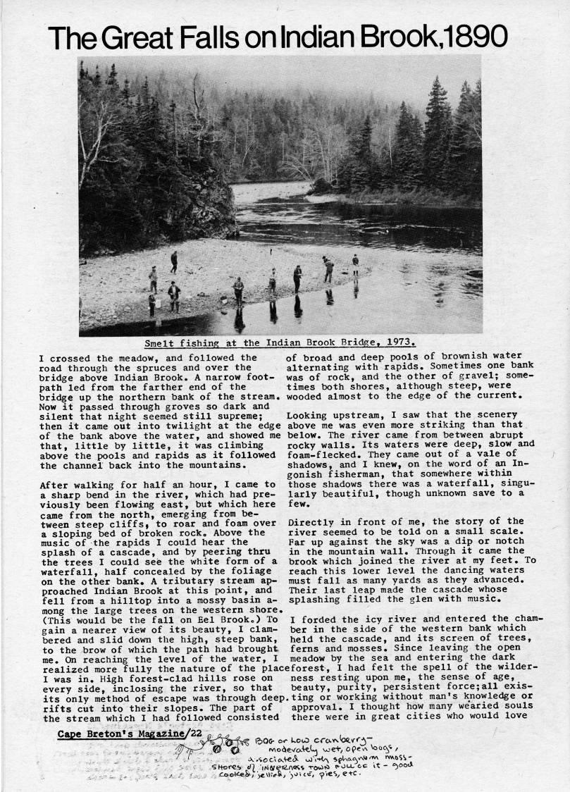 Published by Ronald Caplan on 1974/6/1 (6843 reads)The Great Falls on Indian Brook,1890 Smelt fishing at the Indian Brook Bridpce, 1973. I crossed the meadow, and followed the of broad and deep pools of brownish water road through the spruces and over the alternating with rapids. Sometimes one bank bridge above Indian Brook. A narrow foot- was of rock, and the other of gravel; some- path led from the farther end of the times both shores, although steep, were bridge up the northern bank of the stream, wooded almost to the edge of the current. Now it passed through groves so dark and silent that night seemed still supreme; Looking upstream, I saw that the scenery then it came out into twilight at the edge above me was even more striking than that of the bsink above the water, and showed me below. The river came from between abrupt that, little by little, it was climbing rocky walls. Its waters were deep, slow and above the pools and rapids as it followed foam-flecked. They came out of a vale of the channel back into the mountains. After walking for half an hour, I came to a sharp bend in the river, which had pre? viously been flowing east, but which here came from the north, emerging from be? tween steep cliffS| to roar and foam over a sloping bed of broken rock. Above the music of the rapids I could hear the splash of a cascade, and by peering thru the trees I could see the white form of a waterfall, half concealed by the foliage on the other bank, A tributary stream ap? proached Indian Brook at this point, and fell from a hilltop into a mossy basin a- mong the large trees on the western shore, (This would be the fall on Eel Brooke) To gain a nearer view of its beauty, I clam? bered and slid down the high, steep bank, to the brow of which the path had brought me. On reaching the level of the water, I realized more fully the nature of the placeforest, 1 had felt the spell of the wilder- I was in. High forest-clad hills rose on ness resting upon me, the sense of age, every side, inclosing the river, so that beauty, purity, persistent force;all exis- its only method of escape was through deep.ting or working without man's knowledge or rifts cut into their slopes. The part of approval. I thought how many we'aried souls the stream which I had followed consisted there were in great cities who would love shadows, and I knew, on the word of an In? gonish fisherman, that somewhere within those shadows there was a waterfall, singu? larly beautiful, though unknown save to a few. Directly in front of me, the story of the river seemed to be told on a small scale. Far up against the sky was a dip or notch in the mountain wall. Through it came the brook which joined the river at my feet. To reach this lower level the dancing waters must fall as many yards as they advanced. Their last leap made the cascade whose splashing filled the glen with music, I forded the icy river and entered the cham? ber in the side of the western bank which held the cascade, and its screen of trees, ferns and mosses. Since leaving the open meadow by the sea and entering the dark Cape Breton's Maga2ine/22 i'O(r ov- LocO crcv.v b?.virj'- fAodkesToMX' vooe+/ ofeA k>oc '