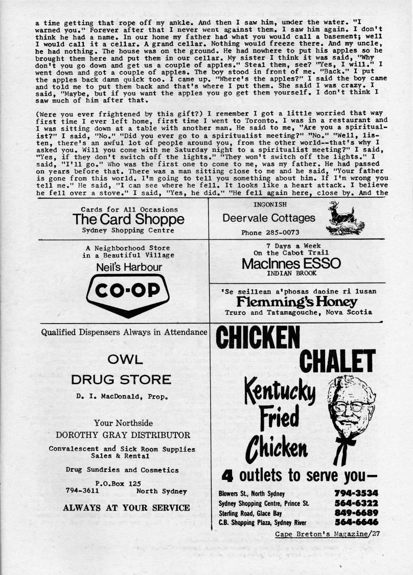 Published by Ronald Caplan on 1974/6/1 (695 reads)a time getting that rope off my ankle. And then I saw him, under the water. "I warned you." Forever after that I never went against them. I saw him again. I don't think he had a name. In our home my father had what you would call a basement; well I would call it a cellar. A grand cellar. Nothing would freeze there. And my uncle, he had nothing. The house was on the ground. He had nowhere to put his apples so he brought them here and put them in our cellar. My sister I think it was said, "Why don't you go down and get us a couple of apples." Steal them, see? "Yes, I will." I went down and got a couple of apples. The boy stood in front of me. "Back." I put the apples back damn quick too. I came up. "Where's the apples?" I said the boy came and told me to put them back and that's where I put them. She said I was crazy. I said, "Maybe, but if you want the apples you go get them yourself. I don't think I saw much of him after that. (Were you ever frightened by this gift?) I remember I got a little worried that way first time I ever left home, first time I went to Toronto. I was in a restaurant and I was sitting down at a table with another man. He said to me, "Are you a spiritual? ist?" I said, "No." "Did you ever go to a spiritualist meeting?" "No." "Well, lis? ten, there's an awful lot of people around you, from the other world • that's why I asked you. Will you come with me Saturday night to a spiritualist meeting?" I said, "Yes, if they don't switch off the lights." "They won't switch off the lights." I said, "I'll go." Vlho was the first one to come to me, was my father. He had passed on years before that. There was a man sitting close to me and he said, "Your father is gone from this world. I'm going to tell you something about him. If I'm wrong you tell me," He said, "I can see where he fell. It looks like a heart attack, I believe he fell over a stove." I said, "Yes, he did." "He fell again here, close by. And the Cards for All Occasions The Card Shoppe Sydney Shopping Centre INGONISH Deervale Cottages Phone 285-0073 A Neighborhood Store in a Beautiful Village Neil's Harbour 7 Days a Week On the Cabot Trail Maclnnes ESSO INDIAN BROOK CO-OP 'Se seillean a'phosas daoine ri lusan Flemming's Honey Truro and Tatamagouche, Nova Scotia Qualified Dispensers Always in Attendance OWL DRUG STORE D. I. MacDonald, Propo Your Northside DOROTHY GRAY DISTRIBUTOR Convalescent and Sick Room Supplies Sales & Rental Drug Sundries and Cosmetics P.O.Box 125 794-3611 North Sydney ALWAYS AT YOUR SERVICE CHICKEN CHALET fried 4 outlets to serve you- Blowen St, North Sydney Sydney Shopping Centre, Prince St Sterling Road, Glace Bay CB. Shopping Plaza, Sydney River 794-3534 564-6321 849-6689 564-6646 Cape Breton*s Magazine/27