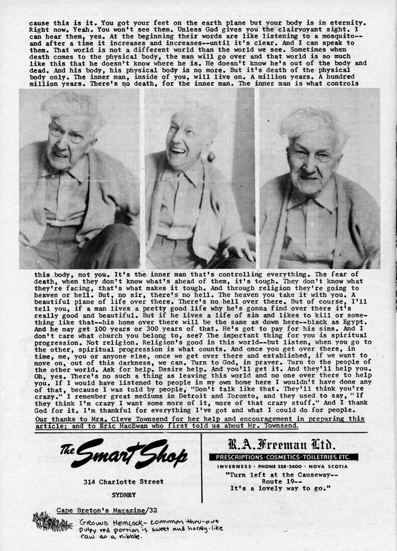 Published by Ronald Caplan on 1974/6/1 (506 reads)cause this is it. You got your feet on the earth plane but your body is in eternity. Right now* Yeah. You won't see them. Unless God gives you the clairvoyant sight. I can hear them, yes. At the beginning their words are like listening to a mosquito • and after a time it increases and increases • until it's clear. And I can speak to them. That world is not a different world than the world we see. Sometimes when death comes to the physical body, the man will go over and that world is so much like this that he doesn't know where he is. He doesn't know he's out of the body and dead. And his body, his physical body is no more. But it's death of the physical body only. The inner man, inside of you, will live on. A million years. A hundred million years. There's no death, for the inner man. The inner man is what controls J ?? this body, not you. It's the inner man that's controlling everything. The fear of death, when they don't know what's ahead of them, it's tough. They don't know what they're facing, that's what makes it tough. And through religion they're going to heaven or hell. But, no sir, there's no hell. The heaven you take it with you. A beautiful plane of life over there. There's no hell over there. But of course, I'll tell you, if a man lives a pretty good life why he's gonna find over there it's really good and beautiful. But if he lives a life of sin and likes to kill or some? thing like that • his home over there will be the same as down here • black as Egypt. And he may get 100 years or 300 years of that. He's got to pay for his sins. And I don't care what church you belong to, see? The important thing for you is spiritual progression. Not religion. Religion's good in this world • but listen, when you go to the other, spiritual progression is what counts. And once you get over there, in time, me, you or anyone else, once we get over there and established, if we want to move on, out of this darkness, we can. Turn to God, in prayer. Turn to the people of the other world. Ask for help. Desire help. And you'll get it. And they'll help you. Oh, yes. There's no such a thing as leaving this world and no one over there to help you. If I would have listened to people in my own home here I wouldn't have done any of that, because I was told by people, "Don't talk like that. They'll think you're crazy." I remember great mediums in Detroit and Toronto, and they used to say, "If they think I'm crazy I want some more of it, more of that crazy stuff." And I thank God for it, I'm thankful for everything I've got and what I could do for people. Our thanks to Mrs, Cleve Townsend for her help and encouragement in preparing this article; and to Brie MacEwan who first told us about Mr, Townsend. KA.lftttmm ICth. 314 Charlotte Street SYDNEY Cape Breton's Magazine/32 6??/'oc??'Jt> Hem LOCK- • X)rmnv)'?5-l?kt PRESCR PTIONSCOSMETCSTOILETR ES.ETC. INVERNESS • PHONE 2S8-2400 • NOVA SCOTIA "Turn left at the Causeway • Route 19 • It's a lovely way to go,"