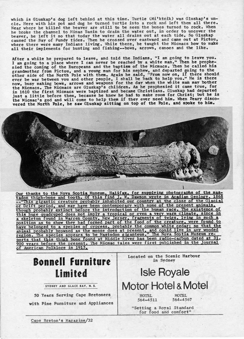Published by Ronald Caplan on 1974/10/1 (617 reads)which is Gluskap's dog left behind at this time. Turtle CMi'ktcik) was Gluskap's un? cle. Here with his pot and dog he turned turtle into a rock and left them all there. Near where he killed the beaver are still to be seen the bones turned to rock. When he broke the channel to Minas Basin to drain the water out, in order to uncover the beaver, he left it so that today the water all drains out at each tide. So Gluskap caused the Bay of Fundy tides. Then he crossed over eastward and came out at Pictou, where there were many Indians livii', While there, he taught the Micmacs how to make all their implements for hunting and fishing • bows, arrows, canoes and the like. After a while he prepared to leave, and told the Indians, "I am going to leave you, I am going to a place where I can never be reached by a white man." Then he prophe? sied the coming of the Europeans and the baptism of the Micmacs, Then he called his grandmother from Pictou, and a young man for his nephew, and departed going to the other side of the North Pole with them. Again he said, "From now on, it there should ever be war between you and other people, I shall be back to help you." He is there now, busy making bows, arrows and weapons for the day when the white man may bother the Micmacs, The Micmacs are Gluskap's children. As he prophesied it came true, for in 1610 the first Micmacs were baptized and became Christians. Gluskap had departed just a little before them, because he knew he had to make room for Christ; but he is the Micmac*s god and will come to help them if they ever need him. When Peary disco? vered the North Pole, he saw Gluskap sitting on top of the Pole, and spoke to him. Our thanks to the Nova Scotia Museum, Halifax, for supplying photographs of the mas? tadon thi'h-bone and tooth. Of this find J. W, Dawson wrote in Acadian Geology. 1868 • "This gigantic creature probably inhabited our country at the close of the Glacial or Drift period, and may have been contemporary with some of the present animals.' though probably extinct before the introduction of the human race. The existence of this huge quadruped does not imply a tropical or even a very warm climate| since m a skeleton found in Warren County. New Jersey, fragments of twigs, lying in such a position as to show they had formed part of the food of the creature, were found to have belonged to a species of cypress, probably the common white cedar: so that the animal probably browsed as the moose does at present, and could live m any wooded region. The species appears to be Mastodon giganteus," Ihe Nova Scotia Museum re"' ports that this thigh bone found at Middle River has been radio-carbon dated at 31. 900 years before the present. The Micmac tales were first published in the Journal of American Folklore in 1915, Bonnell Furniture Limited SYDNEY AND GLACE BAY, N. S. 50 Years Serving Cape Bretoners with Fine Furniture and Appliances Located on the Scenic Harbour in Sydney Isle Royale Motor Hotel & Motel HOTEL 564-4511 MOTEL 564-4567 "Setting a Royal Standard for food and comfort" Cape Breton's UdLga.zine/32
