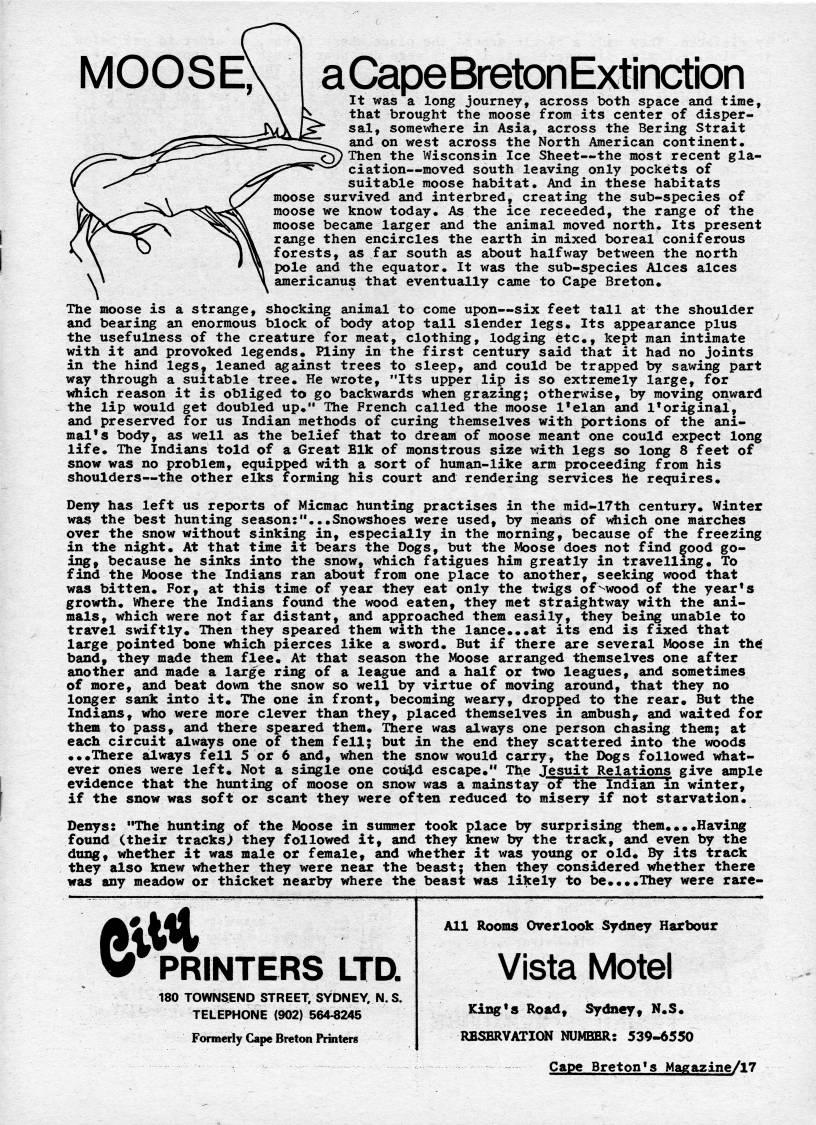 Published by Ronald Caplan on 1975/3/31 (4714 reads)MOOSEX a Cape Breton Extinction It was a long journey, across both space and time, that brought the moose from its center of disper? sal, somewhere in Asia, across the Bering Strait and on west across the North American continent. Then the Wisconsin Ice Sheet • the roost recent gla- ciation • moved south leaving only pockets of suitable moose habitat. And in these habitats moose survived and interbred, creating the sub-species of moose we know today. As the ice receeded, the range of the moose became larger and the animal moved north. Its present range then encircles the earth in mixed boreal coniferous forests, as far south as about halfway between the north pole and the equator. It was the sub-species Alces alces americanus that eventually came to Cape Breton. The moose is a strange, shocking animal to come upon • six feet tall at the shoulder and bearing an enormous block of body atop tall slender legs. Its appearance plus the usefulness of the creature for meat, clothing, lodging etc., kept man intimate with it and provoked legends. Pliny in the first century said that it had no joints in the hind legs, leaned against trees to sleep, and could be trapped by sawing part way through a suitable tree. He wrote, "Its upper lip is so extremely large, for which reason it is obliged to go backwards when grazing; otherwise, by moving onward the lip would get doubled up." The French called the moose l'elan and l??originai, and preserved for us Indian methods of curing themselves with portions of the ani? mal's body, as well as the belief that to dream of moose meant one could expect long life. The Indians told of a Great Elk of monstrous size with legs so long 8 feet of snow was no problem, equipped with a sort of human-like arm proceeding from his shoulders • the other elks forming his court and rendering services he requires. Deny has left us reports of Micmac hunting practises in the mid-17th century. Winter was the best hunting season:"...Snowshoes were used, by means of flfeich one marches over the snow without sinking in, especially in the morning, because of the freezing in the night. At that time it bears the Dogs, but the Moose does not find good go? ing, because he sinks into the snow, which fatigues him greatly in travelling. To find the Moose the Indians ran about from one place to another, seeking wood that was bitten. For, at this time of year they eat only the twigs of''wood of the year's growth. Where the Indians found the wood eaten, they met straightway with the ani? mals, which were not far distant, and approached them easily, they being unable to travel swiftly. Then they speared them with the lance...at its end is fixed that large pointed bone which pierces like a sword. But if there are several Moose in th' band, they made them flee. At that season the Moose arranged themselves one after another and made a large ring of a league and a half or two leagues, and sometimes of more, and beat down the snow so well by virtue of moving around, that they no longer sank into it. The one in front, becoming weary, dropped to the rear. But the Indians, who were more clever than they, placed themselves in ambush' and waited for them to pass, and there speared them. There was always one person chasing them; at each circuit always one of them fell; but in the end they scattered into the woods ...There always fell 5 or 6 and, when the snow would carry, the Dogs followed what? ever ones were left. Not a single one coty.d escape." The Jesuit Relations give ample evidence that the hunting of moose on snow was a mainstay of the Indian in winter, if the snow was soft or scant they were often reduced to misery if not starvation. Denys: "The hunting of the Moose in summer took place by surprising them....Having found (their tracks) they followed it, and they knew by the track, and even by the dung, whether it was male or female, and vdiether it was young or old. By its track they also knew whether they were near the beast; then they considered whether there was any meadow or thicket nearby where the beast was likely to be....They were rare- &&. PRINTERS LTD. 180 TOWNSEND STREET, SYDNEY, N. S. TELEPHONE (902) 564'245 Formerly Cape Breton Printers All Rooms Overlook Sydney Harbour Vista Motel King's Road, Sydney, N.S. RESERVATION NUMBER: 539-6550 Cape Breton's Magazine/17