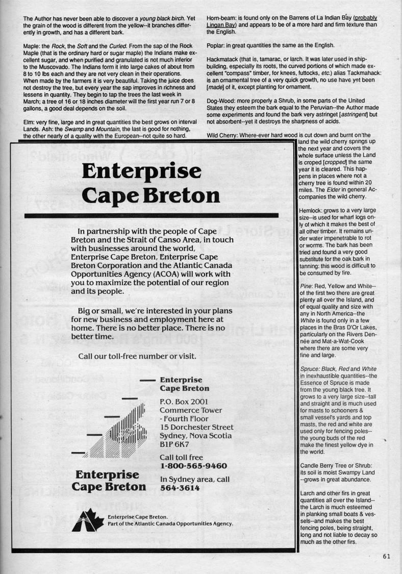 The Author has never been able to discover a young black birch. Yet the grain of the wood is different from the yellow-it branches differ? ently in growth, and has a different bark. Maple: the Rock, the Soft and the Curled. From the sap of the Rock Maple (that is the ordinary hard or sugar maple) the Indians make ex? cellent sugar, and when purified and granulated is not much inferior to the Muscovado. The Indians form it into large cakes of about from 8 to 10 lbs each and they are not very clean in their operations. When made by the farmers it is very beautiful. Taking the juice does not destroy the tree, but every year the sap improves in richness and lessens in quantity. They begin to tap the trees the last week in March; a tree of 16 or 18 inches diameter will the first year mn 7 or 8 gallons, a good deal depends on the soil. Elm: very fine, large and in great quantities the best grows on inten/al Lands. Ash: the Swamp and Mountain, the last is good for nothing, the other nearly of a quality with the European-not quite so hard. Horn-beam: is found only on the Barrens of La Indian Bay (probably Lingan Bav) and appears to be of a more hard and fimi texture than the English. Poplar: in great quantities the same as the English. Hackmatack (that is, tamarac, or larch. It was later used in ship? building, especially its roots, the curved portions of which made ex? cellent "compass" timber, for knees, futtocks, etc.) alias Tackmahack: is an ornamental tree of a very quick growth, no use have yet been [made] of it, except planting for ornament. Dog-Wood: more properly a Shmb, in some parts of the United states they esteem the bari< equal to the Peruvian-the Author made some experiments and found the bari< very astringet [astringent] but not absorbent-yet it destroys the sharpness of acids. Enterprise Cape Breton Wild Cherry: Where-ever hard wood is cut down and burnt on'the I land the wild cherry springs up [the next year and covers the whole surface unless the Land is croped [cropped] the same year it is cleared. This hap? pens in places where not a cherry tree is found within 20 miles. The Elder in general Ac? companies the wild cherry. In partnership with the people of Cape Breton and the Strait of Canso Area, in touch with businesses around the world. Enterprise Cape Breton, Enterprise Cape Breton Corporation and the Atlantic Canada Opportunities Agency (ACOA) will work with you to maximize the potential of our region and its people. Big or small, we're interested in your plans for new business and employment here at home. There is no better place. There is no better time. Call our toll-free number or visit. Enterprise Cape Breton Enterprise Cape Breton P.O. Box 2001 Commerce Tower - Fourth Floor 15 Dorchester Street Sydney, Mova Scotia BIP 6K7 Call toll free 1-800-565-9460 In Sydney area, call 564-3614 4' #?? Enterprise Cape Breton. Part of the Atlantic Canada Opportunities Agency. Hemlock: grows to a very large size-is used for whart logs on? ly of which it makes the best of all other timber. It remains un? der water impenetrable to rot or worms. The bari< has been tried and found a very good substitute for the oak bari< in tanning: this wood is difficult to be consumed by fire. Pine: Red, Yellow and White- of the first two there are great plenty all over the Island, and of equal quality and size with any in North America-the White is found only in a few places in the Bras D'Or Lakes, particularly on the Rivers Den- nee and Mat-a-Wat-Cook where there are some very fine and large. Spruce: Black, Red and White in inexhaustible quantities-the Essence of Spruce is made from the young black tree. It grows to a very large size-tall and straight and is much used for masts to schooners & small vessel's yards and top masts, the red and white are used only for fencing poles- the young buds of the red make the finest yellow dye in the world. Candle Berry Tree or Shrub: its soil is moist Swampy Land -grows in great abundance. Larch and other firs in great quantities all over the Island- the Larch is much esteemed in planking small boats & ves- sels-and makes the best fencing poles, being straight, long and not liable to decay so much as the other firs. 61