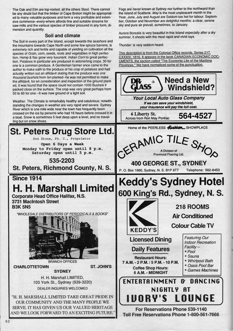 The Oak and Elm are top-rooted; all the others Stool. There cannot be any doubt but that the timber of Cape Breton might be appropriat? ed to many valuable purposes and form a very profitable and exten? sive commerce-every-where affords fine and suitable streams for saw-mills and the various species of timber procured in any form, di? mension and quantity. Soil and climate The Soil in every part of the Island, except towards the seashore and the mountains towards Cape North and some few spruce barrens, is extremely rich and fertile and capable of yielding on cultivation ail the species of Grain, corn, seeds, roots and vegetables in high perfec? tion. Hemp & flax grow very luxuriant. Indian Corn to great perfec? tion. Potatoes in particular are produced in astonishing crops. 30 for one is a common produce. A Gentleman farmer once came to the author to make oath to the produce of his crop of potatoes and had actually written out an affidavit stating that the produce was one thousand bushels from ten planted-he was not permitted to make the affidavit, for on consideration and inspection of the ground plant? ed, it was found that the space could not contain 1000 Bushels if packed close on the surface. The crop was very great perhaps from 50 to 60 for one.-lt was new ground of a light soil. Weather. The Climate is remarkably healthy and salubrious; notwith? standing the changes in weather are very rapid and severe. Sydney River which is one mile wide near the town has frequently been crossed on the ice by persons who had 16 hours before crossed it in a boat. Snow is sometimes 5 feet deep upon a level, and no travel- ling but on snow shoes. Fogs are never known at Sydney nor further to the northward than the Island of Scatterie. May is the most unpleasant month in the Year. June, July and August are Seldom too hot for labour. Septem? ber, October and November are delightful months: a clear, serene sky and pure air prevail, sometimes, to January. Aurora Borealis is very beautiful in this Island especially after a dry summer, it shoots with the most rapid and vivid rays. Thunder: is very seldom heard. This description is from the Colonial Office records. Series 217. CXXXIV. 1816. It appears in the book CANADIAN ECONOMIC DOC? UMENTS, the section called "The Economic Life of the Maritime Provinces." We have normalized some of the punctuation. fW' Need a New Windshield? Your Local Auto Glass Company If we can save your windshield, your Insurance will pay the full cost. 6 Liberty St. 'Rd'd'Ol Across from Ron May Pontiac '??/v*T T%/' f St. Peters Drug Store Ltd, Don Stone, Ph. C, Proprietor Open 6 Days a Week Monday to Friday open until 8 p.m. Saturday open until 5 p.m. 535-2203 St. Peters, Richmond County, N. S. Home of the PEERLESS ' • Al0??i- SHOWPLACE • 'y'' A Division of // %'' Provincial Floorina Ltd. > Provincial Flooring Ltd. 'Qo 400 GEORGE ST., SYDNEY P. O. Box 1660, Sydney. N. S. Bl P 6T7 Telephone: 562-8453 Since 1914 H. H. Marshall Limited Corporate Head Office Halifax, N.S. 3731 Macintosh Street B3K5N5 "WHOLESALE DISTRIBUTORS OF PERIODICALS & BOOKS" 4'' Keddy's Sydney Hotel 600 King's Rd., Sydney, N. S. KEDDY'S 218ROOIUIS Air Conditioned Colour Cable TV ST. JOHN'S BRANCH OFFICES CHARLOTTETOWN SYDNEY H. H. Marshall LIMITED, 103 York St., Sydney (539-3220) DEALER INQUIRIES WELCOMED "H. H. MARSHALL LIMITED TAKE GREAT PRIDE IN OUR COMMUNITY AND THE MANY PEOPLE WE SERVE. IT HAS GIVEN US OUR VALUED HERITAGE AND WE LOOK FORWARD TO AN EXCITING FUTURE." Licensed Dining Daily Features Restaurant Hours: 7 A.M. - 2 P.M. / 5 P.M. -10 P.M. Coffee Shop Hours: 6 A.M. - MIDNIGHT Featuring Our Indoor Recreation Facility ~ ''Pool • Sauna o Whirlpool Bath ?? Oasis Pool Bar • Games Machines ENTERTRrNMENT & DRNCING NIGHTLY RT lUORV'S LOUNGE For Reservations Phone 539-1140 Toll Free Reservations Phone 1-800-561-7666