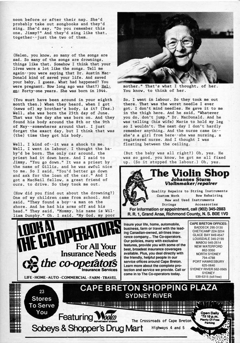 noon before or after their nap. She'd probably take out songbooks and they'd sing. She'd say, "Do you remember this one, Jimmy?" And they'd sing like that, together--just the two of them. (Helen, you know, so many of the songs are sad. So many of the songs are drownings, things like that. Somehow I think that your lives were a lot like the songs. Tell me again--you were saying that Dr. Austin Mac? Donald kind of saved your life. And saved your baby, I guess. What had happened? You were pregnant. How long ago was that?) Hel- sn: Forty-one years. She was born in 1944. (You must have been around in your eighth month then.) When they heard, when I got (news of) my brother's body, is it? (Yes.) Well, she was born the 25th day of June. That was the day she was born on. And they found his body around the 8th or the 9th of May--somewheres around that. I just forget the exact day, but I think that was (the) time they got his body. Well, I kind of--it was a shock to me. Well, I went in labour. I thought the ba? by' d be born. The only car around, the priest had it down here. And I said to Jimmy, "You go down." It was a priest by the name of Gillis, and he was awful nice to me. So I said, "You'd better go down and ask for the loan of the car." And I got a MacNeil fellow, a great friend of ours, to drive. So they took me out. (How did you find out about the drowning?) One of my children came from school. And said, "They found a boy--a man on the shore. And he had his arms off and his head." They said, "Mommy, his name is Wil- liam Dunphy." Oh. I said, "My God, my poor mother." That's what I thought, of her. You know, to think of her. So, I went in labour. So they took me out there. That was the worst needle I ever got. I don't mind needles. He gave it to me in the thigh here. And he said, "Whatever you do, don't jump." Dr. MacDonald. And he was telling (his wife) Marie to hold my leg so I wouldn't. The next day I don't hardly remember anything. And the nurse came in-- she's a girl from here--she was nursing, a registered nurse. And I thought I was floating between the ceiling. (But the baby was all right?) Oh, yes. He was so good, you know, he got me all fixed up. (So it stopped the labour.) Oh, yes. The Violin Shop ' Johannes Sturm Violinmaker/repairer Quality Repairs to String Instruments Custom Work Bow Rehairing New and Used Instruments Strings Accessories For information or appointment, call (902) 345-2883 R. R. 1, Grand Anse, Richmond County, N. S. BOE 1V0 For All Your Insurance Needs oS the co-opei'toi?? ''0 Insurance Services LIFE • HOME • AUTO • COMMERCIAL • FARM • TRAVEL Insure your life, home, automobile, business, farm or travel with the lead? ing Canadian-owned, all-lines insu? rance company... The Co-operators. Our policies, many with exclusive features, provide you with some of the best, broadest insurance coverages available. Plus, you deal directly with the friendly, helpful people in our service offices around Cape Breton. Learn more about the complete pro? tection and service we provide. Call or come in to The Co-operators today. CAPE BRETON OFFICES: BADDECK 295-3130 CHETICAMP 224-3204 GLACE BAY 849-4547 LOUISDALE 345-2199 MABOU 945-2514 NEW WATERFORD 862-3350 NORTH SYDNEY 794-4788 PORT HAWKESBURY 625-0640 SYDNEY RIVER 562-0565 SYDNEY 539-6315 (toll free) Stores To Serve You CAPE BRETON SHOPPING PLAZA SYDNEY RIVER m' Featuring 'Wo ocrARTMiNTtrontt The Crossroads of Cape Breton' Sobeys & Shopper's Drug Mart "'s'-''' * "?i = Parking