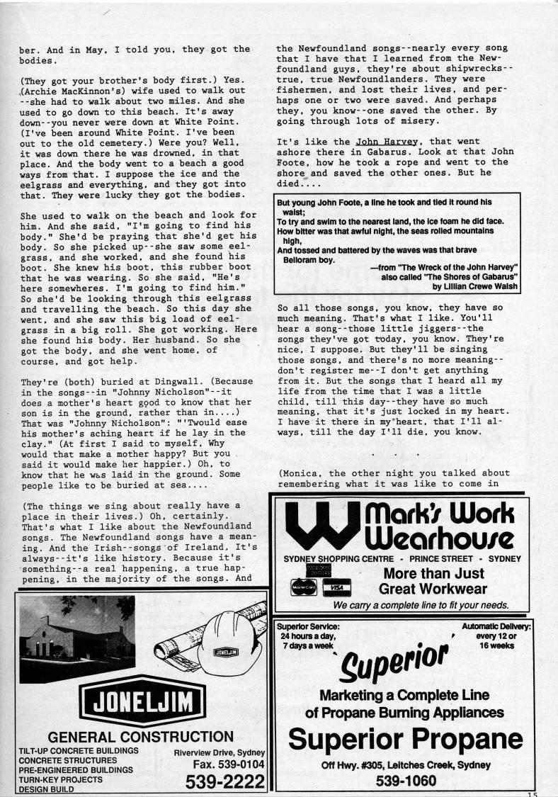 ber. And in May, bodies. I told you, they got the (They got your brother's body first.) Yes. (Archie MacKinnon's) wife used to walk out --she had to walk about two miles. And she used to go down to this beach. It's away down--you never were down at White Point. (I've been around White Point. I've been out to the old cemetery.) Were you? Well, it was down there he was drowned, in that place. And the body went to a beach a good ways from that. I suppose the ice and the eeigrass and everything, and they got into that. They were lucky they got the bodies. She used to walk on the beach and look for him. And she said, "I'm going to find his body." She'd be praying that she'd get his body. So she picked up--she saw some eel- grass, and she worked, and she found his boot. She knew his boot, this rubber boot that he was wearing. So she said, "He's here somewheres. I'm going to find him." So she'd be looking through this eeigrass and travelling the beach. So this day she went, and she saw this big load of eel- grass in a big roll. She got working. Here she found his body. Her husband. So she got the body, and she went home, of course, and got help. They're (both) buried at Dingwall. (Because in the songs--in "Johnny Nicholson"--it does a mother's heart good to know that her son is in the ground, rather than in....) That was "Johnny Nicholson": "'Twould ease his mother's aching heart if he lay in the clay." (At first I said to myself. Why would that make a mother happy? But you said it would make her happier.) Oh, to know that he was laid in the ground. Some people like to be buried at sea.... (The things we sing about really have a place in their lives.) Oh, certainly. That's what I like about the Newfoundland songs. The Newfoundland songs have a mean? ing. And the Irish--songs"of Ireland. It's always--it's like history. Because it's -something--a real happening, a true hap? pening, in the majority of the songs. And JONELJIM GENERAL CONSTRUCTION TILT-UP CONCRETE BUILDINGS CONCRETE STRUCTURES PRE-ENGINEERED BUILDINGS TURN-KEY PROJECTS DESIGN BUILD Riverview Drive, Sydney Fax. 539-0104 539-2222 the Newfoundland songs--nearly every song that I have that I learned from the New? foundland guys, they're about shipwrecks-- true, true Newfoundlanders. They were fishermen, and lost their lives, and per? haps one or two were saved. And perhaps they, you know--one saved the other. By going through lots of misery. It's like the John Harvey, that went ashore there in Gabarus. Look at that John Foote, how he took a rope and went to the shore and saved the other ones. But he died.... But young John Foote, a line he took and tied It round his waist; To try and swim to the nearest land, the Ice foam he did face. How bitter was that awful night, the seas rolled mountains high, And tossed and battered by the waves was that brave Belloram boy. • from "The Wreck of the John Harvey" also called 'The Shores of Gabarus" by Lillian Crewe Walsh So all those songs, you know, they have so much meaning. That's what I like. You'll hear a song--those little jiggers--the songs they've got today, you know. They're nice, I suppose. But they'll be singing those songs, and there's no more meaning-- don't register me--I don't get anything from it. But the songs that I heard all my life from the time that I was a little child, till this day--they have so much meaning, that it's just locked in my heart. I have it there in my"heart, that I'll al? ways, till the day I'll die, you know. (Monica, the other night you talked about remembering what it was like to come in W mark'/ UJork UJeorhou/e SYDNEY SHOPPING CEKTRE - PRINCE STREET - SYDNEY ''B'' More than Just mm {'3 Great Workwear We carry a complete line to fit your needs. Superior Servtoe: 24 hours a day, 7 days a week Qiperior Automatic Delivery: I every 12 or 16week9 Marketing a Complete Line of Propane Burning Appliances Superior Propane Off Hwy. #305, URches Creek, Sydney 539-1060