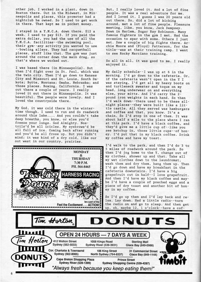 Published by Ronald Caplan on 1991/6/1 (329 reads)other job, I worked in a plant, down in Boston there. Out in the Midwest, in Min? neapolis and places, this promoter had a nightclub he owned. So I used to get work in there. That kept me in pocket money. I stayed in a Y.M.C.A. down there. $12 a week. I used to pay $13. If you paid the extra dollar, you had the use of all the Y.M.C.A. facilities--the swimming pool, their gym--any activity you wanted to use --bowling alleys. They had racquetball places, stuff like that. The gym was just around the corner down the main drag, so that's where we worked out. I was based there (in Minneapolis). But then I'd fight over in St. Paul, which was the twin city. Then I'd go down to Kansas City and Missouri and St. Louis, South Da? kota; Butte, Montana; Omaha, Nebraska; and those places. Boxing. California. I was out there a couple of years. I really loved it out there in Minneapolis. It was beautiful. The people were lovely. And I loved the countryside there. My God, it was cold there in the winter? time though. I used to run and do roadwork around this lake.... And you couldn't take deep breaths, you know, or else you'd freeze your lungs. God Almighty. Nos? trils 'd be all icicles. My eyebrows'd be all full of ice. Coming back after running and you'd be all froze up. But you didn't mind; it was kind of a dry cold, like our out west in our country, prairies. be a part of the ( Feel the Excitement... ACTION! S But, I really loved it. And a lot of fine people. It was a real adventure for me. And I loved it. I guess I was 20 years old out there. So, did a lot of kicking around, met a lot of fine people. Pleasure meeting, like, you know. Jack Dempsey. Down in Harlem, Sugar Ray Robinson. Many famous fighters in the gym I met. Had the occasion to spar with some. Others I just met. Saw a couple of big fights there. Ar? chie Moore and (Floyd) Patterson, for the title--was at their training camp. I went to see Rocky Marciano training. So all in all, it was good to me. I really enjoyed it. My daily schedule--I was up at 6 in the morning. I'd go down to the cafeteria. Or, if the cafeteria wasn't open in the Y I was staying, I'd get all my heavy boots on and turtleneck sweater and toque on my head, long underwear on and everything else, your mitts. And I'd carry the 2- pound iron weights in each hand. So then I'd walk down--there used to be these all- night places--they were built like a lit? tle castle. All they served was hamburgers and coffee and that, you know. It's a chain. So I'd stop in one of them. It was about half a mile to the place where I ran at this park. I'd have a black coffee, and they'd give me a little cup of--like you see ketchup in, those little cups--of hon? ey. I'd put that in my black coffee. Drink my coffee and have my toast. I'd walk to the park, and then I'd do 3 to 5 miles of roadwork around the park. So then I'd jog home to the Y, change out of my clothes, shower up and that. Take all my wet clothes down to the laundromat, wash them and dry them, hang them up. Then I'd go down and have my breakfast in the cafeteria downstairs. I'd have a big grapefruit cut in half--I love grapefruit. And then I'd have my black coffee and may? be I'd have a couple of poached eggs and a piece of dry toast and another bit of hon? ey in my coffee. So I'd go up then and I'd lay back and re? lax. Lay down. Had a little radio--turn the radio on and go to sleep. And then get up, oh, maybe 12, 1 o'clock--have a cof- SJe -''O'ctbK DOIMU 7' rfo''itft ( OPEN 24 HOURS • 7 DAYS A WEEK"! 1111111 DONUTS 412 Welton street Sydney (562-5033) 1058 Kings Road Sydney River (539-3931) Sterling Mall Glace Bay (849-0988) Cor. Charlotte & Townsend Sydney (562-8085) 106 King Street North Sydney (794-8337) 31 Commercial Street Glace Bay (849-1144) Cape Breton Shopping Plaza Sydney River (539-1399) Prince Street Sydney Shopping Centre (539-4287) "Always fresh because you keep eating them!" IfMilif