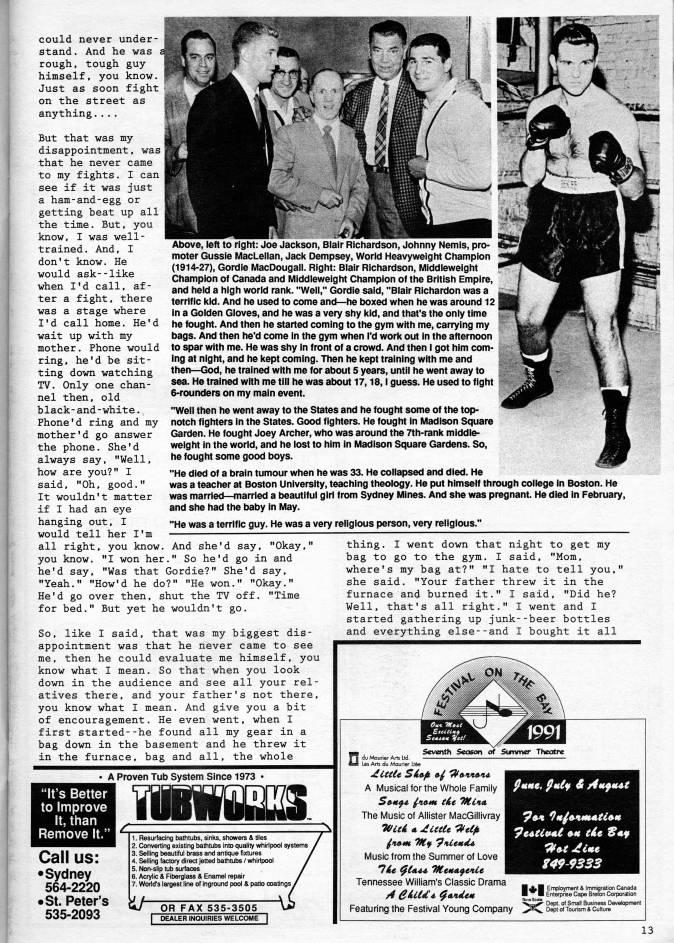 Published by Ronald Caplan on 1991/6/1 (346 reads)could never under? stand. And he was rough, tough guy himself, you know. Just as soon fight on the street as anything.... But that was my disappointment, was that he never came to my fights. I can see if it was just a ham-and-egg or getting beat up all the time. But, you know. I was well- trained. And. I don't know. He would ask--like when I'd call, af? ter a fight, there was a stage where I'd call home. He'd wait up with my mother. Phone would ring, he'd be sit? ting down watching TV. Only one chan? nel then, old black-and-white. Phone'd ring and my mother'd go answer the phone. She'd always say. "Well, how are you?" I said, "Oh, good." It wouldn't matter if I had an eye hanging out, I would tell her I'm all right, you know. And she'd say, "Okay," you know. "I won her." So he'd go in and he'd say, "Was that Gordie?" She'd say, "Yeah." "How'd he do?" "He won." "Okay." He'd go over then, shut the TV off. "Time for bed." But yet he wouldn't go. So, like I said, that was my biggest dis? appointment was that he never came to see me, then he could evaluate me himself, you know what I mean. So that when you look down in the audience and see all your rel? atives there, and your father's not there, you know what I mean. And give you a bit of encouragement. He even went, when I first started--he found all my gear in a bag down in the basement and he threw it in the furnace, bag and all, the whole Above, left to right: Joe Jackson, Blair Richardson, Johnny Nemis, pro- SS'i meter Gussie MacLellan, Jack Dempsey, World Heavyweight Champion (1914-27), Gordie MacDougall. Right: Blair Richardson, Middleweight Champion of Canada and Middleweight Champion of the British Empire, and held a high world rank. "Well," Gordie said, "Biair Richardon was a terrific kid. And he used to come and • he boxed when he was around 12 in a Golden Gloves, and he was a very shy kid, and that's the only time he fought. And then he started coming to the gym with me, carrying my bags. And then he*d come in the gym when i*d work out in the afternoon to spar with me. He was shy in front of a crowd. And then I got him com? ing at night, and he kept coming. Then he kept training with me and then • God, he trained with me for about 5 years, until he went away to f|-5' sea. He trained with me till he was about 17,18,1 guess. He used to fight W' 6-rounders on my main event. "Well then he went away to the States and he fought some of the top- notch fighters in the States. Good fighters. He fought In Madison Square Garden. He fought Joey Archer, who was around the 7th-rank middle? weight in the world, and he lost to him in Madison Square Gardens. So, he fought some good boys. "He died of a brain tumour when he was 33. He collapsed and died. He was a teacher at Boston University, teaching theology. He put himself through college In Boston. He was married • married a beautiful girl from Sydney Mines. And she was pregnant. He died In February, and she had the baby In May. "He was a terrific guy. He was a very religious person, very religious." thing. I went down that night to get my bag to go to the gym. I said, "Mom, Where's my bag at?" "I hate to tell you," she said. "Your father threw it in the furnace and burned it." I said. "Did he? Well, that's all right." I went and I started gathering up junk--beer bottles and everything else--and I bought it all A Proven Tub System Since 1973 "It's Better to Improve It, than Remove It." Call us: • Sydney 564-2220 • St. Peter's 535-2093 1. Resurfacing bathtubs, sinks, showers & tiles 2. Converting existing battitubs into quality whirlpool systems ' 3. Selling beautiful brass and antique fixtures 4. Selling factory direct jetted bathtubs /whirlpool 5. Non-slip tub surfaces 6. Acrylic & Fiberglass & Enamel repair 7. World's largest line of inground pool & patio coatingsi >L/- OR FAX 535-3505 DEALER INQUIRIES WELCOME | Seventh Season of Sinvtier Theatre Sdu Maurier Arts Ltd. Les Arts du Maurier Ltee A Musical for the Whole Family S'Hfd fn&m; tit TKCtiL The Music of Allister MacGillivray TOiti a, 4UU • ''UfL Music from the Summer of Love Tennessee William's Classic Drama A CiiUU 'a'fUtti Featuring the Festival Young Company r49-9333 1'1 Enifi'oyment & Immigration Canada ?? 'B Enterprise Cape Breton Corporation Dept. of Small Business De* Dept of Tourism & Culture 13