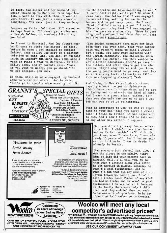 Published by Ronald Caplan on 1991/6/1 (570 reads)In fact, his sister and her husband--my uncle--moved up to Montreal from Cape Bre? ton. I went to stay with them, I went to work there. It was just a candy store or something. You know, just to keep me busy. Because my father felt that if I stayed on in Cape Breton. I'd never get a nice man. a Jewish fellow, or somebody like that, you know! So I went to Montreal. And (my future hus? band) came to visit his sister. In fact, before he came I got engaged to another fellow. That fellow was sort of a distant relative of ours. And. you see. my husband lived in Sudbury and he'd only come once a year or twice a year to Montreal. So this fellow came, and my parents said. "Look, if you want to marry, you go ahead." So. we got engaged, you know. So then, while we were engaged, my husband came to visit his sister. And he said, "Let's go to spend a nice evening out. Go GRANNY'S'PECIAL qifTS "Exclusive ' ""'"" '" GIFT BASKETS for All Occasions" WE DELIVER! 564-8257 lue Gift Service Making Your Gift Giving Easy, Convenient & Enjoyable • Cape Breton Gift Baskets • f/lother/Baby Baskets Hospital Care Baskets • Bath & Soap Baskets • Diabetic Baskets • Children's Gift Baskets • Condolence Baskets 5 FERRY ST., SYDNEY to the theatre and have something to eat." I said, "All right, we'll go." So when I came back, the fellow that I was engaged to was sitting waiting for me in the house. And he got very upset. So I said. "Look, I didn't marry you yet." I said. "Here is your ring back." I was engaged to him. he gave me a nice ring. "Here is your ring. And goodbye." And from then on, that was the end! Rose laughs. (The Jewish community here must not have been very big even then, that your father felt you weren't going to find a Jewish boy.) Yeah. You know what happened with the Jewish community. The children, when they were big enough, and they wanted to get a better education, they'd go away to the cities. And after they'd get the edu? cation, they'd stay there. And, you know, the young people used to go away, and they weren't coming back. (As early as 1920-- this was happening already?) Yeah. And living in New Waterford--in those days, you know, to get to Sydney--we didn't have cars in those days. And to get to Sydney and to mix--it was kind of hard. And I wasn't a great mixer, either. So-- that was the only way for me to get a Jew? ish man was to go up to Montreal! (Was it important to you--or was it impor? tant to your dad--that you marry a Jewish man?) I think my father, it was important to him. And I don't think I'd be interest? ed any other way either, I suppose. Wefcome to your ' ftonte azuay from home! These signs invite you to come make new friends and experience a unique way to enjoy Cape Breton's famed hospitality. For more information, drop in at any Cape Breton Tourist Bureau or write to P.O. Box 144 Sydney, N.S. B1P6R7 1-800-665-9460 'ienvenue cfiez nous! Aux etablissements arborant ces enseignes, vous trouverez des hotes chaleureux qui vous feront decouvrir I'hospitalite Iegendaire du Cap-Breton, Pour plus de renseignements, adressez-vous a n'importe quel bureau d'information touristique du Cap-Breton ou ecrivez d C.P. 1448 Sydney (N.E) B1P6R7 1-800-665-9460 _ • A program of: Une Initiative de: • J' Enterprise Societe ??''Bk Cape Breton d'expansion HmmW Corporation du Cap-Breton (But you didn't go away for an educa? tion.) No, I didn't have the chance. And my father couldn't afford it. But you know, when I came here, I was al? ready 13 years old. And I had my edu? cation in Russia. I was in Grade 7 already in Russia. (And you were born there.) Yes. 1900. I was the oldest in the family. (What kind of life did your parents have in Russia?) Well, I'll tell you. My fa? ther wasn't getting along well after he got married in Russia. Because, he wasn't a good businessman. And he wasn't a man that did any kind of a.... Irving Schwartz. Rose's son: Didn't have a trade. Rose: Trade, of any kind. (He had no trade, and he wasn't a good businessman.) He was bad at it because in the family there were only 3 chil? dren. And they cuddled them too much. So he was sort of--you know. So he de? cided that he'd rather go to America. mko DEPARTMENT STORES Celebrating 25 Years of Savings 'at our Sydney Rivery Location CAPE BRETON SHOPPING PLAZA - SYDNEY RIVER MAYFLOWER MALL - GRAND LAKE ROAD - SYDNEY PORT HAWKESBURY SHOPPING CENTRE WooIco will meet any local competitors advertised prices* 'OTHERS SAY IT... WOOLCO GUARANTEES IT! Just bring in any CompetHor's current Ad. If our price on the identical item isn't already as low, or lower than their advertised price we will immediately meet their price! We exclude gimmici< promotions (Scratch & Save), & entire Department, entire Store percentage off Promottons. We reserve the right to limit quantities. USE OUR CONVENIENT LAYAWAY PLAN 16