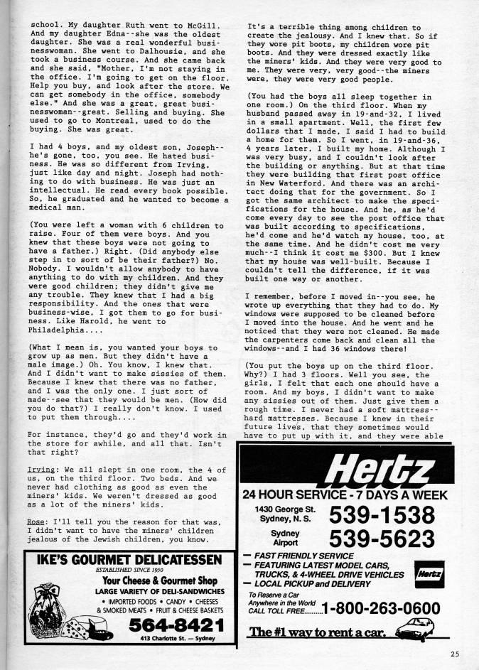 Published by Ronald Caplan on 1991/6/1 (367 reads)school. My daughter Ruth went to McGill. And my daughter Edna--she was the oldest daughter. She was a real wonderful busi? nesswoman. She went to Dalhousie, and she took a business course. And she came back and she said. "Mother. I'm not staying in the office. I'm going to get on the floor. Help you buy, and look after the store. We can get somebody in the office, somebody else." And she was a great, great busi? nesswoman- -great . Selling and buying. She used to go to Montreal, used to do the buying. She was great. I had 4 boys, and my oldest son, Joseph-- he's gone, too, you see. He hated busi? ness. He was so different from Irving, just like day and night. Joseph had noth? ing to do with business. He was just an intellectual. He read every book possible. So, he graduated and he wanted to become a medical man. (You were left a woman with 6 children to raise. Four of them were boys. And you knew that these boys were not going to have a father.) Right. (Did anybody else step in to sort of be their father?) No. Nobody. I wouldn't allow anybody to have anything to do with my children. And they were good children; they didn't give me any trouble. They knew that I had a big responsibility. And the ones that were business-wise, I got them to go for busi? ness. Like Harold, he went to Philadelphia.... (What I mean is, you wanted your boys to grow up as men. But they didn't have a male image.) Oh. You know, I knew that. And I didn't want to make sissies of them. Because I knew that there was no father, and I was the only one. I just sort of made--see that they would be men. (How did you do that?) I really don't know. I used to put them through.... For instance, they'd go and they'd work in the store for awhile, and all that. Isn't that right? Irving: We all slept in one room, the 4 of us, on the third floor. Two beds. And we never had clothing as good as even the miners' kids. We weren't dressed as good as a lot of the miners' kids. Rose: I'll tell you the reason for that was, I didn't want to have the miners' children jealous of the Jewish children, you know. IKE'S GOURMET DELICATESSEN ESTABUSHED SINCE 1950 Your Cheese & Gourmet Shop LARGE VARIETY OF DELI-SANDWICHES • IMPORTED FOODS • CANDY • CHEESES & SMOKED MEATS • FRUIT & CHEESE BASKETS 564-8421 413 Chariotte St. • Sydney It's a terrible thing among children to create the jealousy. And I knew that. So if they wore pit boots, my children wore pit boots. And they were dressed exactly like the miners' kids. And they were very good to me. They were very, very good--the miners were, they were very good people. (You had the boys all sleep together in one room.) On the third floor. When my husband passed away in 19-and-32. I lived in a small apartment. Well, the first few dollars that I made. I said I had to build a home for them. So I went, in 19-and-36. 4 years later. I built my home. Although I was very busy, and I couldn't look after the building or anything. But at that time they were building that first post office in New Waterford. And there was an archi? tect doing that for the government. So I got the same architect to make the speci? fications for the house. And he. as he'd come every day to see the post office that was built according to specifications, he'd come and he'd watch my house, too. at the same time. And he didn't cost me very much--I think it cost me $300. But I knew that my house was well-built. Because I couldn't tell the difference, if it was built one way or another. I remember, before I moved in--you see. he wrote up everything that they had to do. My windows were supposed to be cleaned before I moved into the house. And he went and he noticed that they were not cleaned. He made the carpenters come back and clean all the windows--and I had 36 windows there! (You put the boys up on the third floor. Why?) I had 3 floors. Well you see. the girls, I felt that each one should have a room. And my boys. I didn't want to make any sissies out of them. Just give them a rough time. I never had a soft mattress-- hard mattresses. Because I knew in their future lives, that they sometimes would have to put up with it, and they were able Hertz 24 HOUR SERVICE - 7 DAYS A WEEK 1430 George St. Sydney, N.S. Sydney Airport 539-1538 539-5623 • FAST FRIENDLY SERVICE • FEATURING LATEST MODEL CARS, TRUCKS, & 4'WHEEL DRIVE VEHICLES iMBftzk • LOCAL PICKUP and DELIVERY To Reserve a Car Anywhere In the World CALL TOLL FREE. 1-800-263-0600 The #1 way to rent a car. 25