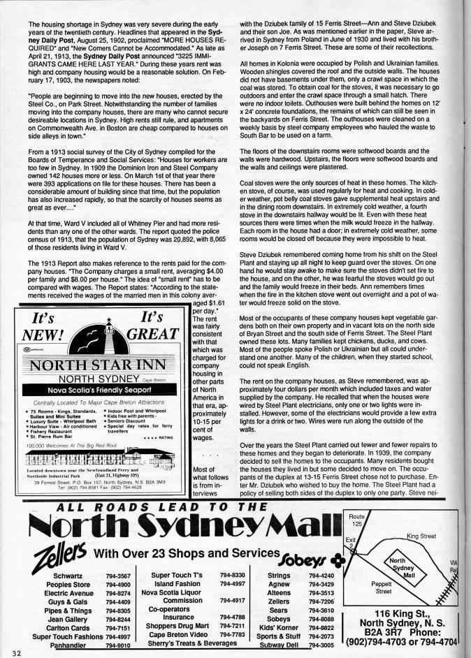 Published by Ronald Caplan on 1991/6/1 (347 reads)The housing shortage in Sydney was very severe during the eariy years of the twentieth century. Headlines that appeared in the Syd? ney Dally Post, August 25,1902, proclaimed "MORE HOUSES RE? QUIRED" and "New Comers Cannot be Accommodated." As late as April 21,1913, the Sydney Daily Post announced "3225 IMMI? GRANTS CAME HERE LAST YEAR." During these years rent was high and company housing would be a reasonable solution. On Feb? ruary 17,1903, the newspapers noted: "People are beginning to move into the new houses, erected by the Steel Co., on Pari< Street. Notwithstanding the number of families moving into the company houses, there are many who cannot secure desireable locations in Sydney. High rents still rule, and apartments on Commonwealth Ave. in Boston are cheap compared to houses on side alleys in town." with the Dziubek family of 15 Ferris Street • Ann and Steve Dziubek and their son Joe. As was mentioned eariier in the paper, Steve ar? rived in Sydney from Poland in June of 1930 and lived with his broth? er Joseph on 7 Fenris Street. These are some of their recollections. All homes in Kolonia were occupied by Polish and Ukrainian families. Wooden shingles covered the roof and the outside walls. The houses did not have basements under them, only a crawl space in which the coal was stored. To obtain coal for the stoves, it was necessary to go outdoors and enter the crawl space through a small hatch. There were no indoor toilets. Outhouses were built behind the homes on 12' X 24' concrete foundations, the remains of which can still be seen in the backyards on Ferris Street. The outhouses were cleaned on a weekly basis by steel company employees who hauled the waste to South Bar to be used on a farm. From a 1913 social survey of the City of Sydney compiled for the Boards of Temperance and Social Services: "Houses for wori