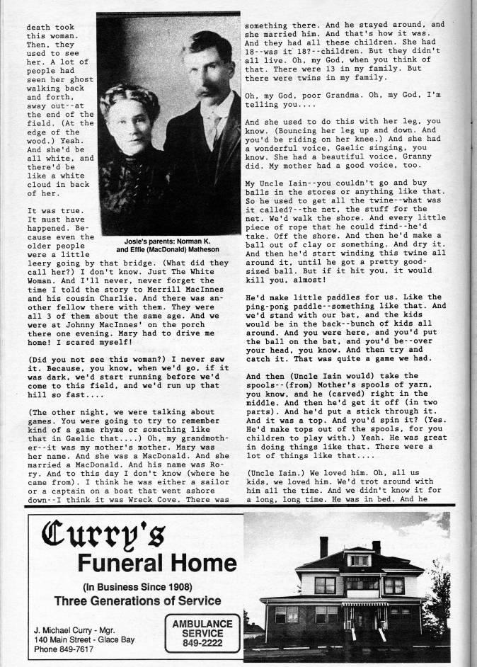 Josie's parents: Norman K. and Effie (MacDonald) Matheson death took this woman. Then, they used to see her. A lot of people had seen her ghost walking back and forth, away out - - at the end of the field. (At the edge of the wood.) Yeah. And she'd be all white, and there'd be like a white cloud in back of her. It was true. It must have happened. Be? cause even the older people were a little leery going by that bridge. (What did they call her?) I don't know. Just The White Woman. And I'll never, never forget the time I told the story to Merrill Maclnnes and his cousin Charlie. And there was an? other fellow there with them. They were all 3 of them about the same age. And we were at Johnny Maclnnes' on the porch there one evening. Mary had to drive me home! I scared myself! (Did you not see this woman?) I never saw it. Because, you know, when we'd go, if it was dark, we'd start running before we'd come to this field, and we'd run up that hill so fast.... (The other night, we were talking about games. You were going to try to remember kind of a game rhyme or something like that in Gaelic that....) Oh, my grandmoth? er- -it was my mother's mother. Mary was her name. And she was a MacDonald. And she married a MacDonald. And his name was Ro? ry. And to this day I don't know (where he came from). I think he was either a sailor or a captain on a boat that went ashore down--I think it was Wreck Cove. There was something there. And he stayed around, and she married him. And that's how it was. And they had all these children. She had 18--was it 18?--children. But they didn't all live. Oh, my God, when you think of that. There were 13 in my family. But there were twins in my family. Oh, my God, poor Grandma. Oh, my God, I'm telling you.... And she used to do this with her leg, you know. (Bouncing her leg up and down. And you'd be riding on her knee.) And she had a wonderful voice, Gaelic singing, you know. She had a beautiful voice. Granny did. My mother had a good voice, too. My Uncle Iain--you balls in the stores So he used to get a it called?--the net net. We'd walk the piece of rope that take. Off the shore ball out of clay or And then he'd start around it, until he sized ball. But if kill you, almost! couldn't go and buy or anything like that. 11 the twine--what was the stuff for the shore. And every little he could find--he'd And then he'd make a something. And dry it. winding this twine all got a pretty good- it hit you, it would He'd make little paddles for us. Like the ping-pong paddle--something like that. And we'd stand with our bat. and the kids would be in the back--bunch of kids all around. And you were here, and you'd put the ball on the bat, and you'd be--over your head, you know. And then try and catch it. That was quite a game we had. And then (Uncle Iain would) take the spools--(from) Mother's spools of yarn, you know, and he (carved) right in the middle. And then he'd get it off (in two parts). And he'd put a stick through it. And it was a top. And you'd spin it? (Yes. He'd make tops out of the spools, for you children to play with.) Yeah. He was great in doing things like that. There were a lot of things like that.... (Uncle Iain.) We loved him. Oh, all us kids, we loved him. We'd trot around with him all the time. And we didn't know it for a long, long time. He was in bed. And he Funeral Home (In Business Since 1908) Three Generations of Service J. Michael Curry - Mgr. 140 Main Street - Giace Bay Phone 849-7617 AIMBULANCE SERVICE 849-2222