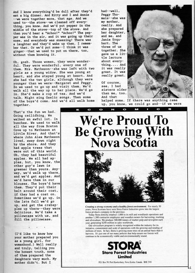 And I know everything'd be dull after they'd eat a big dinner. And Kitty and I and Annie --we were together more, that age. And we used to--the stove--we cleaned off every? thing, you know. And we'd put pepper in the middle of the stove--top of the stove. And then you'd hear a "Achoo!" "Achoo!" The pep? per was in the air, and it was going up their nose, and everybody was sneezing! There was a laughter and they'd wake up then. I remem? ber that. Or we'd put some--I think it was ginger--that we used to put on there, too, without them knowing it. Oh, gosh. Those women, they were wonder? ful. They were wonderful, every one of them. Mrs. Matheson--she was left with two girls as a young widow. She was young at heart, and she stayed young at heart. And she had the two girls, although they were younger than we were--Margaret and Peggy. So we used to go up and visit them. We'd walk all the way up to her place. We'd go in. She'd make a cup of tea. And we'd talk. Might sing Gaelic songs. Then some of the boys'd come. And we'd all walk home together. had--well, Peggy Tho? mais- -she was my mother, really. And she prepared her daughter, and me, and Janie Urqu? hart. The three of us together. She gave us a lit? tle lecture about every? thing .... And it was really great. It was really great. Of course, see, I had sisters older" than me, too. And that ''J.;??M. helped some. If there was anything came up. you know, we could go and--if we were That's the fun we had. Going ceilidhing. We walked an awful lot. In bunches. We used to walk all the way from Breton Cove up to Matheson at Little River. And that's where John Alex Matheson lived, away down right by the shore. And they had apple trees that were out of this world. Oh. they had beautiful apples. We all had ap? ples, but, you know, the other guy's lawn is greener than yours. Any? way, we'd walk up there, and we'd get apples. And we'd have them in our blouses. The boys'd have them. They'd put their belt around their coat, if they had a coat on. Sometimes we'd go up. in the late fall we'd go up. and get the crabap? ples up there--they were delicious. We'd take a pillowcase with us. and fill the pillowcase. (I'd like to know how your mother prepared you as a young girl, for womanhood.) Well really and truly, telling you the honest truth, none of them prepared the daughters very much. My mother didn't. But I We're Proud To Be Growing With Nova Scotia Creating a strong economy and a healthy forest environment. For nearly 30 years. Nova Scotians have seen Stora Forest Industries grow into the largest forest products company in the province. Today Stora directly employs 1,000 in its mill and woodlands operations and another 1,300 contractor employees and woodlot owners for harvesting, trucking and silviculture. We produce 340,000 tonnes of market pulp and newsprint each year, generating $250 million in sales worldwide. Our silviculture program is widely recognized within the industry for its initiative, commitment and scale of operations with the growing and tending of millions of trees. In fact, Stora is growing more trees on an annual basis than it harvests. It's just one of our many policies that help ensure our forests will continue to be economically viable and environmentally sound. STORA' Stora Forest Industries Limited P.O. Box 59, Port Hawkesbur>'. Nova Scotia. Canada BOE 2V0 "Til