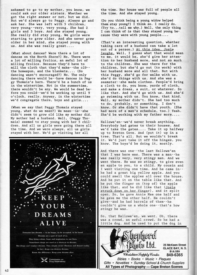 ashamed to go to my mother, you know, we could ask our older sisters. Whether we got the right answer or not. but we did. But we'd always go to Peggy. Always go and ask her. She was left with 5 children, very young--very, very young. She had 2 girls and 3 boys. And she stayed young. She really did stay young. We girls were starting to grow older. And she never grew older in her mind, she stayed young with us. And she was really great.... (What about dances? Were there a lot of dances on the North Shore?) No. There were a lot of milling frolics, an awful lot of milling frolics. Because they'd have to mill the cloth that they'd make--the cid-- the homespun, and the blankets.... (So dancing wasn't encouraged?) No. The only dancing there would be--have dances in Peg? gy Thomais's barn. There'd be a bunch of us in the wintertime. Not in the summertime, there wouldn't be any. We would be dead be? fore you could--we'd be working up until 9 o'clock, really. Anyway, in the wintertime we'd congregate there, boys and girls.... (When we say that Peggy Thomais stayed young, what do we mean?) We mean--is--she didn't seem to grow old like my mother did. My mother had a husband. Well, (Peggy Tho? mais) seemed to stay young with her 5 chil? dren. And all us girls were going there all the time. And we were always, all us girls stayed with her. We'd go visiting her all ',: KEEP ** * YOUR DREAMS ALIVE n't replace dreams. Th Know the difference. Ke the time. Her house was full of people all the time. And she stayed young. (Do you think being a young widow helped them stay young?) I think so. I really do. (Try to...tell me why.) Well, the only thing I can think of is that they stayed young be? cause they were with young people.... (That's an interesting question, whether taking care of a husband can take a lot out of a person.) At this idea. Josie laughs. Well, I guess what that would mean to me, it would be, she'd give her atten? tion to her husband more, and not so much to the children. She was there for the children, but she'd go out (to work) with her husband more and all that. But with this Peggy, she'd go for walks with us, she'd do things with us. And she was a seamster--she made clothes. People'd bring a cloth to do, you know, yards of cloth, and make a dress, a suit, or whatever. So like that. And she'd go with us. And she'd go swimming with us. You know, that kind. Well, my mother didn't. She had too much to do, probably, or something. I don't know. Or she didn't have that youth. (She had more of a man's schedule, too.) Yeah. She'd be working with my father more.... Hallowe'en--we'd never break anything. Everybody had gates to their houses. And we'd take the gates.... Take it up halfway up to Breton Cove. And (put it) up in a tree. That's all. But we wouldn't break it. We'd just take it off the hinges, you know. The boys'd be doing it, mostly. And there was one--the last Hallowe'en that I was here was. There was a man--he was really very, very stingy man. And we went there. He was so stingy, to give even an apple to you, to a child. My cousin and I went visiting one time. And he came in-- he had a great big yellow apple. And you could smell the apples all over the house. And he put it on the table like that. And he put the finger on (top of) the apple like that, and he did like that (Josie struck down on her finger), and it split open. So, he gave Annie Mae one half and he gave me the other half. He couldn't give--and he had barrels of them--he couldn't give us a whole one--that's how stingy he was. So, that Hallowe'en, we went. Oh, there was a crowd, an awful crowd. So he had a little dog. And he used to put the dog in 42 25 McKeen Street GLACE BAY, N. S. B1A5B9 849-6365 Bibles • Books * Music • Plaques Gifts • Novelties • Sunday School & Church Supplies Ail Types of Photography • Cape Breton Scenes