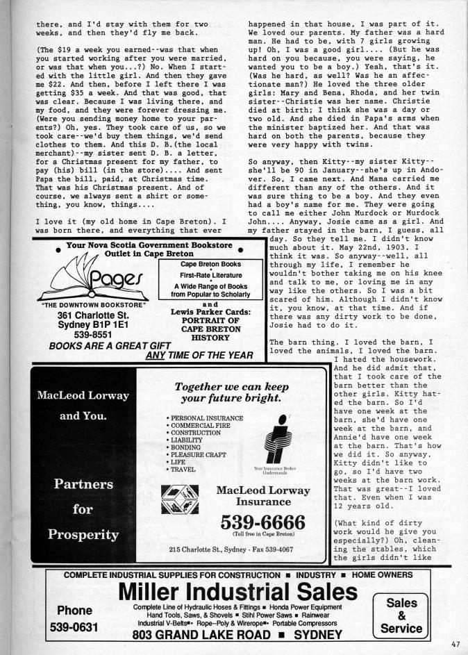 there, and I'd stay with them for two weeks, and then they'd fly me back. (The $19 a week you earned--was that when you started working after you were married, or was that when you...?) No. When I start? ed with the little girl. And then they gave me $22. And then, before I left there I was getting $35 a week. And that was good, that was clear. Because I was living there, and my food, and they were forever dressing me. (Were you sending money home to your par? ents?) Oh, yes. They took care of us, so we took care--we'd buy them things, we'd send clothes to them. And this D. B.(the local merchant)--my sister sent D. B. a letter, for a Christmas present for my father, to pay (his) bill (in the store).... And sent Papa the bill, paid, at Christmas time. That was his Christmas present. And of course, we always sent a shirt or some? thing, you know, things.... I love it (my old home in Cape Breton). I was born there, and everything that ever Tour Nova Scotia Govemment Bookstore Outlet in Cape Breton Cape Breton Books First-Rate Literature A Wide Range of Books from Popular to Scholarly "THE DOWNTOWN BOOKSTORE" 361 Charlotte St. Sydney B1P1E1 539-8551 and Lewis Parker Cards: PORTRAIT OF CAPE BRETON fflSTORY happened in that house, I was part of it. We loved our parents. My father was a hard man. He had to be, with 7 girls growing up! Oh, I was a good girl.... (But he was hard on you because, you were saying, he wanted you to be a boy.) Yeah, that's it. (Was he hard, as well? Was he an affec? tionate man?) He loved the three older girls: Mary and Bena, Rhoda, and her twin sister--Christie was her name. Christie died at birth; I think she was a day or two old. And she died in Papa's arms when the minister baptized her. And that was hard on both the parents, because they were very happy with twins. So anyway, then Kitty--my sister Kitty-- she'll be 90 in January--she's up in Ando- ver. So, I came next. And Mama carried me different than any of the others. And it was sure thing to be a boy. And they even had a boy's name for me. They were going to call me either John Murdock or Murdock John.... Anyway, Josie came as a girl. And my father stayed in the barn, I guess, all day. So they tell me. I didn't know much about it. May 22nd, 1903, I think it was. So anyway--well, all through my life, I remember he wouldn't bother taking me on his knee and talk to me, or loving me in any way like the others. So I was a bit scared of him. Although I didn't know it, you know, at that time. And if there was any dirty work to be done, Josie had to do it. BOOKS ARE A GREA T GIFT ANY TIME OF THE YEAR MacLeod Lorway and You. Together we can keep your future bright. • PERSONAL INSURANCE • COMMERCIAL FIRE • CONSTRUCTION • LIABILITY • BONDING • PLEASURE CRAFT • LIFE • TRAVEL Partners Prosperity MacLeod Lorway Insurance The barn thing. I loved the barn, I loved the animals, I loved the barn. I hated the housework. And he did admit that, that I took care of the barn better than the other girls. Kitty hat? ed the barn. So I'd have one week at the barn, she'd have one week at the barn, and Annie'd have one week at the barn. That's how we did it. So anyway, Kitty didn't like to go, so I'd have two weeks at the barn work. That was great--I loved that. Even when I was 12 years old. Your Insurance Broker Understands 539-6666 (Toll free in Cape Breton) 215 Charlotte St., Sydney - Fax 539-4067 (What kind of dirty work would he give you especially?) Oh, clean? ing the stables, which the girls didn't like COMPLETE INDUSTRIAL SUPPLIES FOR CONSTRUCTION ?? INDUSTRY ?? HOMEOWNERS Phone 539-0631 Miller Industrial Sales Complete Line of Hydraulic Hoses & Fittings ?? Honda Power Equipment Hand Tools, Saws, & Shovels ?? Stihl Power Saws ?? Rainwear Industrial V-Belts"* Rope-Poly & Wirerope"* Portable Compressors 803 GRAND LAKE ROAD ?? SYDNEY Sales & Service 47