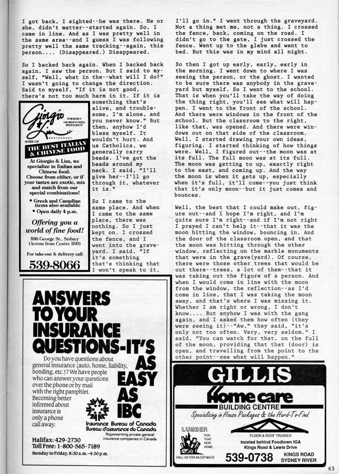 Published by Ronald Caplan on 1991/6/1 (244 reads)I got back, I sighted--he was there. He or she. didn't matter--started again. So, I came in line. And as I was pretty well in the same area--and I guess I was following pretty well the same tracking--again, this person.... (Disappeared.) Disappeared. So I backed back again. When I backed back again, I saw the person. But I said to my? self, "Well, what in the--what will I do?" I wasn't going to change the direction. Said to myself, "If it is not good, there's not too much harm in it. If it is something that's alive, and trouble? some, I'm alone, and you never know." But then, anyhow I'd bless myself. It wouldn't hurt. And us Catholics, we generally carry beads, I've got the beads around my neck. I said, "I'll give her--I'11 go through it. whatever it is." So I came to the same place. And when I came to the same place, there was nothing. So I just kept on. I crossed the fence, and I went into the grave? yard. I said. "If it's something that's thinking that I won't speak to it. At Giorgio & Lim, we specialize in Italian and Chinese food. Choose from either, or if your tastes are exotic, mix and match frt)m our special combinations I • Greek and Canadian items also available • Open daily 4 p.m. Offering you a world of fine food! 536 George St., Sydney (Across from Centre 200) For take-out & delivery call 539-8066 ANSWERS 10Y0UR INSURANCE QUEsriONS-irs Do you have questions about J'Ct general insurance (auto, home, liability, f'iSm bonding, etc.) ? We have people • ? m MMf who can answer your questions E'?S ?? over the phone or by mail • ''%' ?? with the right pamphlet. Becoming better informed about insurance is # - - only a phone 'P Callaway. lrsuroAC • Bureau of Gxrxoda Bureau d'assuroAce du Gxivskda Representing private general insurance companies in Canada AS Halifax: 429-2730 Toll Free: 1-800-565-7189 Monday to Friday, 8:30 a.m.-4:30 p.m. I'll go in." I went through the graveyard. Not a thing met me. not a thing. I crossed the fence, back, coming on the road. I didn't go to the gate. I just crossed the fence. Went up to the glebe and went to bed. But this was in my mind all night. So then I got up early, early, early in the morning. I went down to where I was seeing the person, or the ghost. I wanted to be sure there was anybody in the grave? yard but myself. So I went to the school. That is when you'll take the way of doing the thing right, you'll see what will hap? pen. I went to the front of the school. And there were windows in the front of the school. But the classroom to the right, like that, was opened. And there were win? dows out on that side of the classroom. Well, I started drawing your own ideas, figuring. I started thinking of how things were. Well. I figured out--the moon was at its full. The full moon was at its full. The moon was getting to up. exactly right to the east, and coming up. And the way the moon is when it gets up, especially when it's full, it'll come--you just think that it's only moon--but it just comes and bounces. Well, the best that I could make out. fig? ure out--and I hope I'm right, and I'm quite sure I'm right--and if I'm not right I prayed I can't help it--that it was the moon hitting the window, bouncing in. And the door of the classroom open, and that the moon was hitting through the other window, reflecting on the marble monuments that were in the grave(yard). Of course, there were those other trees that would be out there--trees. a lot of them--that it was taking out the figure of a person. And when I would come in line with the moon from the window, the reflection--as I'd come in line, that I was taking the moon away, and that's where I was missing it. Whether I am right or wrong, I don't know.... But anyhow I was with the gang again, and I asked them how often (they were seeing it)--"Aw." they said, "it's only not too often. Very, very seldom." I said. "You can watch for that, on the full of the moon, providing that that (door) is open, and travelling from the point to the other point--see what will happen." GILLIS 'ibmecare HHBUILDING CENTREHHH wm'Wi CALL US FOR AN ESTIMATE FLOOR & ROOF TRUSSES iocated behind Foodtown IGA Kings Road & Lewis Drive KINGS ROAD SYDNEY RIVER 539-0738