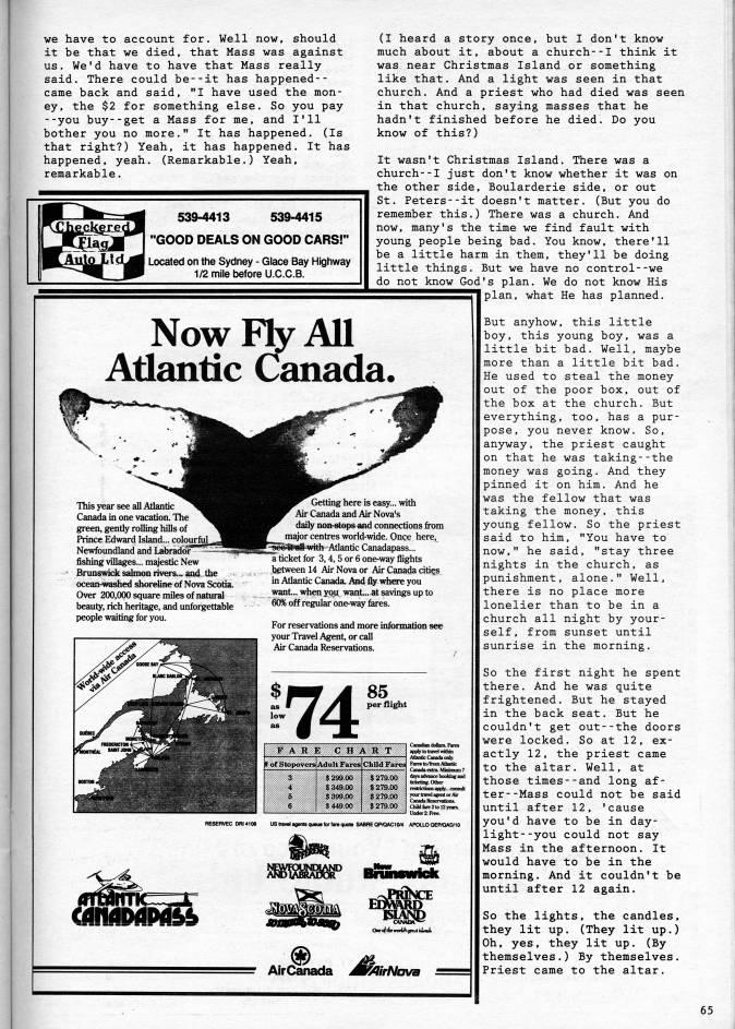 Published by Ronald Caplan on 1991/6/1 (199 reads)we have to account for. Well now, should it be that we died, that Mass was against us. We'd have to have that Mass really said. There could be--it has happened-- came back and said. "I have used the mon? ey, the $2 for something else. So you pay --you buy--get a Mass for me, and I'll bother you no more." It has happened. (Is that right?) Yeah, it has happened. It has happened, yeah. (Remarkable.) Yeah, remarkable. 539-4413 539-4415 "GOOD DEALS ON GOOD CARS!" Located on the Sydney - Glace Bay Highway 1/2 mile before U.C.C.B. (I heard a story once, but I don't know much about it, about a church--I think it was near Christmas Island or something like that. And a light was seen in that church. And a priest who had died was seen in that church, saying masses that he hadn't finished before he died. Do you know of this?) It wasn't Christmas Island. There was a church--I just don't know whether it was on the other side. Boularderie side, or out St. Peters--it doesn't matter. (But you do remember this.) There was a church. And now, many's the time we find fault with young people being bad. You know, there'll be a little harm in them, they'll be doing little things. But we have no control--we do not know God's plan. We do not know His plan, what He has planned. NowFVAU Atlantic Canada. This year see all Atlantic Canada in one vacation. The green, gendy rolling hills of Prince Edward Island... colourful Newfoundland and Labrad' fishing villages... majestic New Brunswick salmon rivers... and the ocean-washed shoreline of Nova Scotia. Over 200,000 square miles of natural beauty, rich heritage, and unforgettable people waiting for you. Getting here is easy... with Air Canada and Air Nova's daily ncm-stopsand connections from major centres world-wide. Once here, 'o'HPtifl with Adantic Canadapass... a ticket for 3,4, 5 or 6 one-way flights between 14 Air Nova or Air Canada citi's • in Adantic Canada. And fly where you want., when you want., at savings up to 60% off regular one-way fares. For reservations and more information'ee your Travel Agent, or call Air Canada Reservations. 85 per flight jf of {Stopovers Adtitt giaresfCJhiM yares Faresto/fromAdwrtic Canadian doOara. Fares apply to bavdwittun Adantic Qmada only. dtqrs advance bo(4dng and bdceting-Odier resirictioas appty... consult your travel i?ent( US travel agef?s queue for fare quote SABRE QP/QAC1(V4 APOLLO QEP/QAO/10 CHIMMMSS ? AirCanada C%NAIH' ONmftbriiwiKjyiui iLmk mrNava But anyhow, this little boy, this young boy. was a little bit bad. Well, maybe more than a little bit bad. He used to steal the money out of the poor box, out of the box at the church. But everything, too, has a pur? pose, you never know. So, anyway, the priest caught on that he was taking--the money was going. And they pinned it on him. And he was the fellow that was taking the money, this young fellow. So the priest said to him, "You have to now," he said, "stay three nights in the church, as punishment, alone." Well, there is no place more lonelier than to be in a church all night by your? self, from sunset until sunrise in the morning. So the first night he spent there. And he was quite frightened. But he stayed in the back seat. But he couldn't get out--the doors were locked. So at 12, ex? actly 12, the priest came to the altar. Well, at those times--and long af? ter- -Mass could not be said until after 12, 'cause you'd have to be in day? light- -you could not say Mass in the afternoon. It would have to be in the morning. And it couldn't be until after 12 again. So the lights, the candles, they lit up. (They lit up.) Oh, yes, they lit up. (By themselves.) By themselves. Priest came to the altar. 65