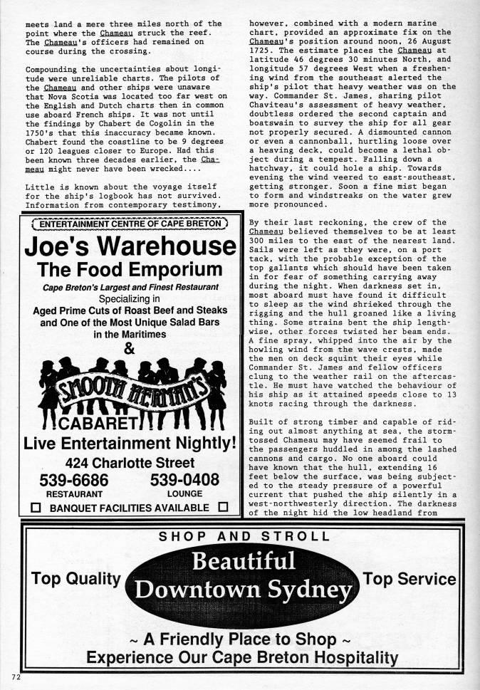 Published by Ronald Caplan on 1991/6/1 (416 reads)meets land a mere three miles north of the point where the Chameau struck the reef. The Chameau's officers had remained on course during the crossing. Compounding the uncertainties about longi? tude were unreliable charts. The pilots of the Chameau and other ships were unaware that Nova Scotia was located too far west on the English and Dutch charts then in common use aboard French ships. It was not until the findings by Chabert de Cogolin in the 1750's that this inaccuracy became known. Chabert found the coastline to be 9 degrees or 120 leagues closer to Europe. Had this been known three decades earlier, the Cha? meau might never have been wrecked.... Little is known about the voyage itself for the ship's logbook has not survived. Information from contemporary testimony. rENTERTAJN'' OF CAPE BRETOiT) Joe's Warehouse The Food Emporium Cape Breton's Largest and Finest Restaurant Specializing in Aged Prime Cuts of Roast Beef and Steaks and One of the Most Unique Salad Bars in the Maritimes ICABARETIl Live Entertainment Niglitly! 424 Charlotte Street 539-6686 539-0408 RESTAURANT LOUNGE D BANQUET FACILITIES AVAILABLE D however, combined with a modern marine chart, provided an approximate fix on the Chameau's position around noon, 26 August 1725. The estimate places the Chameau at latitude 46 degrees 30 minutes North, and longitude 57 degrees West when a freshen? ing wind from the southeast alerted the ship's pilot that heavy weather was on the way. Commander St. James, sharing pilot Chaviteau's assessment of heavy weather, doubtless ordered the second captain and boatswain to survey the ship for all gear not properly secured. A dismounted cannon or even a cannonball, hurtling loose over a heaving deck, could become a lethal ob? ject during a tempest. Falling down a hatchway, it could hole a ship. Towards evening the wind veered to east - southeast, getting stronger. Soon a fine mist began to form and windstreaks on the water grew more pronounced. By their last reckoning, the crew of the Chameau believed themselves to be at least 300 miles to the east of the nearest land. Sails were left as they were, on a port tack, with the probable exception of the top gallants which should have been taken in for fear of something carrying away during the night. When darkness set in, most aboard must have found it difficult to sleep as the wind shrieked through the rigging and the hull groaned like a living thing. Some strains bent the ship length? wise, other forces twisted her beam ends. A fine spray, whipped into the air by the howling wind from the wave crests, made the men on deck squint their eyes while Commander St. James and fellow officers clung to the weather rail on the aftercas- tle. He must have watched the behaviour of his ship as it attained speeds close to 13 knots racing through the darkness. Built of strong timber and capable of rid? ing out almost anything at sea, the storm- tossed Chameau may have seemed frail to the passengers huddled in among the lashed cannons and cargo. No one aboard could have known that the hull, extending 16 feet below the surface, was being subject? ed to the steady pressure of a powerful current that pushed the ship silently in a west-northwesterly direction. The darkness of the night hid the low headland from Top Quality SHOP AND STROLL Beautiful Downtown Sydney Top Service - A Friendly Place to Shop - Experience Our Cape Breton Hospitality 72