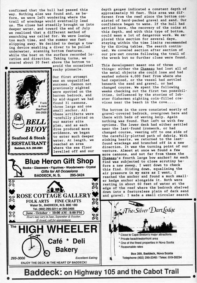 Published by Ronald Caplan on 1991/6/1 (265 reads)confirmed that the hull had passed this way. Nothing else was found and, as be? fore, we were left wondering where the trail of wreckage would eventually lead us. The clues had steadily brought us into deeper water, and toward the end of July we realized that a different method of searching was called for. We were losing too much time, and the summer was fast slipping away. We decided to design a tow? ing device enabling a diver to be pulled underwater, scanning bottom features, while the boat on the surface recorded lo? cation and direction. Taking turns, we soared about 20 feet above the bottom to avoid the occasional rocky pinnacle. Our first attempt was an unqualified success. Cannon not previously sighted were spotted on the barren bedrock, and by mid-August we had found 31 cannons, three large and one small anchor. All these artifacts were -carefully plotted on our master site plan, and as each dive produced more evidence, we began to enter much deeper water. At length, we reached an area where the sea floor levelled off and our (Trj'BELL BUOYl Seafood & Steak RESTAURANT M Baddeck, N.S. 295-2581 "Y Blue Heron Gift Shop V' Books • Glassware • Figurines • Woodenware • Crystai '' Gifts for All Occasions ..IjL baddeck, N.S. 295-3424 h' ROSE COTTAGE GALLERY' FOLK ARTS FINE CRAFTS ''L Water St., BADDECK, N.S. BOE 1 BO ''F Tei. (902) 295-3211 or 295-3405 SV-'r C June - October 10:00 AM - 8:00 PM 3 '' ' ' Hours may vary in June, September & October. ''L If closed, call for appointment. The HIGH WHEELER Cafe * Deli Bakery 295-3006 ' Excellent Eating ENJOY THE DECK IN THE HEART OF BADDECK! depth gauges indicated a constant depth of approximately 90 feet. This area was dif? ferent from the reef since the bottom con? sisted of hard-packed gravel and sand. Our confidence began to wane. If the hull had settled here, the recovery of the coins at this depth, and with this type of bottom, could mean a lot of dangerous work. We ex? plored this section for several days, staying within the time limits recommended by the diving tables. The search contin? ued. We covered section after section of our pre-set course following the trail of the wreck but no further clues were found. This development meant one of three things: either the Chameau had lost all of the metal objects she could lose and had washed ashore 4,000 feet from where she had capsized, or the vessel had settled beneath the sand and gravel, or had changed course. We spent the following weeks checking out the first two possibil? ities, influenced by the stories of lob? ster fishermen sighting coin-filled cre? vices near the beach in the cove.... The bottom in the cove consisted mostly of gravel-covered bedrock, overgrown here and there with beds of waving kelp. Again nothing was found. That left us with few options. The lower deck had either settled near the last-found ironwork, or had changed course, veering off to one side of the carefully-plotted path of debris. With sinking hearts, we returned to the last- found wreckage and branched off in a new direction. It was the turning point of our venture. Almost at once we found a few more cannons, and not far from these the Chameau's fourth large bow anchor! As each find was subjected to close scrutiny be? fore a new sweep, I went down to check this find. Sliding down, equalizing the air pressure in my ears as I went, I reached the anchor and found a much small? er kedge anchor alongside it. Both were resting in about 60 feet of water at the edge of the reef where the bedrock shelved down into a featureless plain of dark sand and gravel. I made a small circular search fTfiCiSifver TJartJodije % ' Close to Cape Breton's major attractions * Private beach/waterfront area * One of the finest properties in Nova Scotia * Reasonable rates Box 399, Baddeck, Nova Scotia Telephone (902) 295-2340 / Telex: 019-35234 Baddeck: on Highway 105 and the Cabot Trail