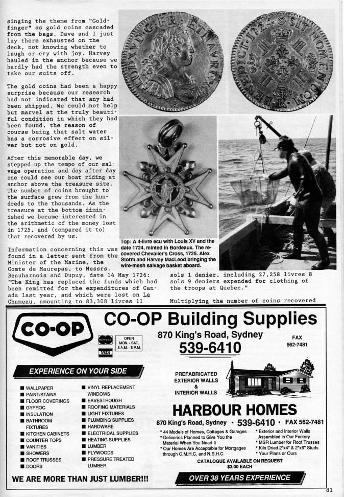 Published by Ronald Caplan on 1991/6/1 (571 reads)singing the theme from "Gold- finger" as gold coins cascaded from the bags. Dave and I just lay there exhausted on the deck, not knowing whether to laugh or cry with joy. Harvey hauled in the anchor because we hardly had the strength even to take our suits off. The gold coins had been a happy surprise because our research had not indicated that any had been shipped. We could not help but marvel at the truly beauti? ful condition in which they had been found, the reason of course being that salt water has a corrosive effect on sil? ver but not on gold. After this memorable day, we stepped up the tempo of our sal? vage operation and day after day one could see our boat riding at anchor above the treasure site. The number of coins brought to the surface grew from the hun? dreds to the thousands. As the treasure at the bottom dimin? ished we became interested in the arithmetic of the money lost in 1725, and (compared it to) that recovered by us. Top: A 4-livre ecu with Louis XV and the Information concerning this was 'a'e "'724, minted in Bordeaux. The re- found in a letter sent from the covered Chevalier's Cross, 1725. Alex Minister of the Marine, the Storm and Harvey MacLeod bringing the Comte de Maurepas, to Messrs. Beauharnois and Dupuy, date 14 May 1726: "The King has replaced the funds which had been remitted for the expenditures of Can? ada last year, and which were lost on Le Chameau. amounting to 83,308 livres 11 wire-mesh salvage basket aboard. sols 1 denier, including 27,258 livres 8 sols 9 deniers expended for clothing of the troops at Quebec." Multiplying the number of coins recovered CO-OP CO-OP Building Supplies '0 VISA OPEN MON.-SAT. 8 A.M. - 5 P.M. 870 King's Road, Sydney 539-6410 FAX 562-7481 EXPERIENCE ON YOUR SIDE I WALLPAPER I PAINT/STAINS I FLOOR COVERINGS I GYPROC I INSULATION I BATHROOM FIXTURES I KITCHEN CABINETS I COUNTER TOPS I VANITIES I SHOWERS I ROOF TRUSSES I DOORS I VINYL REPLACEMENT WINDOWS I EAVESTROUGH I ROOFING MATERIALS I LIGHT FIXTURES I PLUMBING SUPPLIES I HARDWARE I ELECTRICAL SUPPLIES I HEATING SUPPLIES I LUMBER I PLYWOODS ! PRESSURE TREATED LUMBER PREFABRICATED EXTERIOR WALLS & INTERIOR WALLS HARBOUR HOIVIES 870 King's Road, Sydney • 539-6410 * FAX 562-7481 * 44 Models of Homes, Cottages & Garages * Deliveries Planned to Give You the Material When You Need It * Our Homes Are Acceptable for Mortgages through C.M.H.C. and N.S.H.C CATALOGUE AVAILABLE ON REQUEST $3.00 EACH * Exterior and Interior Walls Assembled in Our Factory * MSR Lumber for Roof Trusses * Kiln Dried 2"x4" & 2"x6" Studs * Your Plans or Ours WE ARE MORE THAN JUST LUMBER!!! OVER 38 YEARS EXPERIENCE 81