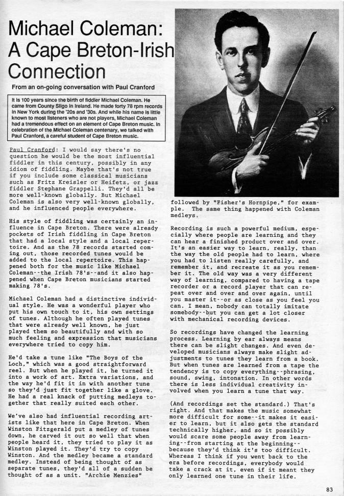 Michael Coleman: A Gape Breton-Irish Connection From an on-going conversation with Paul Cranford It is 100 years since the birth of fiddler Michael Coleman. He came from County Sligo in Ireland. He made forty 78 rpm records in New York during the '20s and *30s. And while his name is little known to most listeners who are not players, Michael Coleman had a tremendous effect on an element of Cape Breton music. In celebration of the Michael Coleman centenary, we talked with Paul Cranford, a careful student of Cape Breton music. Paul Cranford: I would say there's no question he would be the most influential fiddler in this century, possibly in any idiom of fiddling. Maybe that's not true if you include some classical musicians such as Fritz Kreisler or Heifetz, or jazz fiddler Stephane Grappelli. They'd all be more well-known globally. But Michael Coleman is also very well-known globally, and he influenced people everywhere. His style of fiddling was certainly an in? fluence in Cape Breton. There were already pockets of Irish fiddling in Cape Breton that had a local style and a local reper? toire. And as the 78 records started com? ing out, those recorded tunes would be added to the local repertoire. This hap? pened both for the music like Michael Coleman--the Irish 78's--and it also hap? pened when Cape Breton musicians started making 78's. Michael Coleman had a distinctive individ? ual style. He was a wonderful player who put his own touch to it, his own settings of tunes. Although he often played tunes that were already well known, he just played them so beautifully and with so much feeling and expression that musicians everywhere tried to copy him. He'd take a tune like "The Boys of the Loch." which was a good straightforward reel. But when he played it, he turned it into a work of art. Extra variations, and the way he'd fit it in with another tune so they'd just fit together like a glove. He had a real knack of putting medleys to? gether that really suited each other. We've also had influential recording art? ists like that here in Cape Breton. When Winston Fitzgerald put a medley of tunes down, he carved it out so well that when people heard it, they tried to play it as Winston played it. They'd try to copy Winston. And the medley became a standard medley. Instead of being thought of as separate tunes, they'd all of a sudden be thought of as a unit. "Archie Menzies" followed by "Fisher's Hornpipe," for exam? ple. The same thing happened with Coleman medleys. Recording is such a powerful medium, espe? cially where people are learning and they can hear a finished product over and over. It's an easier way to learn, really, than the way the old people had to learn, where you had to listen really carefully, and remember it, and recreate it as you remem? ber it. The old way was a very different way of learning, compared to having a tape recorder or a record player that can re? peat over and over and over again, until you master it--or as close as you feel you can. I mean, nobody can totally imitate somebody--but you can get a lot closer with mechanical recording devices. So recordings have changed the learning process. Learning by ear always means there can be slight changes. And even de? veloped musicians always make slight ad? justments to tunes they learn from a book. But when tunes are learned from a tape the tendency is to copy everything--phrasing, sound, swing, intonation. In other words there is less individual creativity in? volved when you learn a tune that way. (And recordings set the standard.) That's right. And that makes the music somewhat more difficult for some--it makes it easi? er to learn, but it also gets the standard technically higher, and so it possibly would scare some people away from learn? ing- -from starting at the beginning-- because they'd think it's too difficult. Whereas I think if you went back to the era before recordings, everybody would take a crack at it, even if it meant they only learned one tune in their life. 83