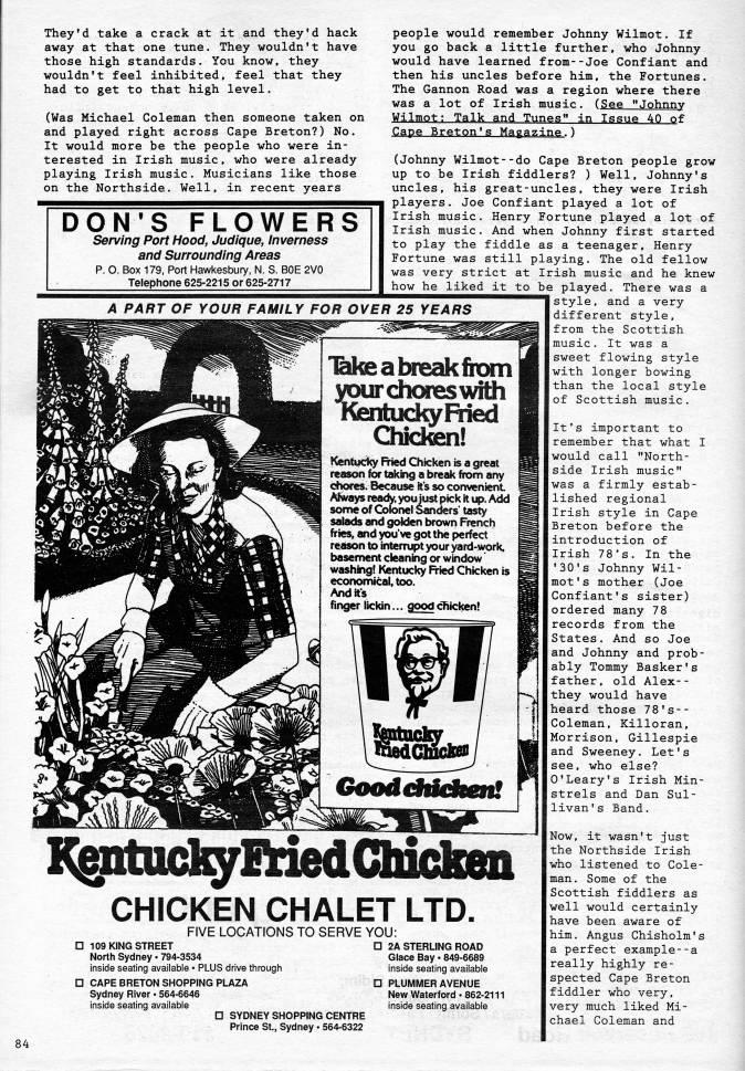 They'd take a crack at it and they'd hack away at that one tune. They wouldn't have those high standards. You know, they wouldn't feel inhibited, feel that they had to get to that high level. (Was Michael Coleman then someone taken on and played right across Cape Breton?) No. It would more be the people who were in? terested in Irish music, who were already playing Irish music. Musicians like those on the Northside. Well, in recent years DON'S FLOWERS Serving Port Hood, Judique, Inverness and Surrounding Areas p. O. Box 179, Port Hawkesbury, N. S. BOE 2V0 Telephone 625-2215 or 625-2717 A PART OF YOUR FAMILY FOR OVER 25 YEARS "'ke a break from yourdloresAvith Kentucky Fried Qiidten! Kentucky Fiied Chicken is a great reason for taking a break from any chores. Because its so convenient Always rea