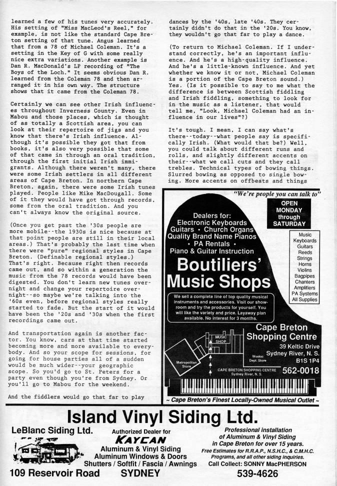 learned a few of his tunes very accurately. His setting of "Miss MacLeod's Reel," for example, is not like the standard Cape Bre? ton setting of that tune. Angus learned that from a 78 of Michael Coleman. It's a setting in the Key of G with some really nice extra variations. Another example is Dan R. MacDonald's LP recording of "The Boys of the Loch." It seems obvious Dan R. learned from the Coleman 78 and then ar? ranged it in his own way. The structure shows that it came from the Coleman 78. Certainly we can see other Irish influenc? es throughout Inverness County. Even in Mabou and those places, which is thought of as totally a Scottish area, you can look at their repertoire of jigs and you know that there's Irish influence. Al? though it's possible they got that from books, it's also very possible that some of that came in through an oral tradition, through the first initial Irish immi? grants. Although there weren't many, there were some Irish settlers in all different areas of Cape Breton. In northern Cape Breton, again, there were some Irish tunes played. People like Mike MacDougall. Some of it they would have got through records, some from the oral tradition. And you can't always know the original source. (Once you get past the '30s people are more mobile--the 1930s is nice because at that point people are still in their local areas.) That's probably the last time when there were "pure" regional styles in Cape Breton. (Definable regional styles.) That's right. Because right then records came out, and so within a generation the music from the 78 records would have been digested. You don't learn new tunes over? night and change your repertoire over? night- -so maybe we're talking into the '60s even, before regional styles really started to fade. But the start of it would have been the '20s and '30s when the first recordings came out. And transportation again is another fac? tor. You know, cars at that time started becoming more and more available to every? body. And so your scope for sessions, for going for house parties all of a sudden would be much wider--your geographic scope. So you'd go to St. Peters for a party even though you're from Sydney. Or you'll go to Mabou for the weekend. And the fiddlers would go that far to play dances by the '40s, late '40s. They cer? tainly didn't do that in the '20s. You know, they wouldn't go that far to play a dance. (To return to Michael Coleman. If I under? stand correctly, he's an important influ? ence. And he's a high-quality influence. And he's a little-known influence. And yet whether we know it or not, Michael Coleman is a portion of the Cape Breton sound.) Yes. (Is it possible to say to me what the difference is between Scottish fiddling and Irish fiddling, something to look for in the music as a listener, that would tell me, "Look, Michael Coleman had an in? fluence in our lives"?) It's tough. I mean, I can say what's there--today--what people say is specifi? cally Irish. (What would that be?) Well, you could talk about different runs and rolls, and slightly different accents on their--what we call cuts and they call trebles. Technical types of bowing things. Slurred bowing as opposed to single bow? ing. More accents on offbeats and things 'We're people you can talk to' Dealers for: Electronic Keyboards Guitars • Church Organs Quality Brand Name Pianos , • PA Rentals • Piano & Guitar Instruction Boutiliers' IVIusic Shiops We sell a complete line of top quality musical instruments and accessories. Visit our show? room and try the products for yourself. You will like the variety and price. Layaway plan available. No interest for 3 months. OPEN MONDAY through SATURDAY f'usic Keyboards Guitars Reeds Strings Horns Violins Bagpipes Chanters Amplifiers PA Systems All Supplies Cape Breton Shopping Centre 39 Keltic Drive Sydney River, N. S. B1S1P4 CAPE BRETON SHOPPING CENTRE Sydney River, N. S. 562-0018 I - Cape Breton's Finest Locally-Owned Musical Outlet - LeBlanc Siding Ltd Island Vinyl Siding Ltd. Authorized Dealer for k"AYCAN Aluminum & Vinyl Siding Aluminum Windows & Doors Shutters / Softfit / Fascia / Awnings 109 Reservoir Road SYDNEY Professional installation of Aluminum & Vinyl Siding in Cape Breton for over 15 years. Free Estimates forR.R.A.P., N.S.H.C, & C.M.H.C. Programs, and all other siding Inquiries. Call Collect: SONNY MacPHERSON 539-4626