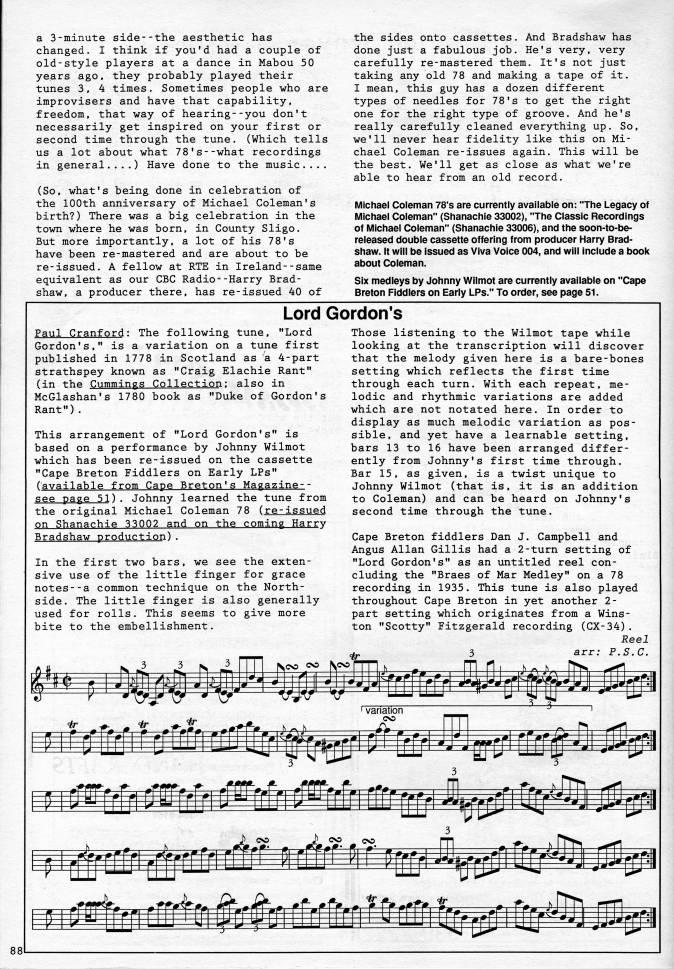a 3-minute side--the aesthetic has changed. I think if you'd had a couple of old-style players at a dance in Mabou 50 years ago, they probably played their tunes 3, 4 times. Sometimes people who are improvisers and have that capability, freedom, that way of hearing--you don't necessarily get inspired on your first or second time through the tune. (Which tells us a lot about what 78's--what recordings in general....) Have done to the music... (So, what's being done in celebration of the 100th anniversary of Michael Coleman's birth?) There was a big celebration in the town where he was born, in County Sligo. But more importantly, a lot of his 78's have been re-mastered and are about to be re-issued. A fellow at RTE in Ireland--same equivalent as our CBC Radio--Harry Brad- shaw, a producer there, has re-issued 40 of the sides onto cassettes. And Bradshaw has done just a fabulous job. He's very, very carefully re-mastered them. It's not just taking any old 78 and making a tape of it. I mean, this guy has a dozen different types of needles for 78's to get the right one for the right type of groove. And he's really carefully cleaned everything up. So, we'll never hear fidelity like this on Mi? chael Coleman re-issues again. This will be the best. We'll get as close as what we're able to hear from an old record. Michael Coleman 78's are currently available on: "The Legacy of Michael Coleman" (Shanachie 33002), 'The Classic Recordings of Michael Coleman" (Shanachie 33006), and the soon-to-be- released double cassette offering from producer Harry Brad? shaw. It will be issued as Viva Voice 004, and will include a book about Coleman. Six medleys by Johnny Wilmot are currently available on "Cape Breton Fiddlers on Early LPs." To order, see page 51. Lord Gordon's Paul Cranford: The following tune, "Lord Gordon's," is a variation on a tune first published in 1778 in Scotland as a 4-part strathspey known as "Craig Elachie Rant" (in the Cummings Collection: also in McGlashan's 1780 book as "Duke of Gordon's Rant"). This arrangement of "Lord Gordon's" is based on a performance by Johnny Wilmot which has been re-issued on the cassette "Cape Breton Fiddlers on Early LPs" (available from Cape Breton's Magazine-- see page 51). Johnny learned the tune from the original Michael Coleman 78 (re-issued on Shanachie 33002 and on the coming Harry Bradshaw production). In the first two bars, we see the exten? sive use of the little finger for grace notes--a common technique on the North- side. The little finger is also generally used for rolls. This seems to give more bite to the embellishment. Those listening to the Wilmot tape while looking at the transcription will discover that the melody given here is a bare-bones setting which reflects the first time through each turn. With each repeat, me? lodic and rhythmic variations are added which are not notated here. In order to display as much melodic variation as pos? sible, and yet have a learnable setting, bars 13 to 16 have been arranged differ? ently from Johnny's first time through. Bar 15, as given, is a twist unique to Johnny Wilmot (that is, it is an addition to Coleman) and can be heard on Johnny's second time through the tune. Cape Breton fiddlers Dan J. Campbell and Angus Allan Gillis had a 2-turn setting of "Lord Gordon's" as an untitled reel con? cluding the "Braes of Mar Medley" on a 78 recording in 1935. This tune is also played throughout Cape Breton in yet another 2- part setting which originates from a Wins? ton "Scotty" Fitzgerald recording (CX-34). Reel 3 arr; P.S.C. [[tf [[&! rrtrfflj'i' J} CO J) <=' C' ' OO ' m[jiW'i'' di%i cID'rri fcri "Ir jt. ' 4r ' ' 'p p