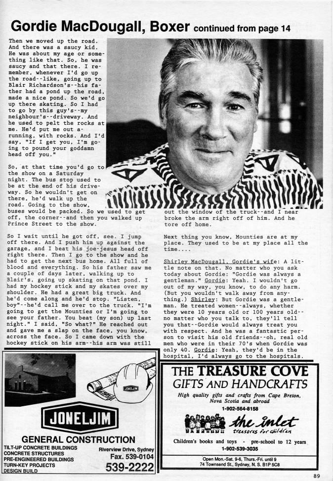 Gordie MacDougall, Boxer continued from page 14 Then we moved up the road. And there was a saucy kid. He was about my age or some? thing like that. So, he was saucy and that there. I re? member, whenever I'd go up the road--like, going up to Blair Richardson's--his fa? ther had a pond up the road, made a nice pond. So we'd go up there skating. So I had to go by this guy's--my neighbour's--driveway. And he used to pelt the rocks at me. He'd put me out a- running, with rocks. And I'd say, "If I get you, I'm go? ing to pound your goddamn head off you." So, at that time you'd go the show on a Saturday night. The bus stop used to be at the end of his drive? way. So he wouldn't get on there, he'd walk up the road. Going to the show, buses would be packed. So we used to get off, the corner--and then you walked up Prince Street to the show. So I wait until he got off, see. I jump off there. And I push him up against the garage, and I beat his joe-jesus head off right there. Then I go to the show and he had to get the next bus home. All full of blood and everything. So his father saw me a couple of days later, walking up to Blair's, going up skating on that pond. I had my hockey stick and my skates over my shoulder. He had a great big truck. And he'd come along and he'd stop. "Listen, boy"--he'd call me over to the truck. "I'm going to get the Mounties or I'm going to see your father. You beat (my son) up last night." I said, "So what?" He reached out and gave me a slap on the face, you know, across the face. So I came down with the hockey stick on his arm--his arm was still JONELJIM GENERAL CONSTRUCTION TILT-UP CONCRETE BUILDINGS CONCRETE STRUCTURES PRE-ENGINEERED BUILDINGS TURN-KEY PROJECTS DESIGN BUILD Riverview Drive, Sydney Fax. 539-0104 539-2222 out the window of the truck--and I near broke the arm right off of him. And he tore off home. Next thing you know, Mounties are at my place. They used to be at my place all the time.... Shirley MacDougall. Gordie's wife: A lit? tle note on that. No matter who you ask today about Gordie: "Gordie was always a gentleman." Gordie: Yeah. I wouldn't go out of my way, you know, to do any harm. (But you wouldn't walk away from any? thing.) Shirley: But Gordie was a gentle? man. He treated women--always, whether they were 10 years old or 100 years old-- no matter who you talk to, they'll tell you that--Gordie would always treat you with respect. And he was a fantastic per? son to visit his old friends--oh, real old men who were in their 70's when Gordie was only 40. Gordie: Yeah, they'd be in the hospital, I'd always go to the hospitals. THE TREASURE COVE GIFTS AND HANDCRAFTS High quality gifts and crafts from Cape Breton, Nova Scotia and abroad 1-902-564-8158 &??L Pi0 A'JSm Mti'Jnl??' mjm. Children's books and toys - pre-school to 12 years 1-902-539-3035 Open Mon.-Sat. 9-6, Thurs.-Fri. until 9 74 Townsend St., Sydney, N. S. 81P 5C8 89