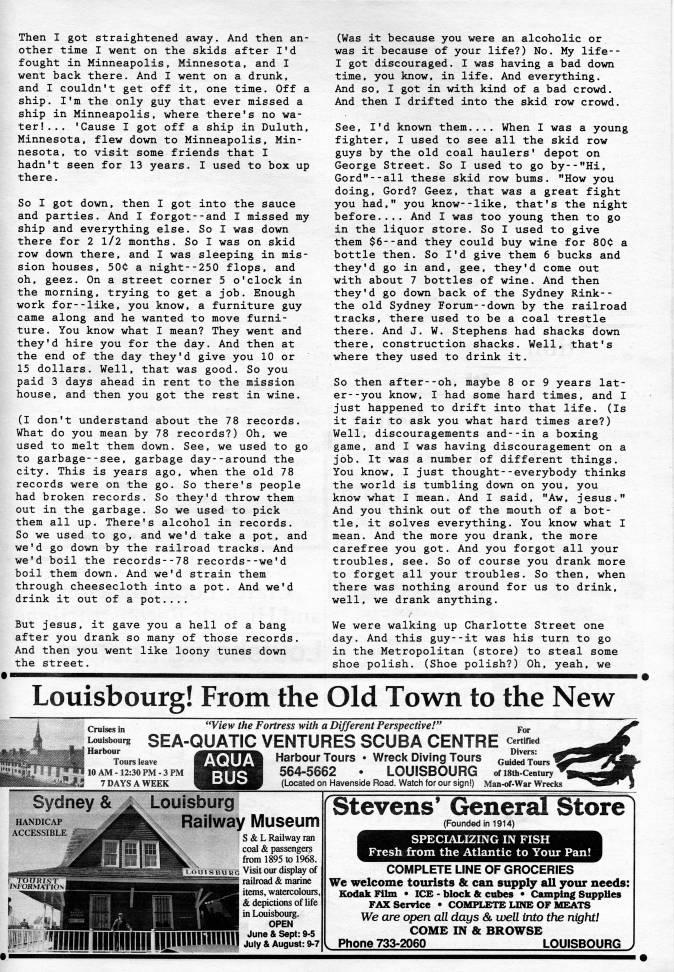Published by Ronald Caplan on 1991/6/1 (143 reads)Then I got straightened away. And then an? other time I went on the skids after I'd fought in Minneapolis. Minnesota, and I went back there. And I went on a drunk, and I couldn't get off it, one time. Off a ship. I'm the only guy that ever missed a ship in Minneapolis, where there's no wa? ter!... 'Cause I got off a ship in Duluth. Minnesota, flew down to Minneapolis, Min? nesota, to visit some friends that I hadn't seen for 13 years. I used to box up there. So I got down, then I got into the sauce and parties. And I forgot--and I missed my ship and everything else. So I was down there for 2 1/2 months. So I was on skid row down there, and I was sleeping in mis? sion houses, 50C a night--250 flops, and oh, geez. On a street corner 5 o'clock in the morning, trying to get a job. Enough work for--like, you know, a furniture guy came along and he wanted to move furni? ture. You know what I mean? They went and they'd hire you for the day. And then at the end of the day they'd give you 10 or 15 dollars. Well, that was good. So you paid 3 days ahead in rent to the mission house, and then you got the rest in wine. (I don't understand about the 78 records. What do you mean by 78 records?) Oh, we used to melt them down. See, we used to go to garbage--see, garbage day--around the city. This is years ago, when the old 78 records were on the go. So there's people had broken records. So they'd throw them out in the garbage. So we used to pick them all up. There's alcohol in records. So we used to go, and we'd take a pot, and we'd go down by the railroad tracks. And we'd boil the records--78 records--we'd boil them down. And we'd strain them through cheesecloth into a pot. And we'd drink it out of a pot.... But jesus. it gave you a hell of a bang after you drank so many of those records. And then you went like loony tunes down the street. (Was it because you were an alcoholic or was it because of your life?) No. My life-- I got discouraged. I was having a bad down time, you know, in life. And everything. And so. I got in with kind of a bad crowd. And then I drifted into the skid row crowd. See, I'd known them.... When I was a young fighter, I used to see all the skid row guys by the old coal haulers' depot on George Street. So I used to go by--"Hi, Gord"--all these skid row bums. "How you doing, Gord? Geez, that was a great fight you had," you know--like, that's the night before.... And I was too young then to go in the liquor store. So I used to give them $6--and they could buy wine for 80C a bottle then. So I'd give them 6 bucks and they'd go in and, gee, they'd come out with about 7 bottles of wine. And then they'd go down back of the Sydney Rink-- the old Sydney Forum--down by the railroad tracks, there used to be a coal trestle there. And J. W. Stephens had shacks down there, construction shacks. Well, that's where they used to drink it. So then after--oh. maybe 8 or 9 years lat? er- -you know. I had some hard times, and I just happened to drift into that life. (Is it fair to ask you what hard times are?) Well, discouragements and--in a boxing game, and I was having discouragement on a job. It was a number of different things. You know, I just thought--everybody thinks the world is tumbling down on you, you know what I mean. And I said, "Aw, jesus." And you think out of the mouth of a bot? tle, it solves everything. You know what I mean. And the more you drank, the more carefree you got. And you forgot all your troubles, see. So of course you drank more to forget all your troubles. So then, when there was nothing around for us to drink, well, we drank anything. We were walking up Charlotte Street one day. And this guy--it was his turn to go in the Metropolitan (store) to steal some shoe polish. (Shoe polish?) Oh, yeah, we Louisbourg! From the Old Town to the New Cruises in Louisbouig Harbour Tours leave ''View the Fortress with a Different Perspective!" ''j, SEA-QUATIC VENTURES SCUBA CENTRE certmed Divers: Guided Tours 10 AM-12:30 PM-3 PM 7 DAYS A WEEK AQUA BUS Harbour Tours • Wreck Diving Tours 564-5662 • LOUISBOURG ofisth-century (Located on Havenside Road. Watch for our sign!) Man-of-War Wrecks I Sydney & ' Louisburg ??iHjDICAI' leiSESSIBLE Railway Museum 5 & L Railway ran coal & passengers from 1895 to 1968. tn s iuL? a Visit OUT display of railroad & marine items, watercolours, 6 depictions of life in Louisbourg. OPEN illllHiiiiifniiiqj'i''f;' Stevens' General Store (Founded in 1914) SPECIALIZING IN FISH Fresh from the Atlantic to Your Pan! COMPLETE UNE OF GROCERIES We welcome tourists & can supply all yowc needs: ??[odak Film • ICE - block & cubes • Camping Supplies FAX Service • COMPLETE LINE OF BAEATS We are open all days & well into tire nigfit! COME IN & BROWSE Phone 733-2060 LOUISBOURG