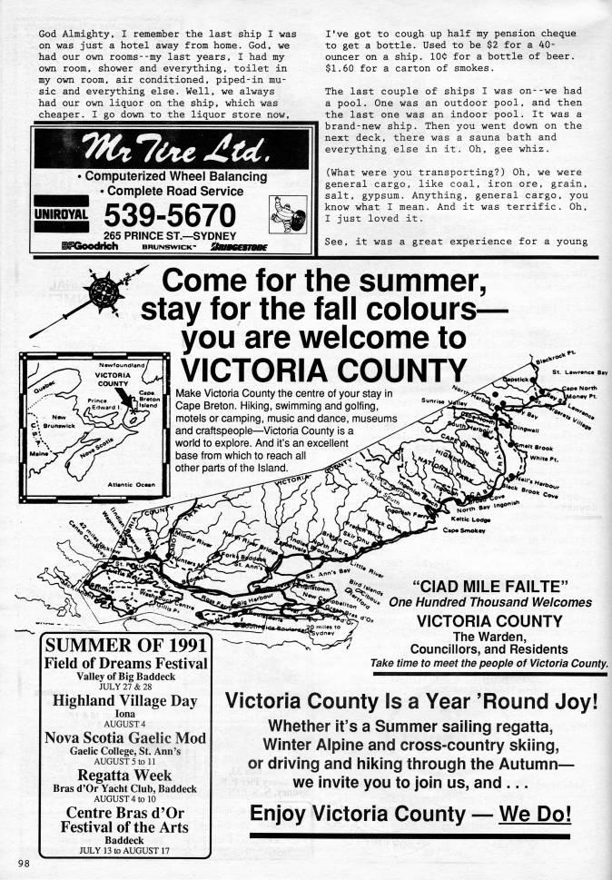 Published by Ronald Caplan on 1991/6/1 (160 reads)God Almighty, I remember the last ship I was on was just a hotel away from home. God, we had our own rooms--my last years, I had my own room, shower and everything, toilet in my own room, air conditioned, piped-in mu? sic and everything else. Well, we always had our own liquor on the ship, which was cheaper. I go down to the liquor store now. TfUlitcAtd. Computerized Wheel Balancing • Complete Road Service UNIROYAL 539-5670 265 PRINCE ST. • SYDNEY 'TOoodrich brunswick- I've got to cough up half my pension cheque to get a bottle. Used to be $2 for a 40- ouncer on a ship. IOC for a bottle of beer. $1.60 for a carton of smokes. The last couple of ships I was on--we had a pool. One was an outdoor pool, and then the last one was an indoor pool. It was a brand-new ship. Then you went down on the next deck, there was a sauna bath and everything else in it. Oh, gee whiz. (What were you transporting?) Oh, we were general cargo, like coal, iron ore, grain, salt, gypsum. Anything, general cargo, you know what I mean. And it was terrific. Oh, I just loved it. See, it was a great experience for a young u a'' C* Brunswick Newfoundland VICTORIA / COUNTY > Come for the summer, stay for the fall colours- you are welcome to VICTORIA COUNTY '''' Atlantic OcMin Make Victoria County the centre of your stay in Cape Breton. Hiking, swimming and golfing, motels or camping, music and dance, museums and craftspeople • Victoria County is a world to explore. And it's an excellent base from which to reach all other parts of the Island. p?p? North 'on?y Pt. "%Ci % yoiopwa/i g''t Brook h '"''U "'-' [?*/.! Keltic Lodo* CapeSmokav ;ov? '''''' Cov. ''i: yj' Aniri Ann's e.V 55>r' ,