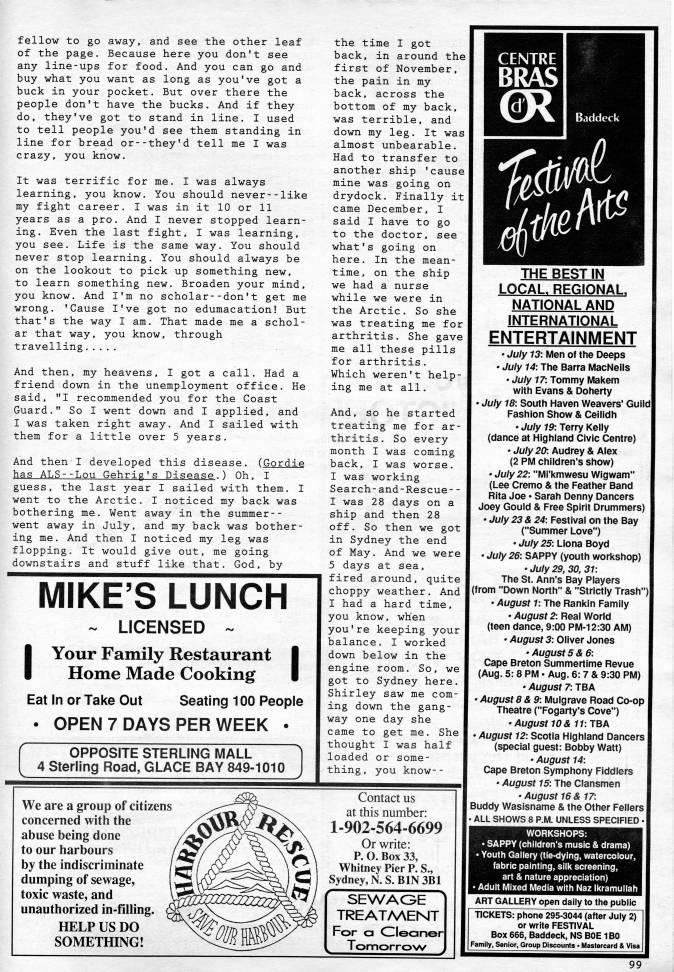 Published by Ronald Caplan on 1991/6/1 (159 reads)fellow to go away, and see the other leaf of the page. Because here you don't see any line-ups for food. And you can go and buy what you want as long as you've got a buck in your pocket. But over there the people don't have the bucks. And if they do, they've got to stand in line. I used to tell people you'd see them standing in line for bread or--they'd tell me I was crazy, you know. It was terrific for me. I was always learning, you know. You should never--like my fight career. I was in it 10 or 11 years as a pro. And I never stopped learn? ing. Even the last fight, I was learning, you see. Life is the same way. You should never stop learning. You should always be on the lookout to pick up something new, to learn something new. Broaden your mind, you know. And I'm no scholar--don't get me wrong. 'Cause I've got no edumacation! But that's the way I am. That made me a schol? ar that way, you know, through travelling And then, my heavens, I got a call. Had a friend down in the unemployment office. He said, "I recommended you for the Coast Guard." So I went down and I applied, and I was taken right away. And I sailed with them for a little over 5 years. And then I developed this disease. (Gordie has ALS--L0U Gehrig's Disease.) Oh, I guess, the last year I sailed with them. I went to the Arctic. I noticed my back was bothering me. Went away in the summer-- went away in July, and my back was bother? ing me. And then I noticed my leg was flopping. It would give out, me going downstairs and stuff like that. God, by MIKE'S LUNCH ~ LICENSED ~ I Your Family Restaurant I Home Made Cooking I Eat In or Take Out Seating 100 People • OPEN 7 DAYS PER WEEK • OPPOSITE STERLING MALL 4 sterling Road, GLACE BAY 849-1010 the time I got back, in around the first of November, the pain in my back, across the bottom of my back, was terrible, and down my leg. It was almost unbearable. Had to transfer to another ship 'cause mine was going on drydock. Finally it came December, I said I have to go to the doctor, see what's going on here. In the mean? time, on the ship we had a nurse while we were in the Arctic. So she was treating me for arthritis. She gave me all these pills for arthritis. Which weren't help? ing me at all. And, so he started treating me for ar? thritis. So every month I was coming back, I was worse. I was working Search-and-Rescue-- I was 28 days on a ship and then 28 off. So then we got in Sydney the end of May. And we were 5 days at sea, fired around, quite choppy weather. And I had a hard time, you know, when you're keeping your balance. I worked down below in the engine room. So, we got to Sydney here. Shirley saw me com? ing down the gang? way one day she came to get me. She thought I was half loaded or some? thing, you know-- We are a group of citizens concerned with the abuse being done to our harbours by the indiscriminate dumping of sewage, toxic waste, and unauthorized in-filling. HELP US DO SOMETHING! Contact us at this number: 1-902-564-6699 Or write: P. O. Box 33, Whitney Pier P. S., Sydney, N. S. BIN 3B1 SEWAGE TREATMENT For a Cleaner Tomorrow THE BEST IN LOCAL. REGIONAL. NATIONAL AND INTERNATIONAL ENTERTAINMENT • July 13: Men of the Deeps • July 14: The Barra MacNeils • July 17: Tommy Makem with Evans & Doherty • July 18: South Haven Weavers' Guild Fashion Show & Ceilidh • July 19: Terry Kelly (dance at Highland Civic Centre) • July 20: Audrey & Alex (2 PM children's show) • July 22: "Mi'kmwesu Wigwam" (Lee Cremo & the Feather Band Rita Joe • Sarah Denny Dancers Joey Gould & Free Spirit Drummers) • July 23 & 24: Festival on the Bay ("Summer Love") • July 25: Liona Boyd • July 26: SAPPY (youth worlcshop) • July 29, 30, 31: The St. Ann's Bay Players (from "Down North" & "Strictly Trash") • August 1: The Rankin Family • August 2: Real World (teen dance, 9:00 PM-12:30 AM) • August 3: Oliver Jones • August 5 & 6: Cape Breton Summertime Revue (Aug. 5: 8 PM • Aug. 6: 7 & 9:30 PM) • August 7: TBA • August 8&9: Mulgrave Road Co-op Theatre ("Fogarty's Cove") -August 10& 11: TBA • August 12: Scotia Highland Dancers (special guest: Bobby Watt) • August 14: Cape Breton Symphony Fiddlers • August 15: The Clansmen • August 16 & 17: Buddy Wasisname & the Other Fellers • ALL SHOWS 8 P.M. UNLESS SPECIFIED • WORKSHOPS: • SAPPY (children's music & drama) • Youth Gallery (tie-dying, watercolour, fabric painting, silk screening, art & nature appreciation) * Adult Mixed Media with Naz Ikramullah ART GALLERY open daily to the public TICKETS: phone 295-3044 (after July 2) or write FESTIVAL Box 666, Baddeck, NS BOE 180 Family, Senior, Group Discounts • Mastercard & Visa 99