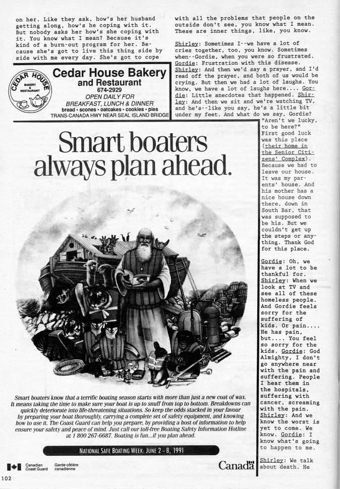 Published by Ronald Caplan on 1991/6/1 (149 reads)on her. Like they ask, how's her husband getting along, how's he coping with it. But nobody asks her how's she coping with it. You know what I mean? Because it's kind of a burn-out program for her. Be? cause she's got to live this thing side by side with me every day. She's got to cope Cedar House Bakery and Restaurant ''' 674-2929 OPEN DAILY FOR BREAKFAST, LUNCH & DINNER bread • scones • oatcakes • cooi'ies • pies TRANS-CANADA HWY NEAR SEAL ISLAND BRIDGE with all the problems that people on the outside don't see, you know what I mean. These are inner things, like, you know. Shirley: Sometimes I--we have a lot of cries together, too, you know. Sometimes when--Gordie, when you were so frustrated. Gordie: Frustration with this disease. Shirley: And then we'd say a prayer, and I'd read off the prayer, and both of us would be crying. But then we had a lot of laughs. You know, we have a lot of laughs here.... Gor? die: Little anecdotes that happened. Shir? ley: And then we sit and we're watching TV, and he's--like you say, he's a little bit under my feet. And what do we say, Gordie? 'Aren't we lucky. Smart boaters always plan ahead. Smart boaters know that a terrific boating season starts witii more ttian lust a new coat of wax. It means taking ttie time to make sure your boat is up to snuff from top to bottom. Breakdowns can quickly deteriorate into iife-ttireatening situations. So keep ttie odds stacked in your favour by preparing your boat ttioroughly, carrying a complete set of safety equipment, and knowing tiow to use IL Tlie Coast Guard can help you prepare, by providing a host of information to help ensure your safety and peace of mind. Just call our tolMree Boating Safety Information Hotline at i 800 267-6687. Boating is fun...if you plan ahead. National Safe Boating Week: June 2 - 8,1991 1'1 Canadian Coast Guard Garde cotiere canadienne Canada to be here?" First good luck was this place (their home in the Senior Citi? zens' Complex). Because we had to leave our house. It was my par? ents' house. And his mother has a nice house down there, down in South Bar, that was supposed to be his. But we couldn't get up the steps or any? thing. Thank God for this place. Gprdig: Oh, we have a lot to be thankful for. Shirley: When we 102 look at TV and see all of these homeless people. And Gordie feels sorry for the suffering of kids. Or pain.... He has pain, but.... You feel so sorry for the kids. Gordie: God Almighty, I don't go anywhere near with the pain and suffering. People I hear them in the hospitals, suffering with cancer, screaming with the pain. Shirley: And we know the worst is yet to come. We know. Gordie: I know what's going to happen to me. Shirley: We talk about death. He