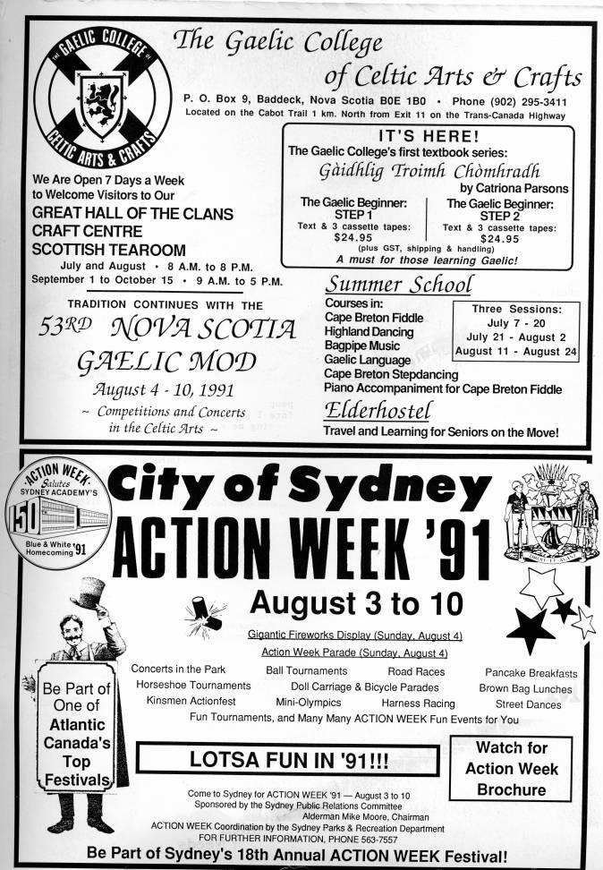 Published by Ronald Caplan on 1991/6/1 (139 reads)'ftt QaeCic CoCCege of Cdtic Arts & Crafts p. O. Box 9, Baddeck, Nova Scotia BOE IBO • Phone (902) 295-3411 Located on the Cabot Trail 1 km. North from Exit 11 on the Trans-Canada Highway We Are Open 7 Days a Week to Welcome Visitors to Our GREAT HALL OF THE CLANS CRAFT CENTRE SCOTTISH TEAROOM July and August • 8 A.M. to 8 P.M. September 1 to October 15 • 9 A.M. to 5 P.M. TRADITION CONTINUES WITH THE 53'' 'jloVAsc(yriA QA'LLIC MOT) August 4 ' 10,1991 - Competitions and Concerts in the Cdtic Rrts - IT'S HERE! The Gaelic College's first textbook series: QaicCaCig nsoimfi Cfibmhradh by Catriona Parsons The Gaelic Beginner: STEP1 Text & 3 cassette tapes: $24.95 The Gaelic Beginner: STEP 2 Text & 3 cassette tapes: $24.95 (plus GST, shipping & handling) A must for those learning Gaelic! Summer ScHooC Three Sessions: July 7 - 20 July 21 - August 2 August 11 - August 24 Courses in: Cape Breton Fiddle Highland Dancing Bagpipe Music Gaelic Language Cape Breton Stepdancing Piano Accompaniment for Cape Breton Fiddle "ElcCerfiosuC Travel and Learning for Seniors on the Move! jCity of Sydney ACTION WEEK '91 ??,' August 3 to 10 /'>| Gigantic Fireworks Display (Sunday. August 4) Action Week Parade (Sunday. August 4) Concerts in the Park Ball Tournaments Road Races Horseshoe Tournaments Doll Carriage & Bicycle Parades Kinsmen Actionfest Mini-Olympics Harness Racing Be Part of One of Atlantic Canada's Top Festivals It Pancake Breakfasts Brown Bag Lunches Street Dances Fun Tournaments, and Many Many ACTION WEEK Fun Events for You L0TSAFUNIN'91!!! Come to Sydney for ACTION WEEK '91 • August 3 to 10 Sponsored by the Sydney Public Relations Committee Alderman Mike Moore, Chairman ACTION WEEK Coordination by the Sydney Parks & Recreation Department FOR FURTHER INFORMATION, PHONE 563-7557 Watch for Action Week Brochure Be Part of Sydney's 18th Annual ACTION WEEK Festival!