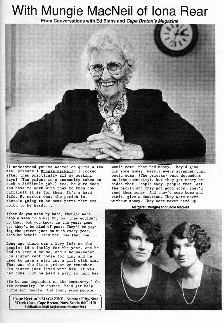 With Mungie MacNeil of lona Rear From Conversations with Ed Binns and Cape Breton's Magazine (I understand you've waited on quite a few men--priests.) Mungie MacNeil: I looked after them practically all my working days! (The priest in a community takes on such a difficult job.) Yes, he sure does. You have to work with them to know how difficult it is for them. It's a hard life. No matter what the parish is, there's going to be some parts that are going to be hard.... (What do you mean by hard, though? Were people mean to him?) Oh, no, they wouldn't do that. But you know, in the years gone by, they'd be kind of poor. They'd be pay? ing the priest just so much every year, each household. It's not like that now.... Long ago there was a levy left on the people: $6 a family for the year. And he had to keep a house, and a housekeeper. His sister kept house for him, and he used to have a girl in, a girl with him. That was the first priest we remember. His sister just lived with him; it was her home. But he paid a girl to help her. (So he was dependent on the community.) On the community. Of course, he'd get help, different people. And then, some people would come, that had money. They'd give him some money. Nearly every stranger that would come. (The priests) were dependent on (the community), but they got money be? sides that. People away, people that left the parish and they got good jobs, they'd send them money. And they'd come home and visit, give a donation. They were never without money. They were never hard up. Margket (Mungie) and Sadie MacNeil Cape Breton's MAGAZINE • Number Fifty-Nine Wreck Cove, Cape Breton, Nova Scotia BOC IHO Publications Mail Registration Number 3014